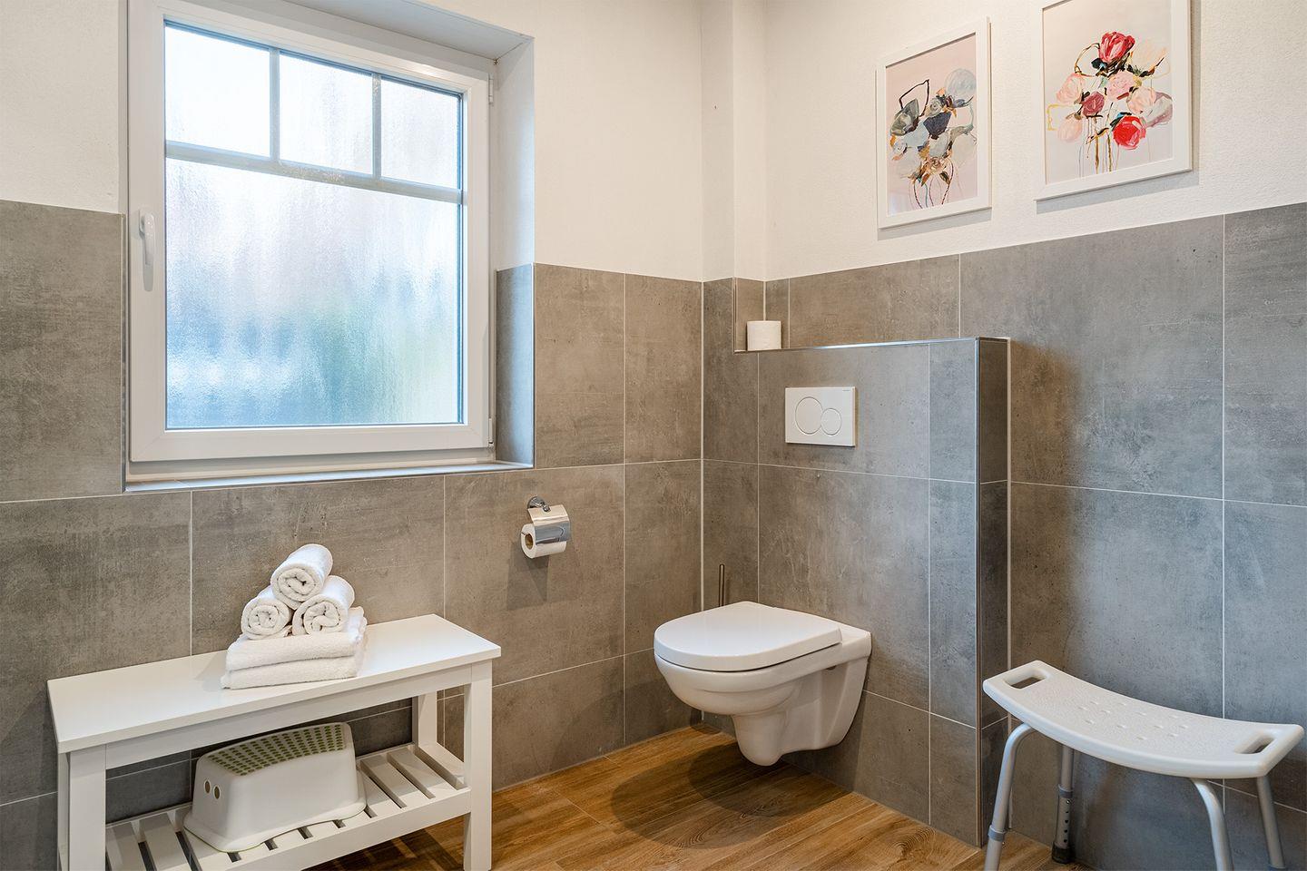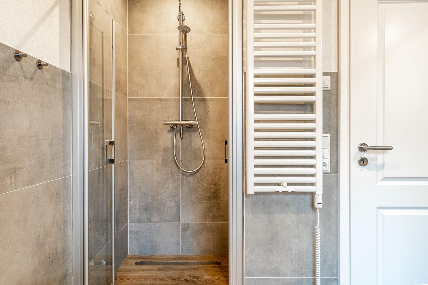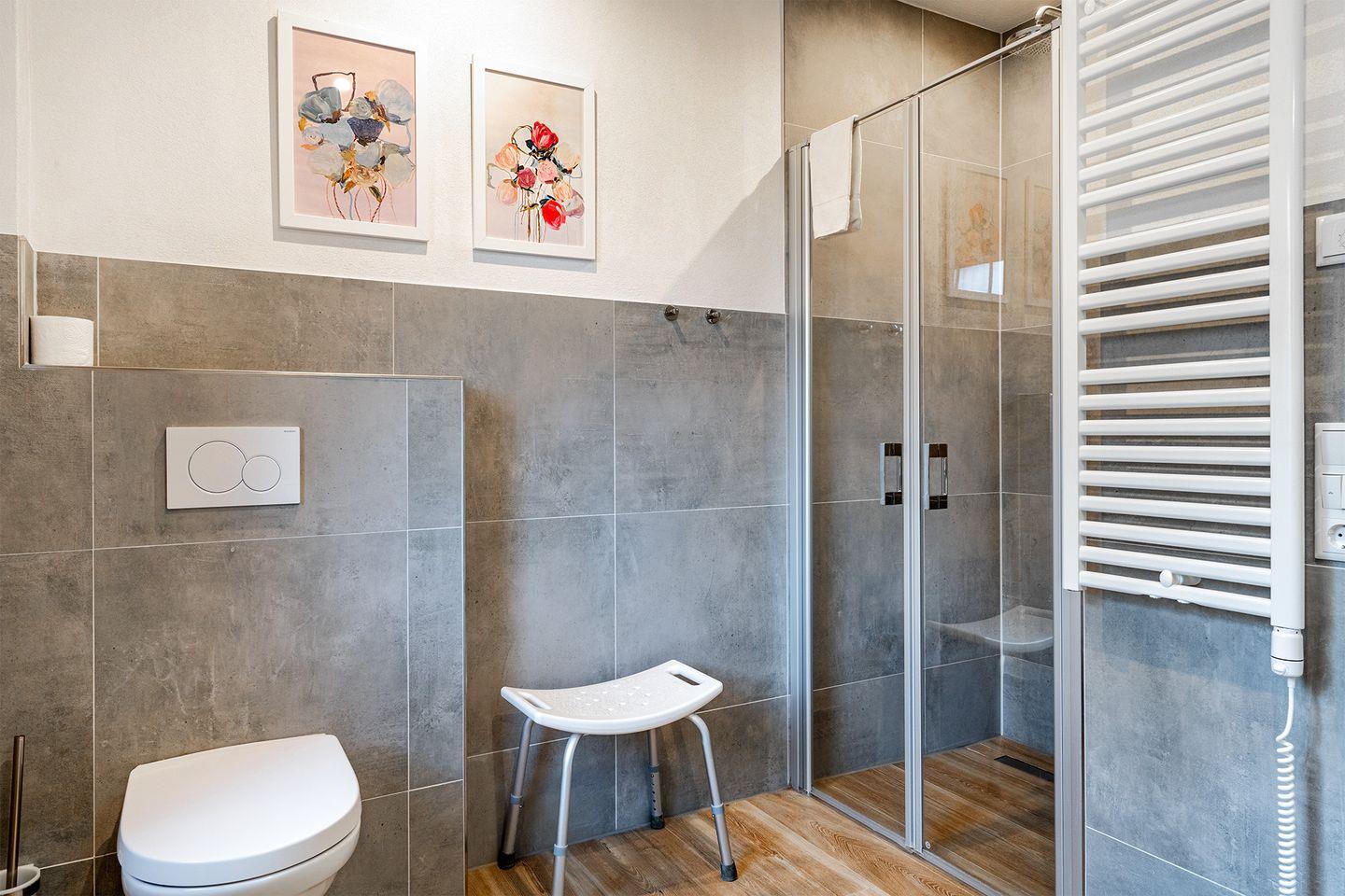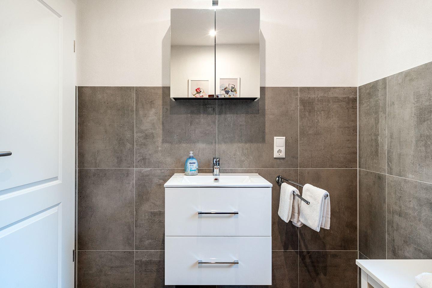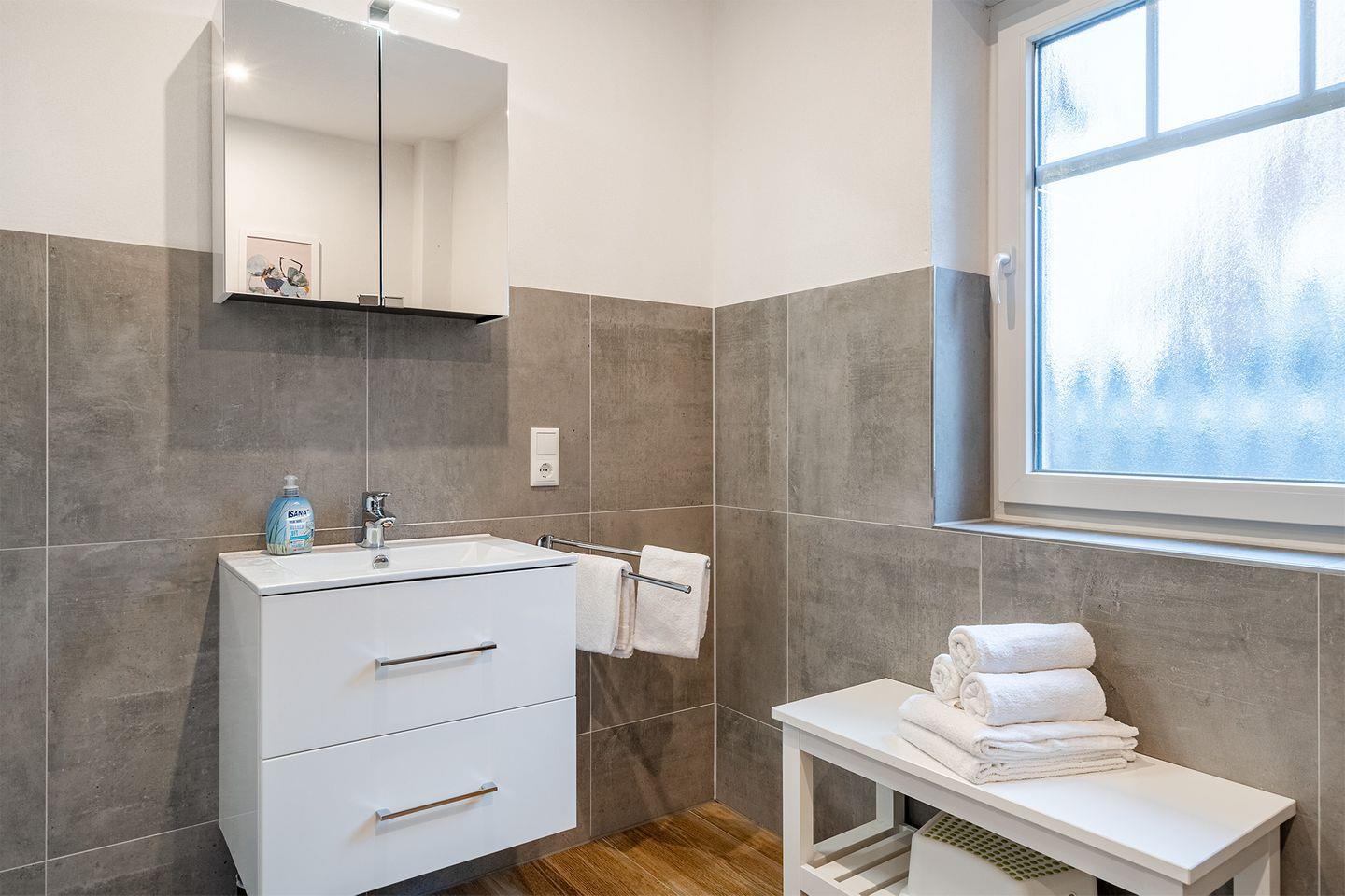 Das moderne Bad ist mit einer bodengleichen begehbaren Dusche ausgestattet und bietet alles, was Sie brauchen, um sich in Ruhe frisch zu machen.