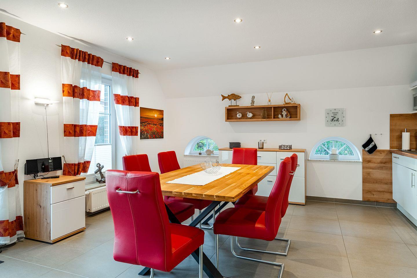 Der offene Wohn-Essbereich mit einer modernen Küche lädt dazu ein, gemeinsam zu kochen und zu genießen. Die großzügigen Fensterfronten sorgen für eine helle und freundliche Atmosphäre, die zum Verweilen einlädt.
