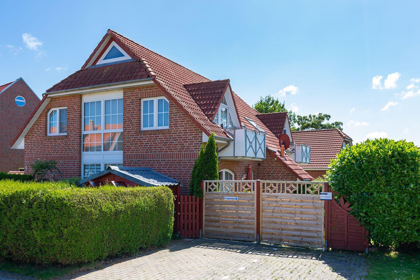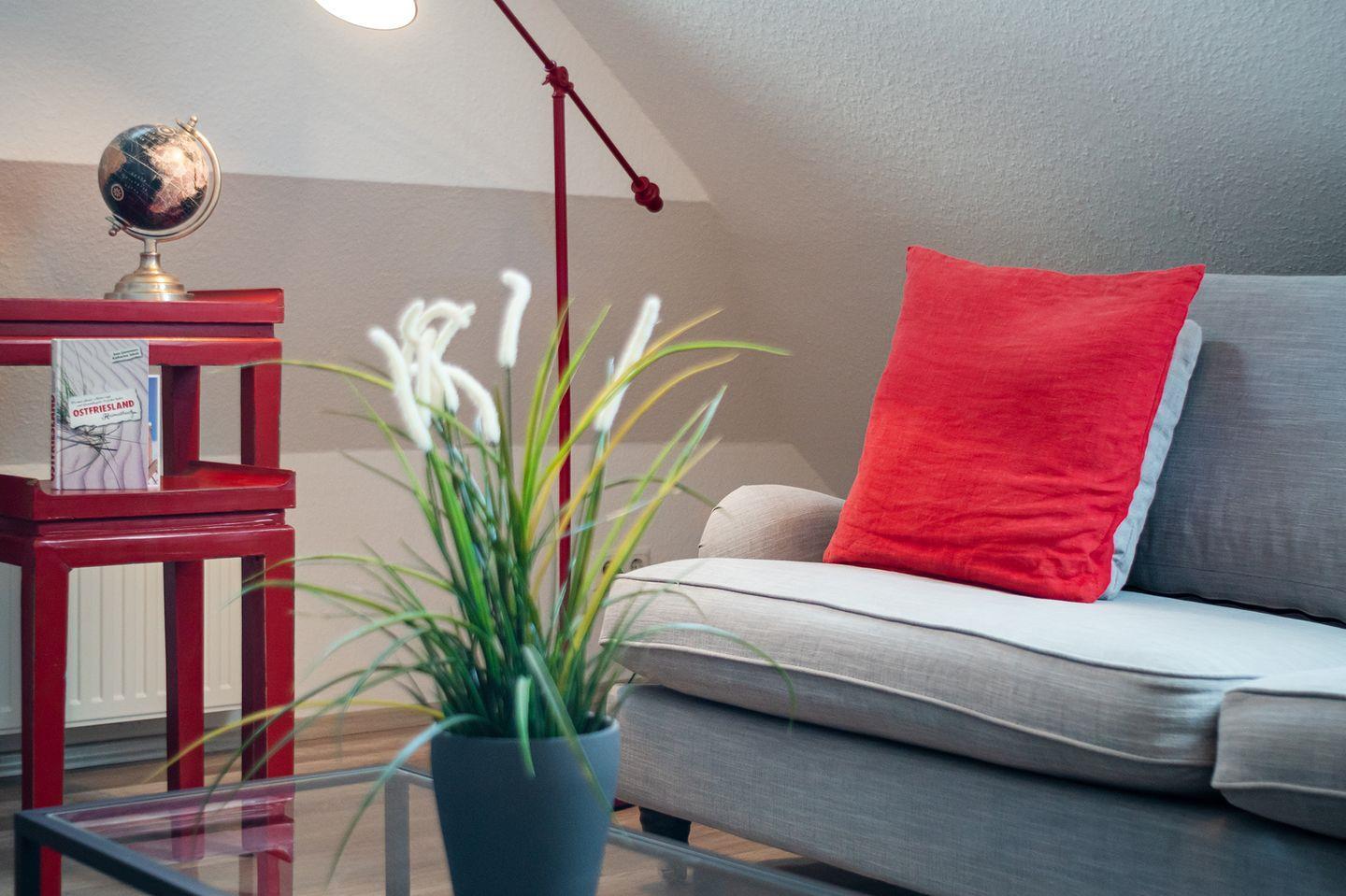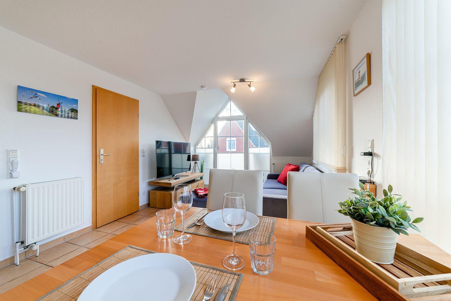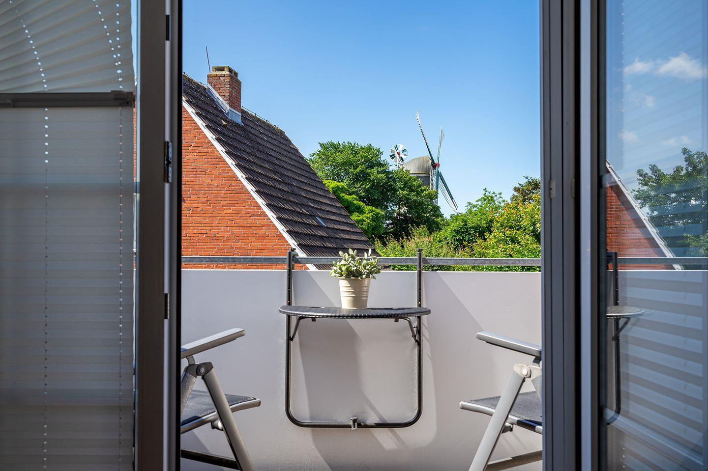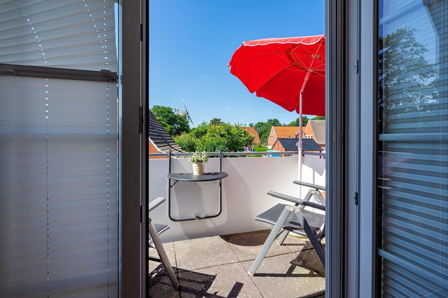 Die Ferienwohnung Mühlenblick 05 in Greetsiel bietet komfortables Wohnen mit Balkon und Blick auf die Zwillingsmühlen.