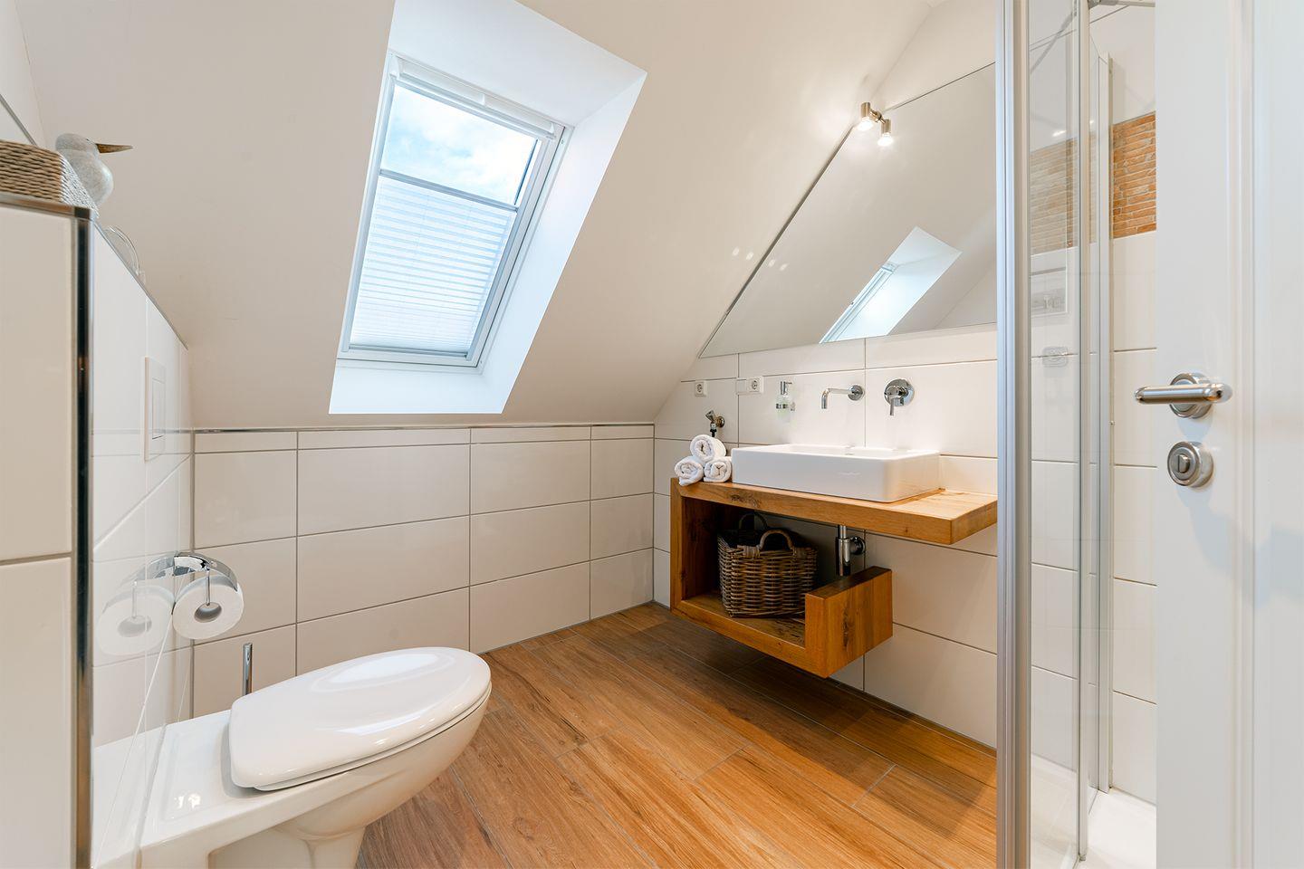 Die Ferienwohnung bietet einen Wohnraum mit voll ausgestatteter Küche, gemütlichem Essplatz und einem hellen Sitzbereich. Das geschmackvoll eingerichtete Duschbad und der geschützte Balkon mit Südwestlage laden zum Verweilen ein. Im Dachgeschoss befindet sich ein Studio mit Panoramafenster und zwei gemütlichen Kojen als zusätzliche Schlafmöglichkeit. Fußbodenheizung im gesamten Wohnbereich, Fliegengitter, ein PKW Stellplatz und eine abschließbare Fahrradbox machen es vollständig.