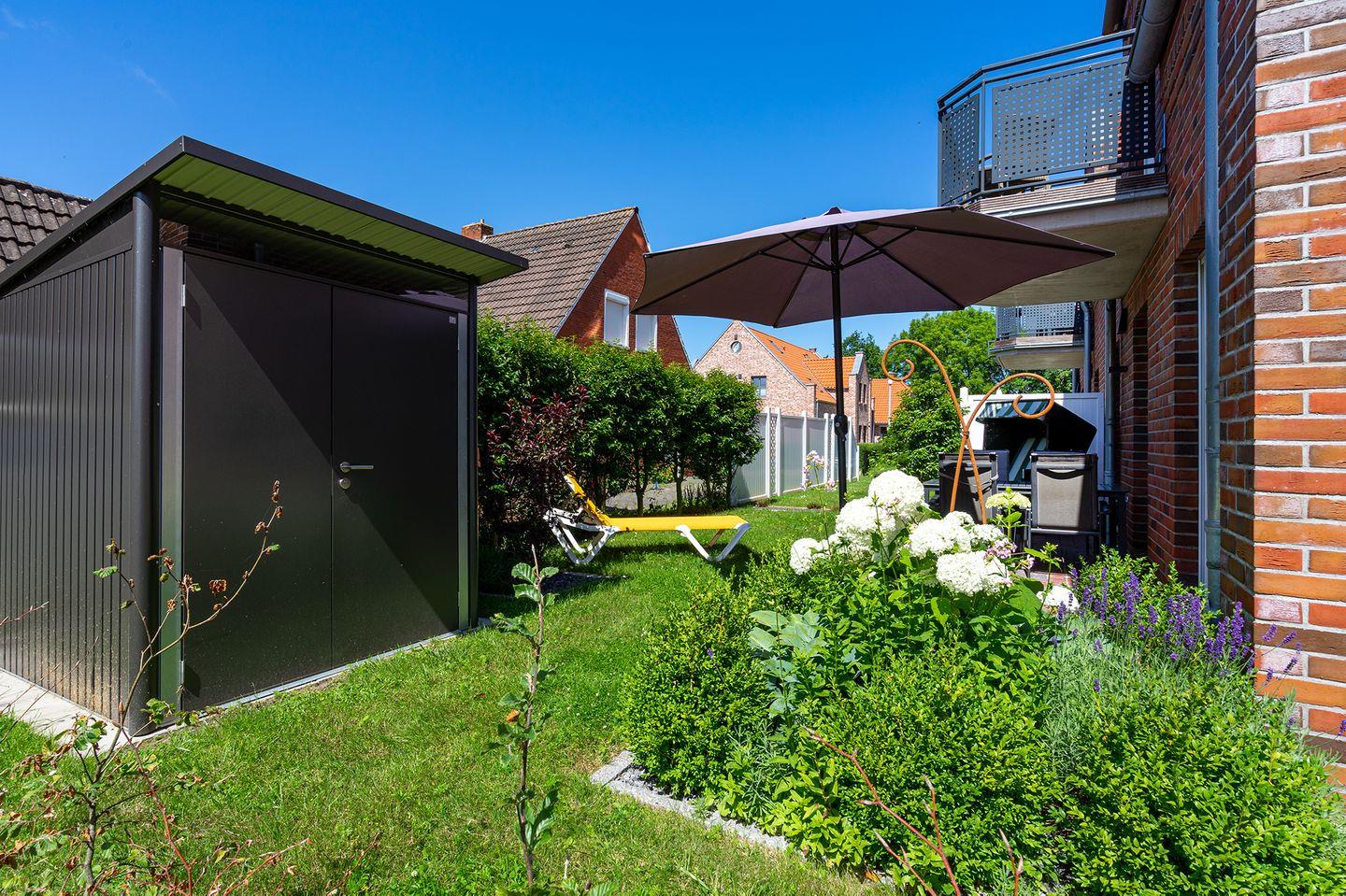 verbringen Sie auf der Südterrasse, welche mit Gartenmöbeln, einem Sonnenschirm