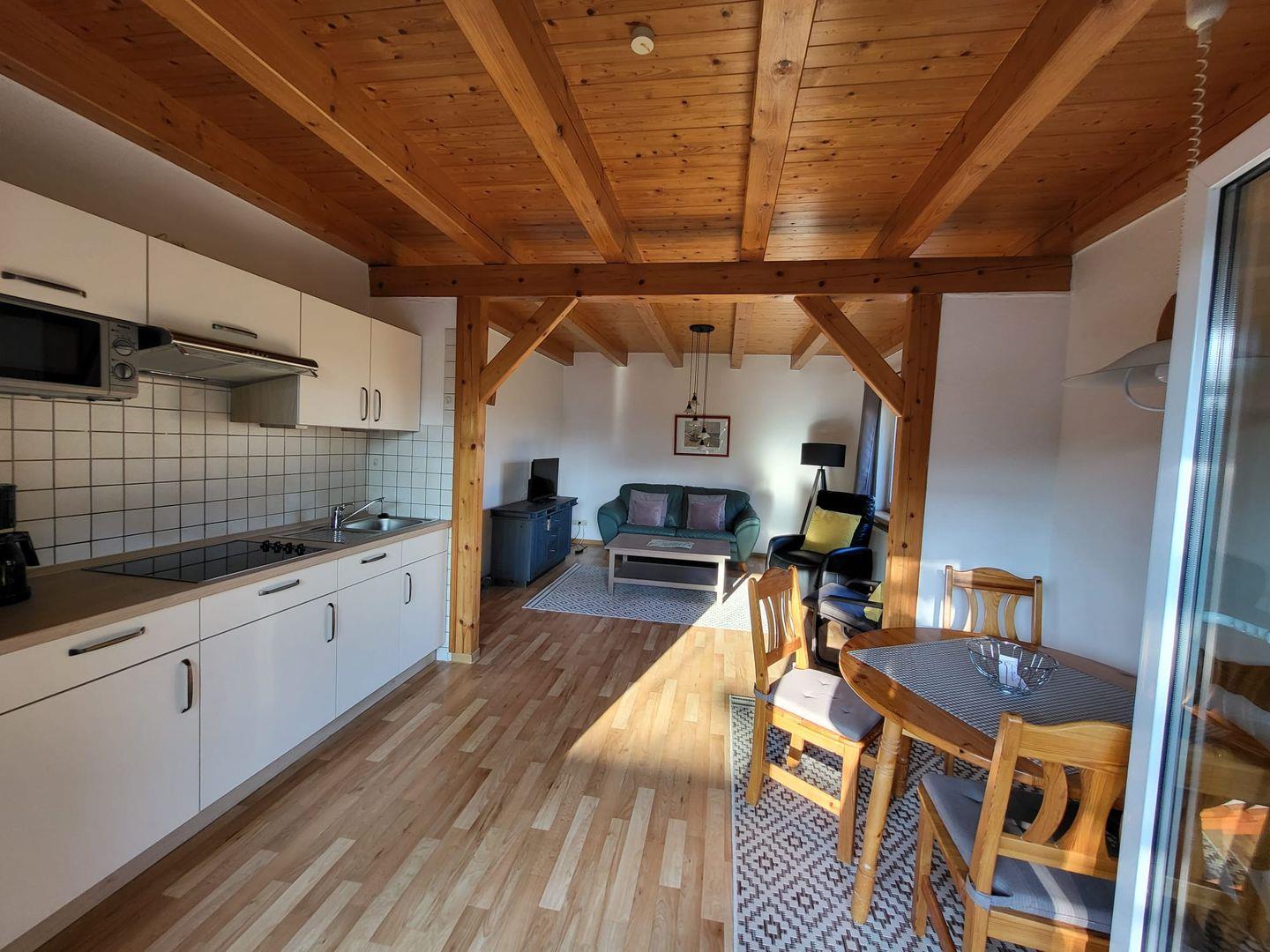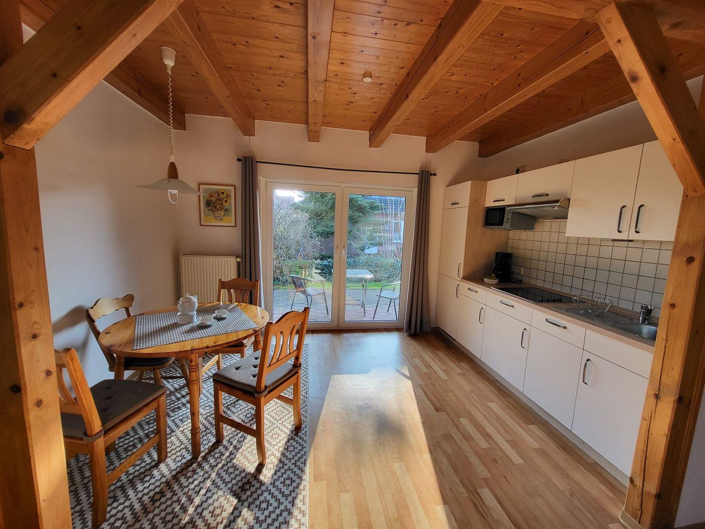 Vom Flur gelangen Sie in den Wohn-Essbereich mit Küche. Der großzügige Raum wirkt hell und freundlich. Die Balkenlage sorgt für Gemütlichkeit und Wärme. Genießen Sie auf dem Ledersofa und den 2 Sesseln gemütliche Abende, z. B. bei einem Fernsehabend mit einem Gläschen Wein. In der Küchenzeile steht alles bereit, um leckere Speisen zu kochen und dann am Esstisch mit der ganzen Familie oder mit Freunden zusammen zu essen. Klönen bei einer Tasse Ostfriesentee ist hier Pflicht. Vom Essbereich gelangen Sie auf die Terrasse, wo Sie die frische Nordseeluft und die Ruhe genießen können. Das Schlafzimmer im EG verfügt über ein Doppelbett und einen Kleiderschrank. Nebenan befindet sich das helle Duschbad. Ein kleiner Abstellraum rundet das Erdgeschoß ab. Die Treppe rauf finden Sie 2 weitere Schlafräume, eines mit Doppelbett und eines mit einem Einzelbett. Wenn Sie hier aus dem Fenster schauen, können Sie die Zwillingsmühlen entdecken. Auf dieser Etage finden Sie auch das zweite Duschbad. Alles Räume verfügen über Außenrollos. WLAN ist verfügbar! Ein Parkplatz gehört zum Haus. Das Ferienhaus Bella liegt sehr ruhig in einer Sackgasse. Es sind nur ca. 5 Gehminuten ins Zentrum.