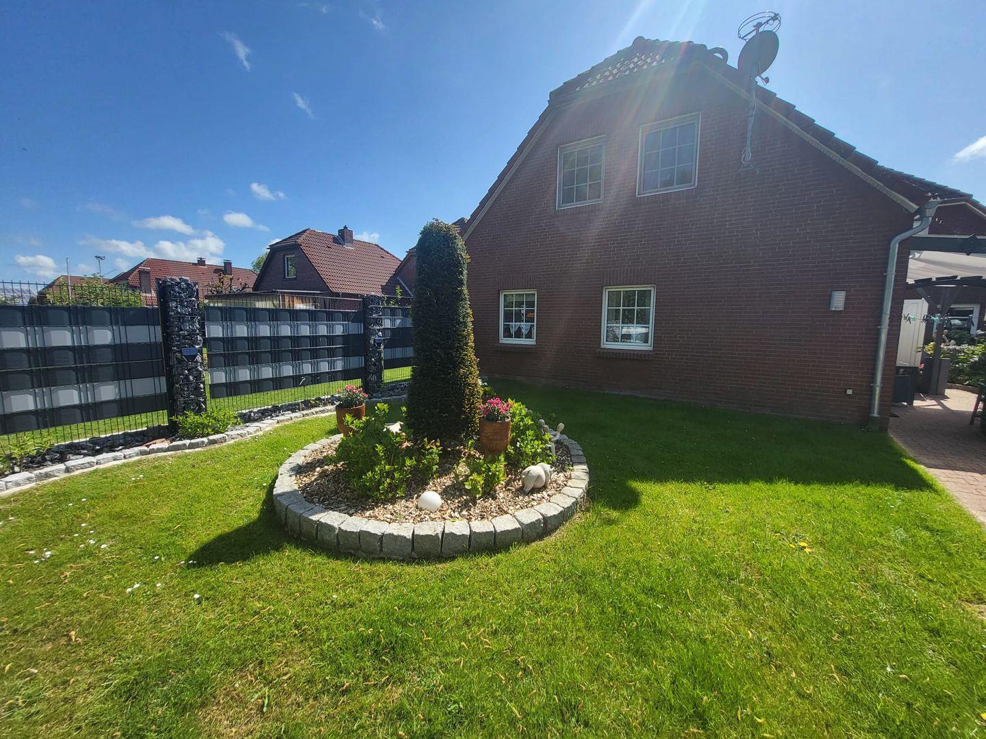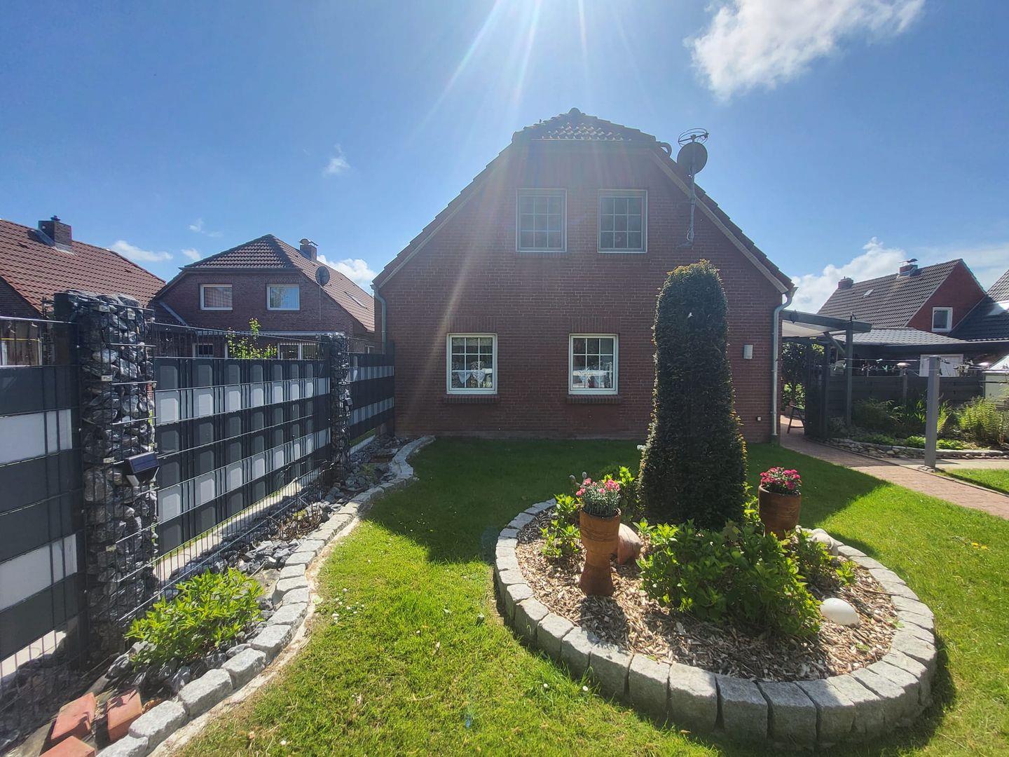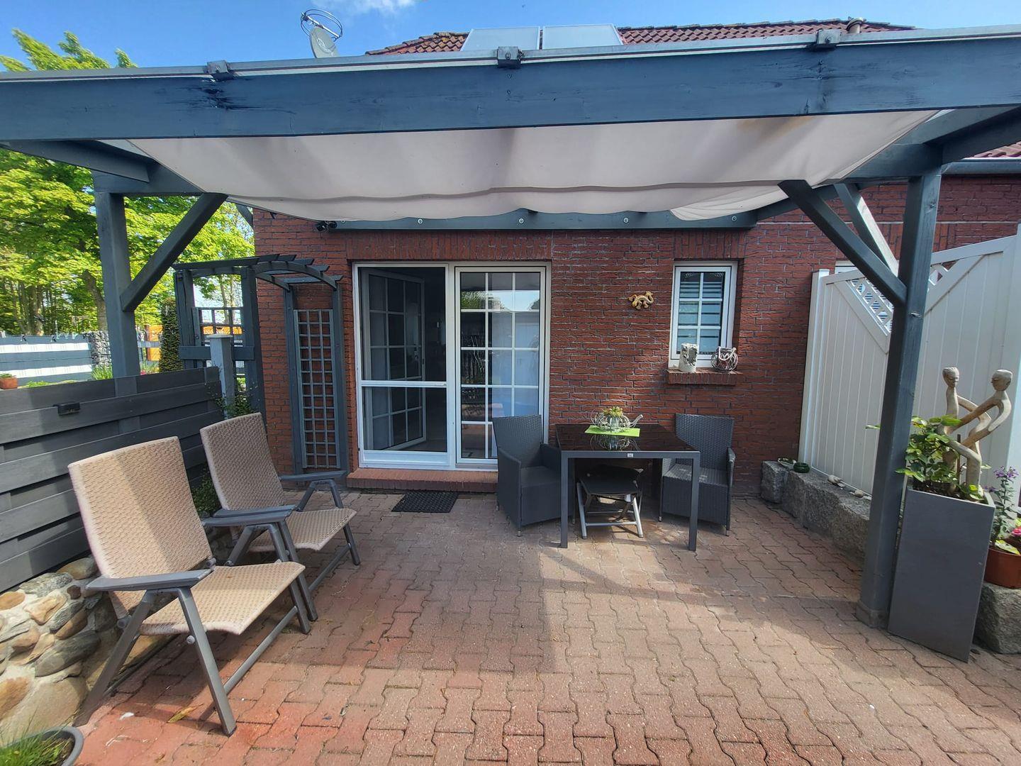 Besonders hervorzuheben ist die Terrasse mit Markise und Gartenmöbeln, die Ihnen eine stilvolle Möglichkeit bietet, auch im Freien zu speisen oder einfach die frische Nordseeluft zu genießen. Den Zugang haben Sie vom Wohnbereich. Der Garten ist ideal für entspannte Stunden. Hier finden Sie einen Grillplatz, um im Sommer gesellige Grillabende zu genießen. Sonnenliegen und ein Windschutz laden zum Entspannen und Sonne tanken ein.