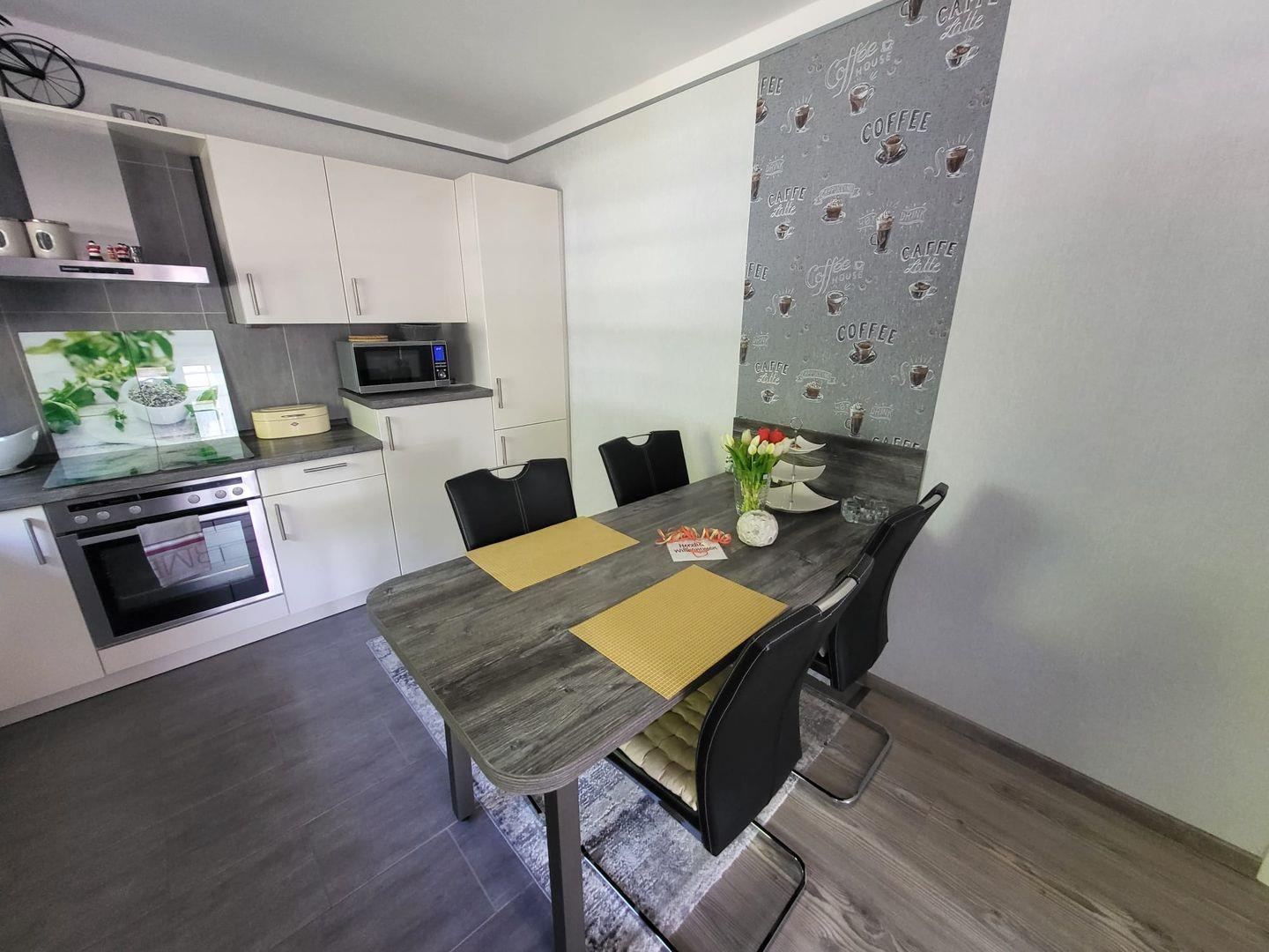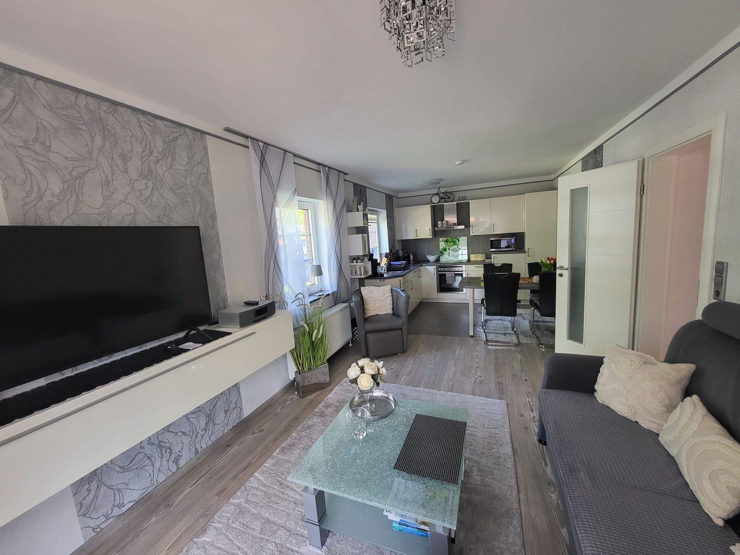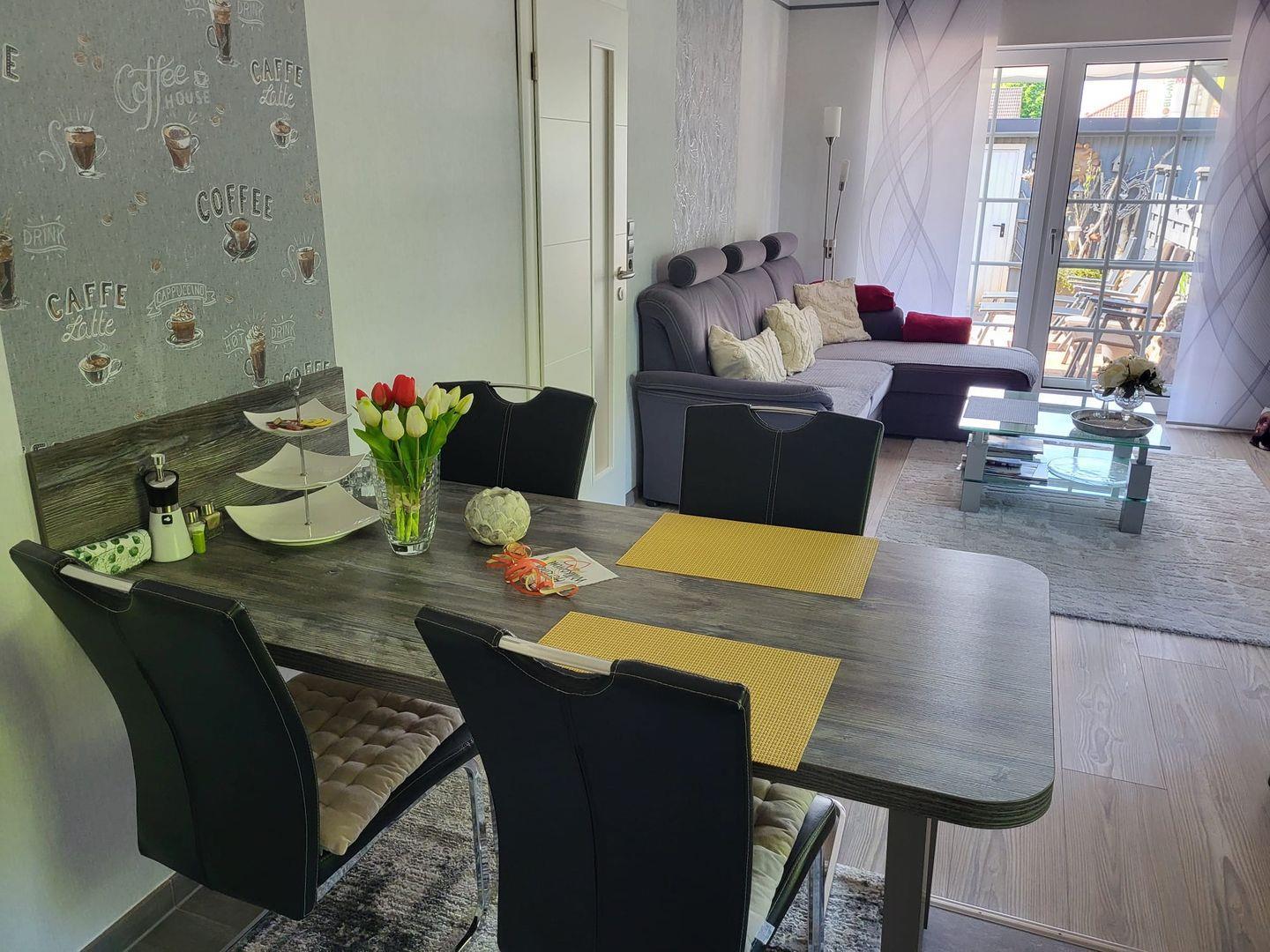 Kommen Sie herein! Vom Flur gelangen Sie in den großzügigen Wohn-/Essbereich. Genießen Sie entspannte Stunden auf dem gemütlichen Sofa mit einem Gläschen Wein und schauen einen schönen Film. Am Esstisch können zubereitete Speisen serviert werden. Die moderne helle Küche ist voll ausgestattet. Hier hat der Hobbykoch seine Freude. Ein Gäste-WC befindet sich ebenfalls im Erdgeschoss. In der oberen Etage erwarten Sie 2 helle Schlafzimmer, eines mit einem Doppelbett und eines mit 2 Einzelbetten. Die Eigentümer vermieten das Objekte nur an max. 2 Gäste! Das Bad ist eine kleine Wellnessoase. Mit heller Ausstattung überzeugt das Bad u. a. mit einer begehbaren großen Dusche und 2 Fenstern.