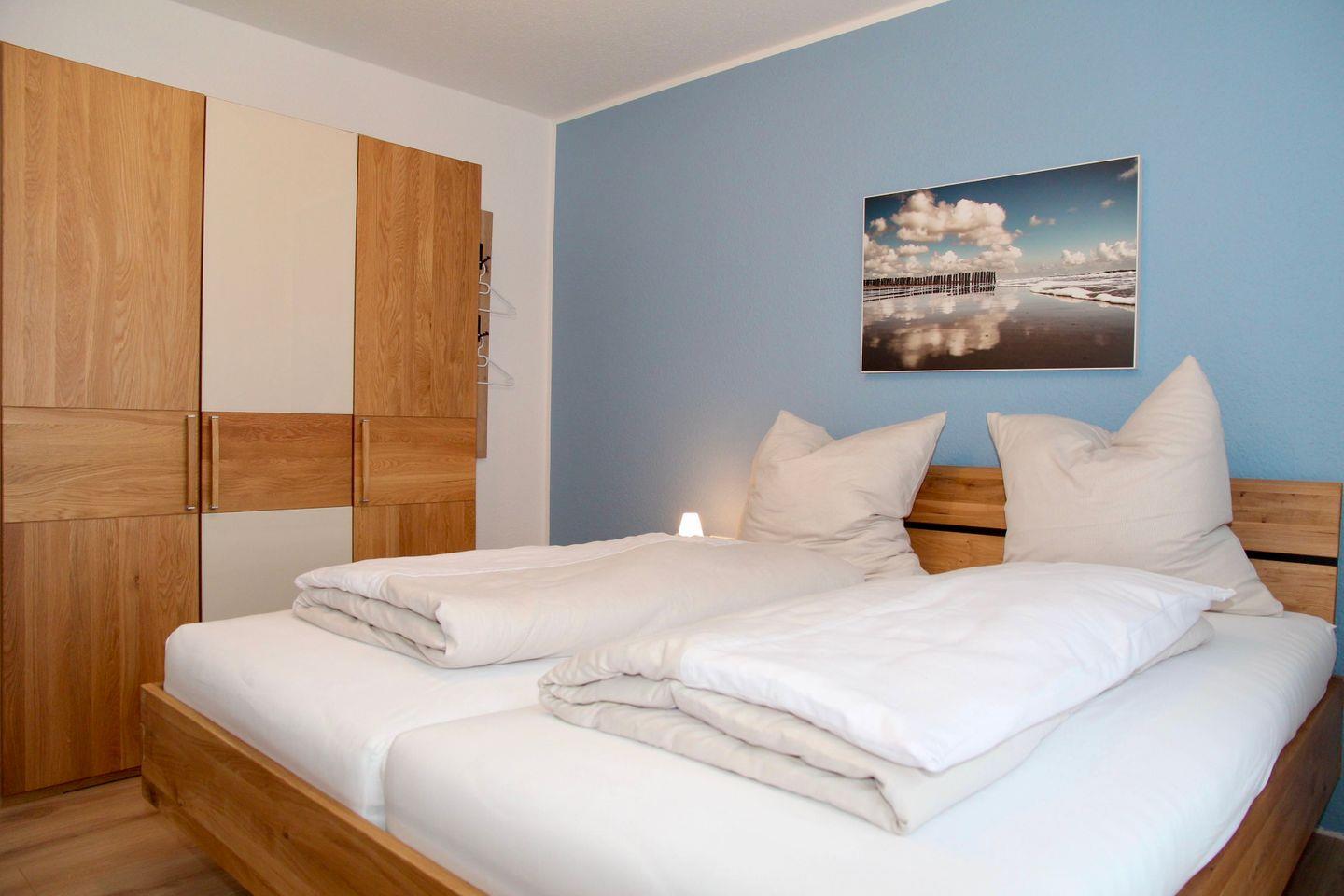 Das große Schlafzimmer ist mit Doppelbett (1,80m x 2 m, einzelne Matratzen), Kleiderschrank, Schreibtisch, Kofferablage und Steamer ausgestattet, Verdunklungsvorhänge sind vorhanden. Das helle Badezimmer verfügt über ebenerdige Dusche, Waschtisch, WC, Föhn und Handtuchheizkörper. Im Abstellraum finden Sie weiterhin Waschmaschine und Wäscheständer.