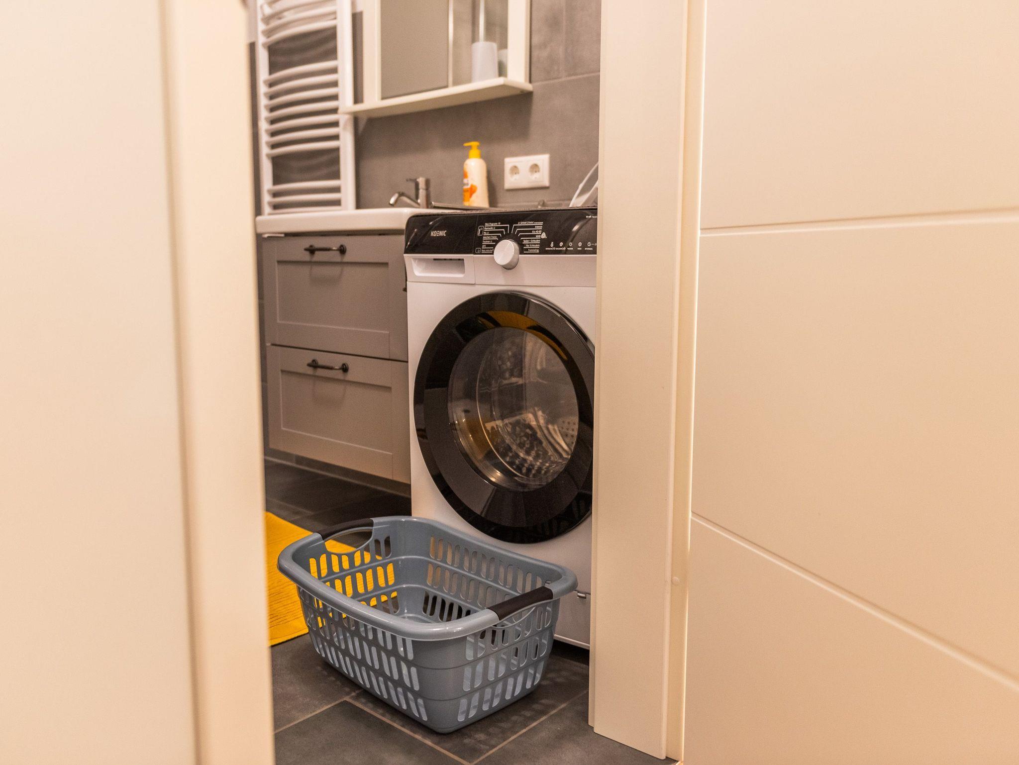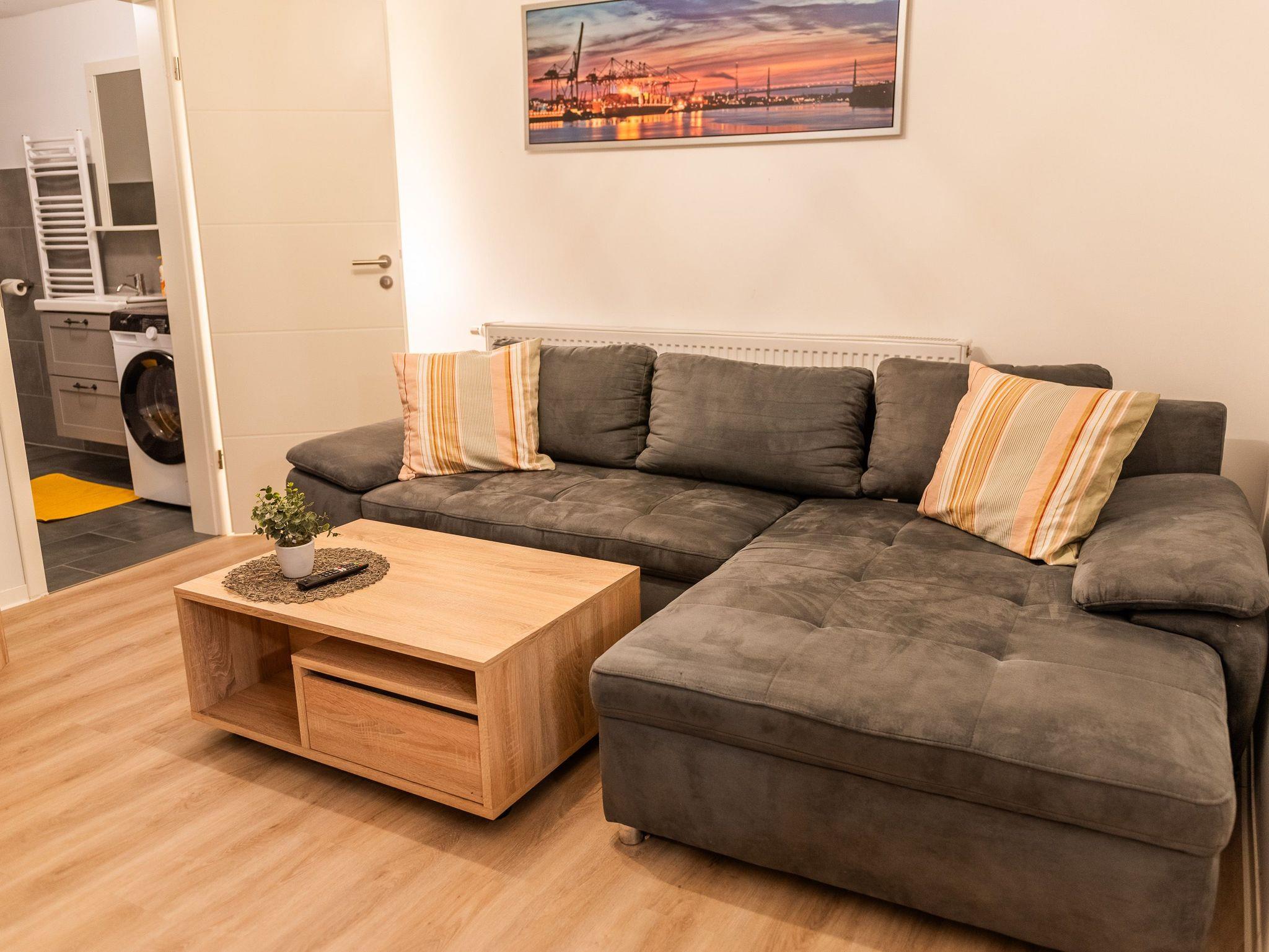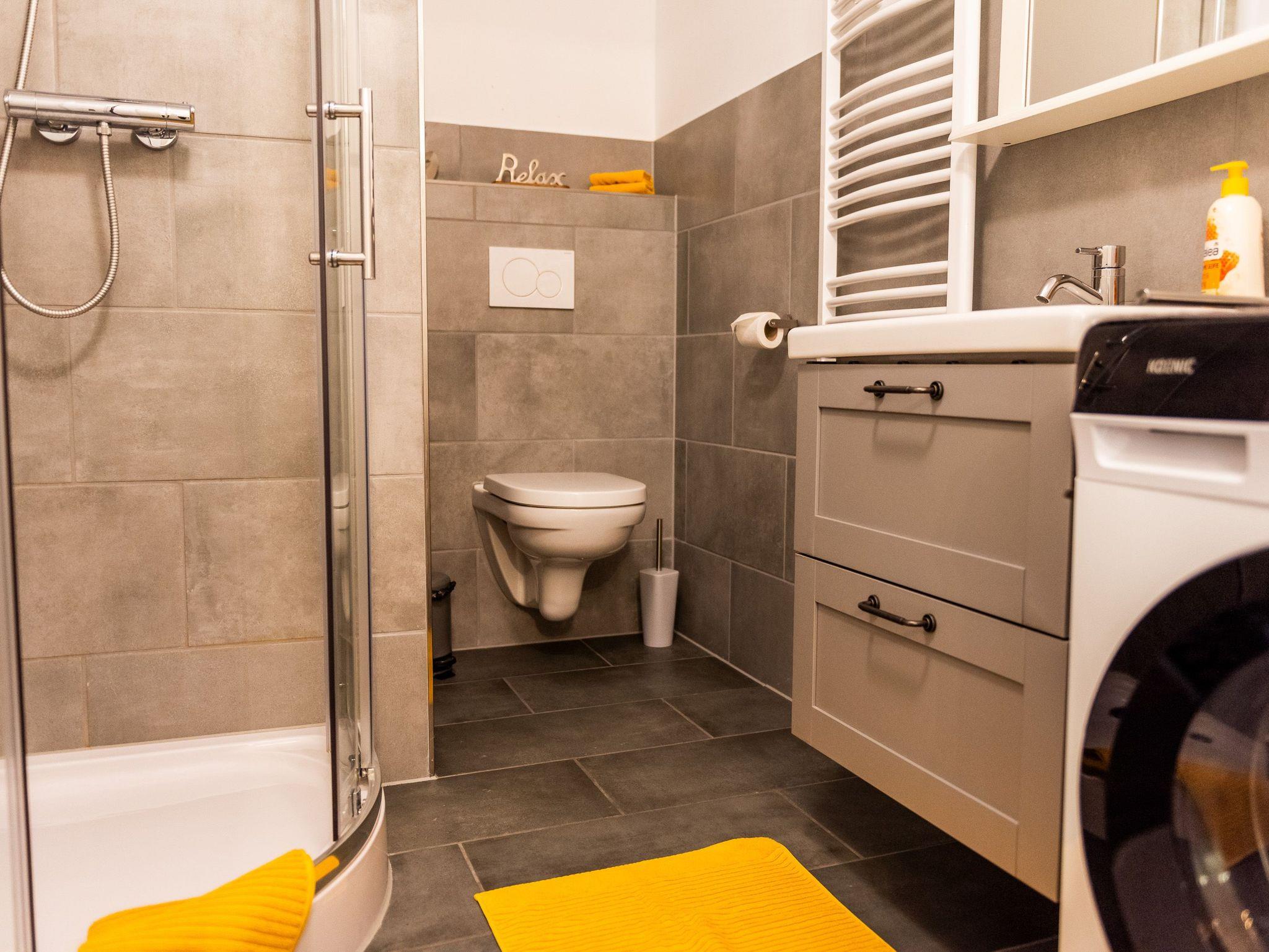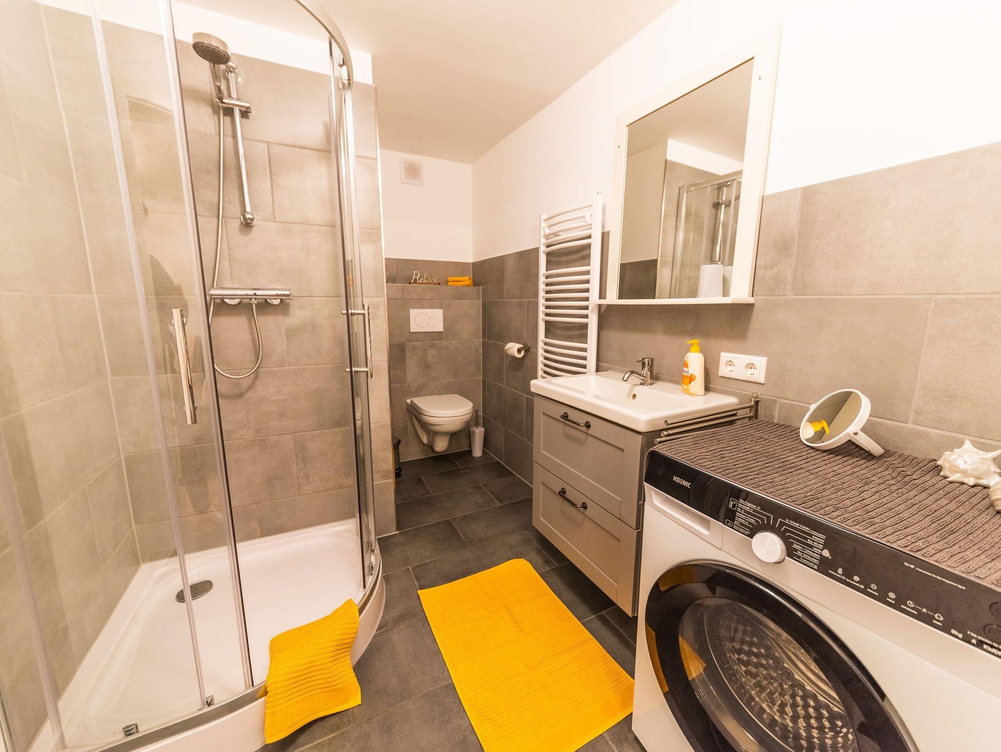 Das gemütliche Wohnzimmer bietet einen internetfähigen Fernseher sowie kostenloses W-Lan an. Im modernen Badezimmer steht eine großzügige Dusche mit einem Waschtrockner zur Verfügung.