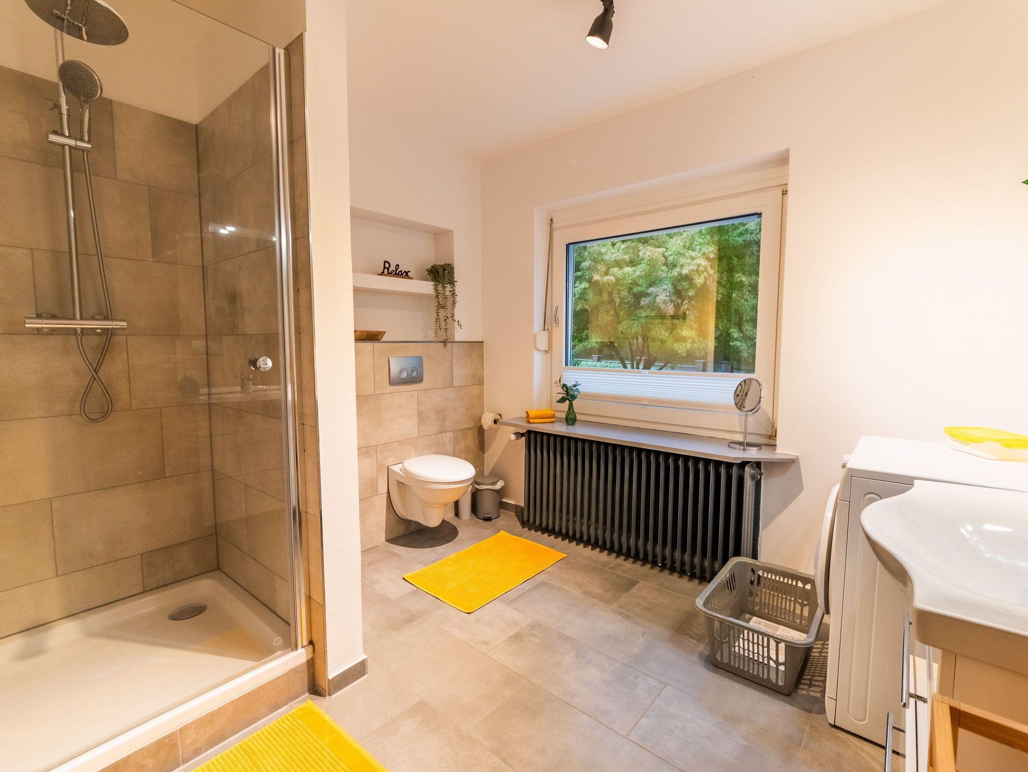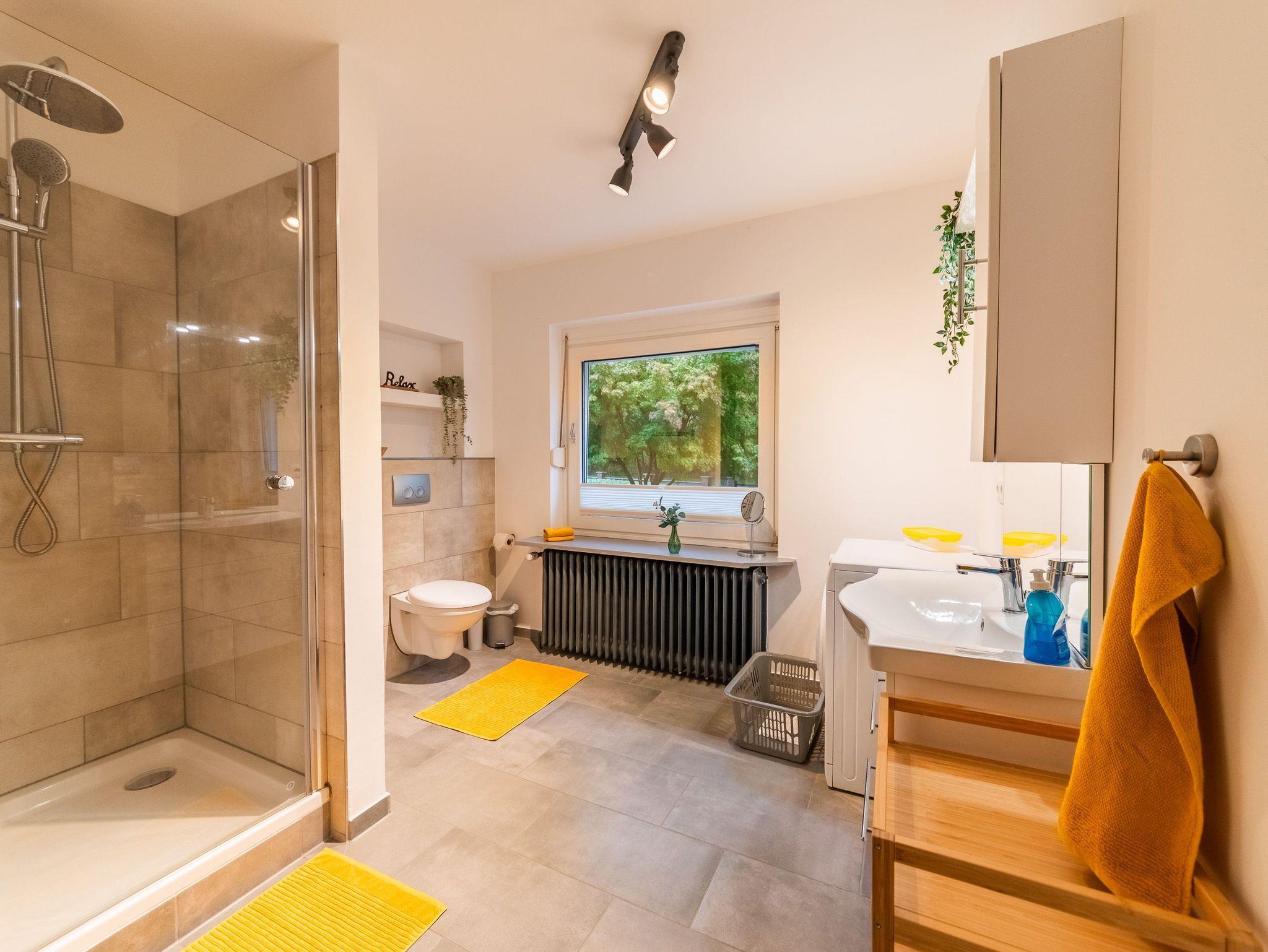 Im Untergeschoss befindet sich ein großes Schlafzimmer mit Doppelbett (180x200). Dort ist genügend Platz um ggf. ein Babyreisebett unter zu bringen. Außerdem sind auf dieser Etage zwei Badezimmer mit je einer Dusche ausgestattet. Selbstverständlich bietet diese Wohnung eine Waschmaschine sowie einen Trockner.