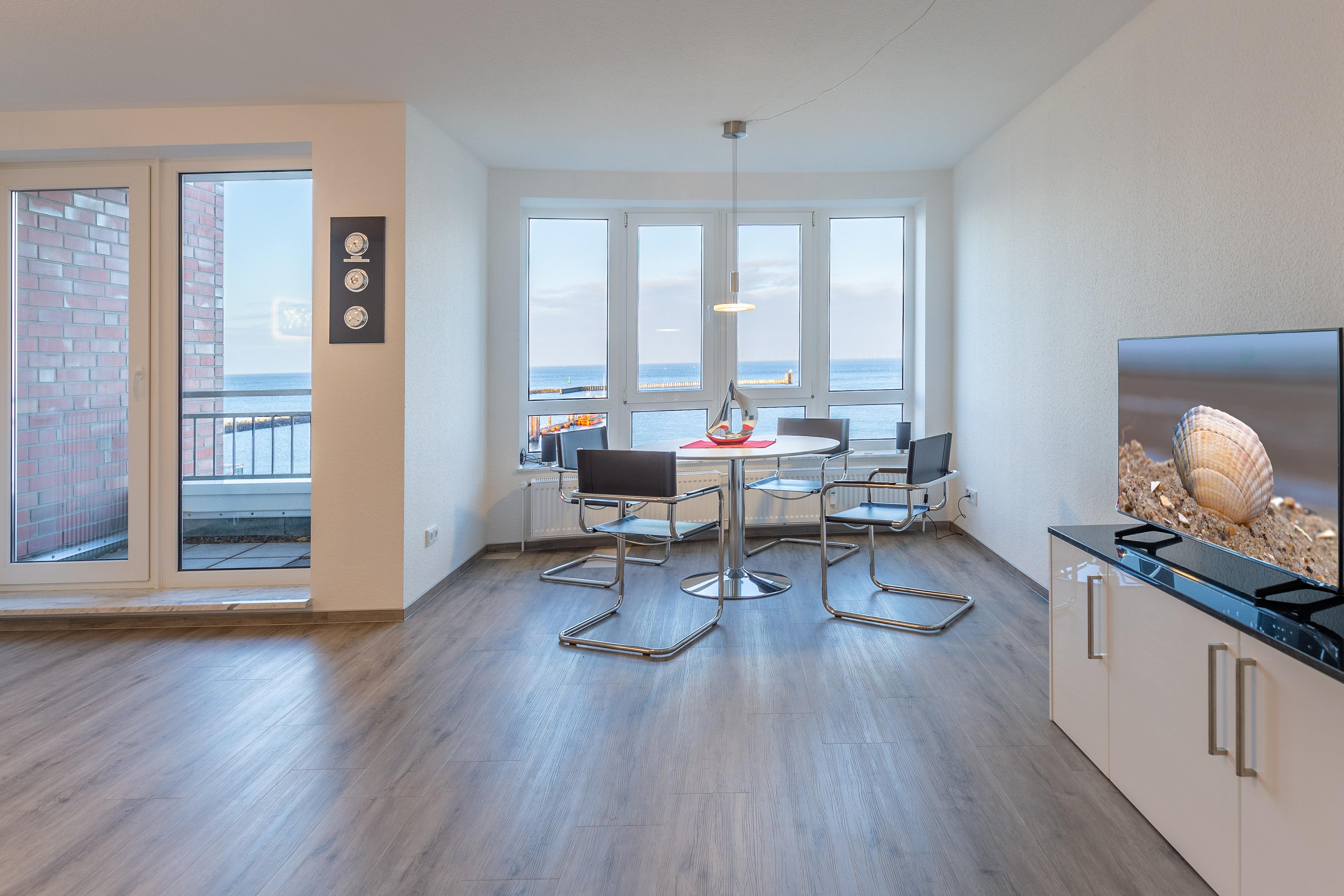 Moin, moin von der Waterkant! Ferienwohnung 27 im Haus Seeterrassen besticht durch eine moderne Ausstattung und einen traumhaften Blick auf den Weltschifffahrtsweg, die Elbe und den Fährhafen. Der Ausblick bietet Erholung und Erlebnis zugleich. Beobachten Sie Kreuzfahrtschiffe, Kutter und Großsegler direkt aus Ihrer komfortablen Ferienwohnung. Auf 70 m² bietet Ihnen die[nbsp] 2-Zimmer-Ferienwohnung mit separatem Schlafzimmer ausreichen Platz für 2 Personen.