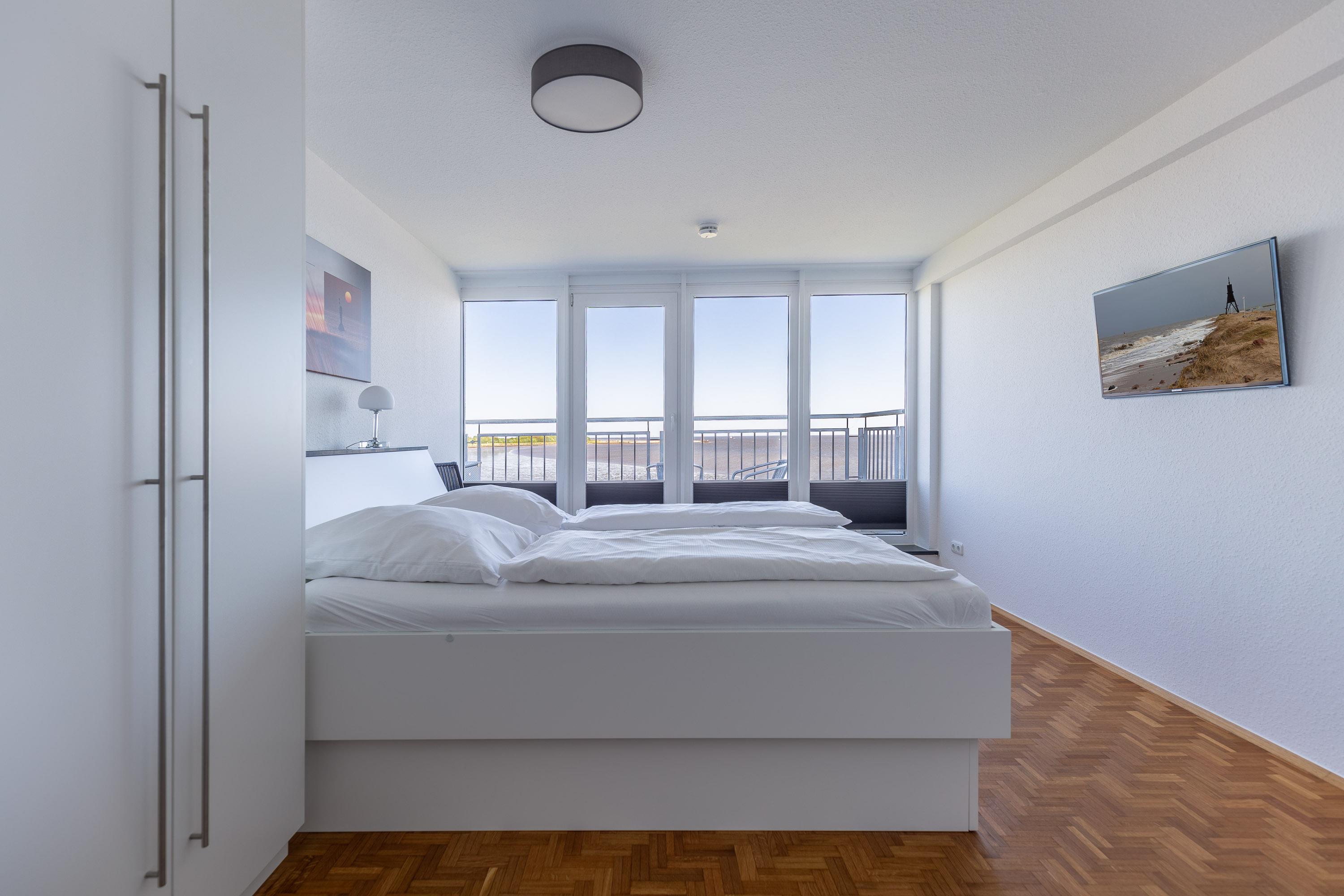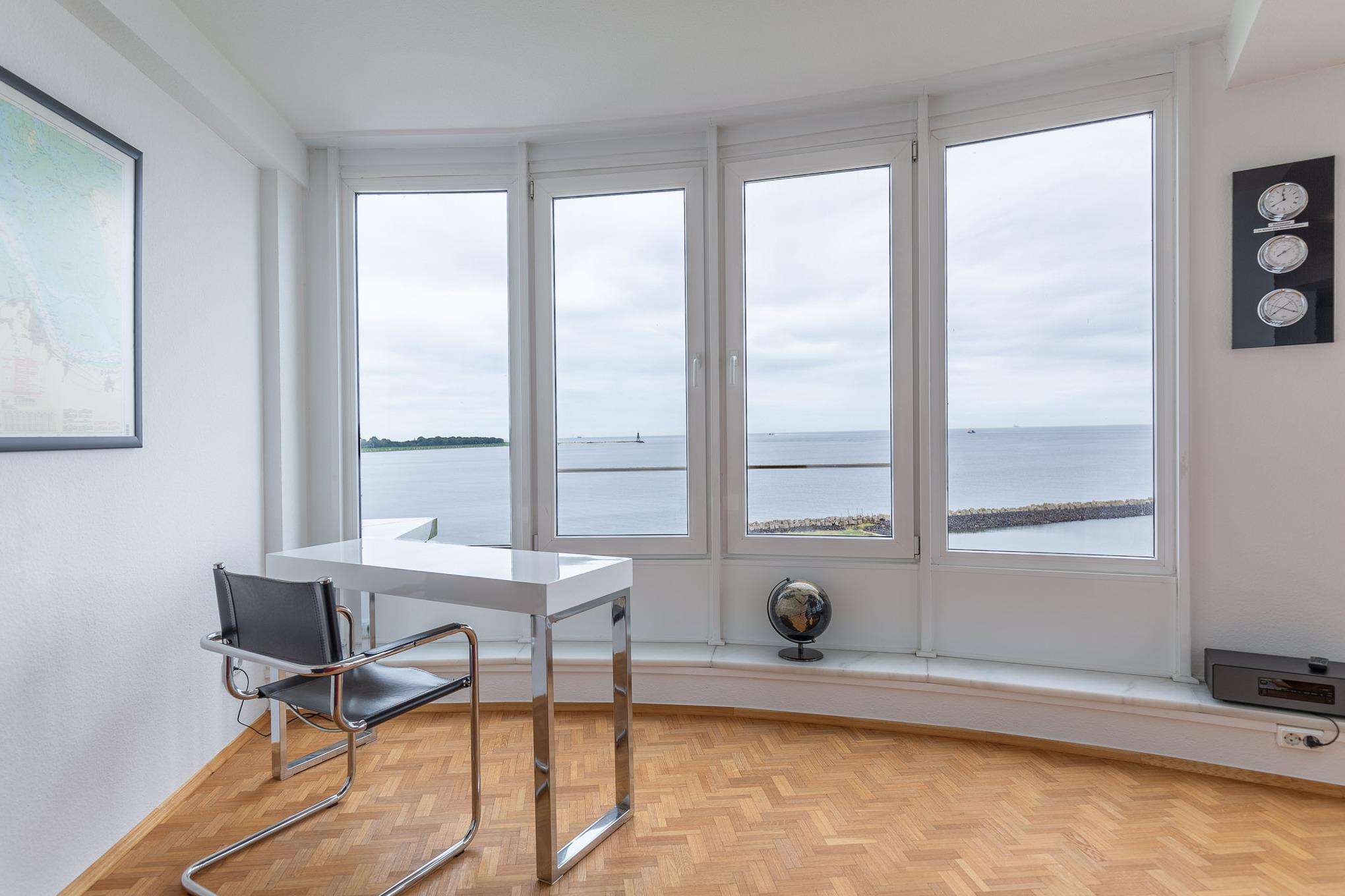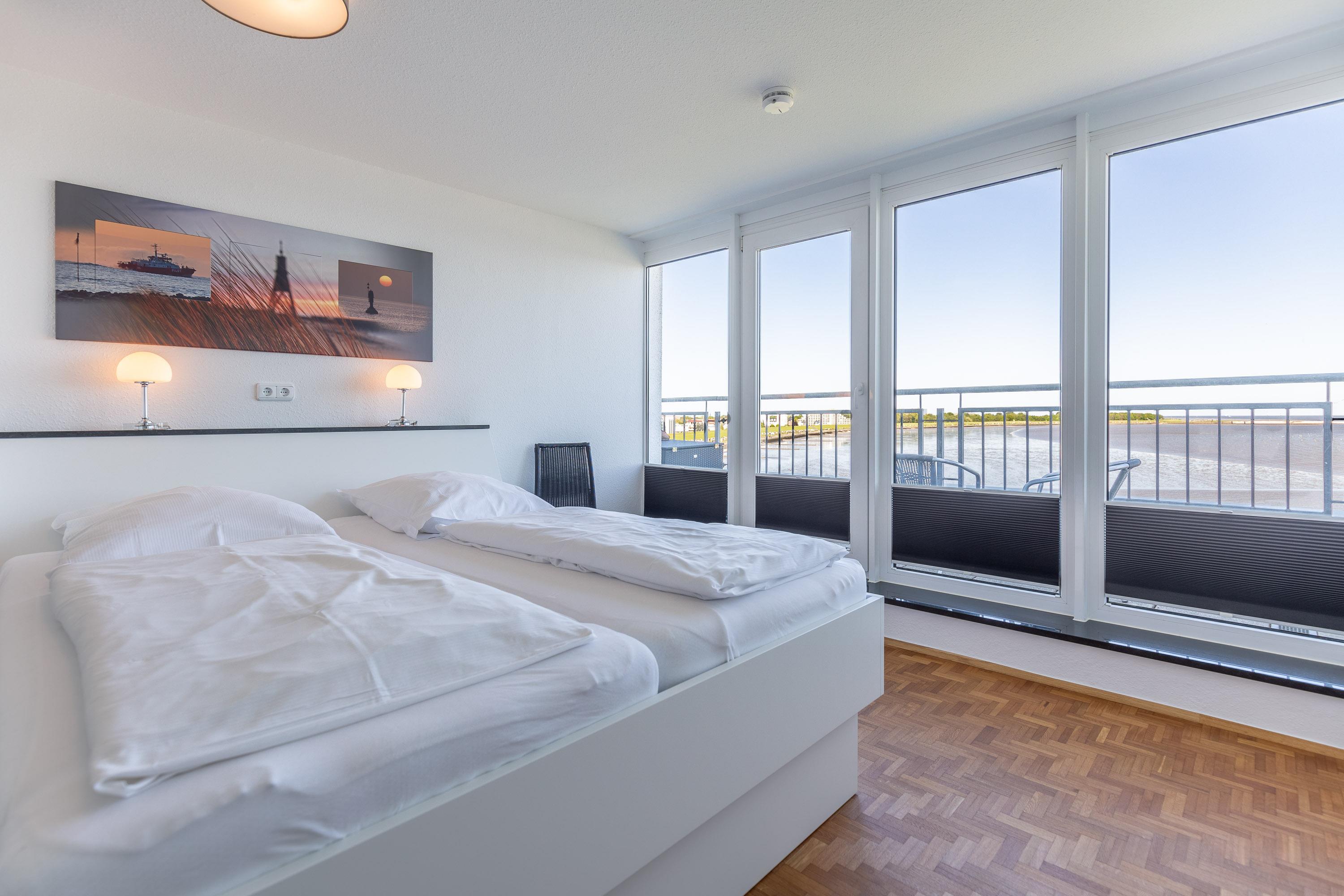 Der großzügige und lichtdurchflutete Wohnbereich besticht durch eine moderne und hochwertige Luxus-Ausstattung. Genießen Sie den Blick auf den Weltschifffahrtsweg, die Kugelbake und den Fährhafen. Der Ausblick bietet Erholung und Erlebnis zugleich. Auf 120 m² bietet Ihnen die 2-Zimmer-Ferienwohnung zwei separate Schlafzimmer. Ein Schlafzimmer mit Doppelbett in Komfortliegehöhe und weiteres Schlafzimmer mit zwei Einzelbetten. Die komfortablen Betten sorgen für einen erholsamen Schlaf. Neben dem Wohnbereich verfügt auch jedes Schlafzimmer über einen Fernseher. Auch von der separaten Küche mit Backofen, Geschirrspüler, Mikrowelle sowie Kühlschrank mit Gefrierfach genießen Sie den atemberaubenden Meerblick. Des Weiteren gehören zwei moderne Bäder mit Dusche und WC zum Standard dieser einzigartigen Ferienwohnung.