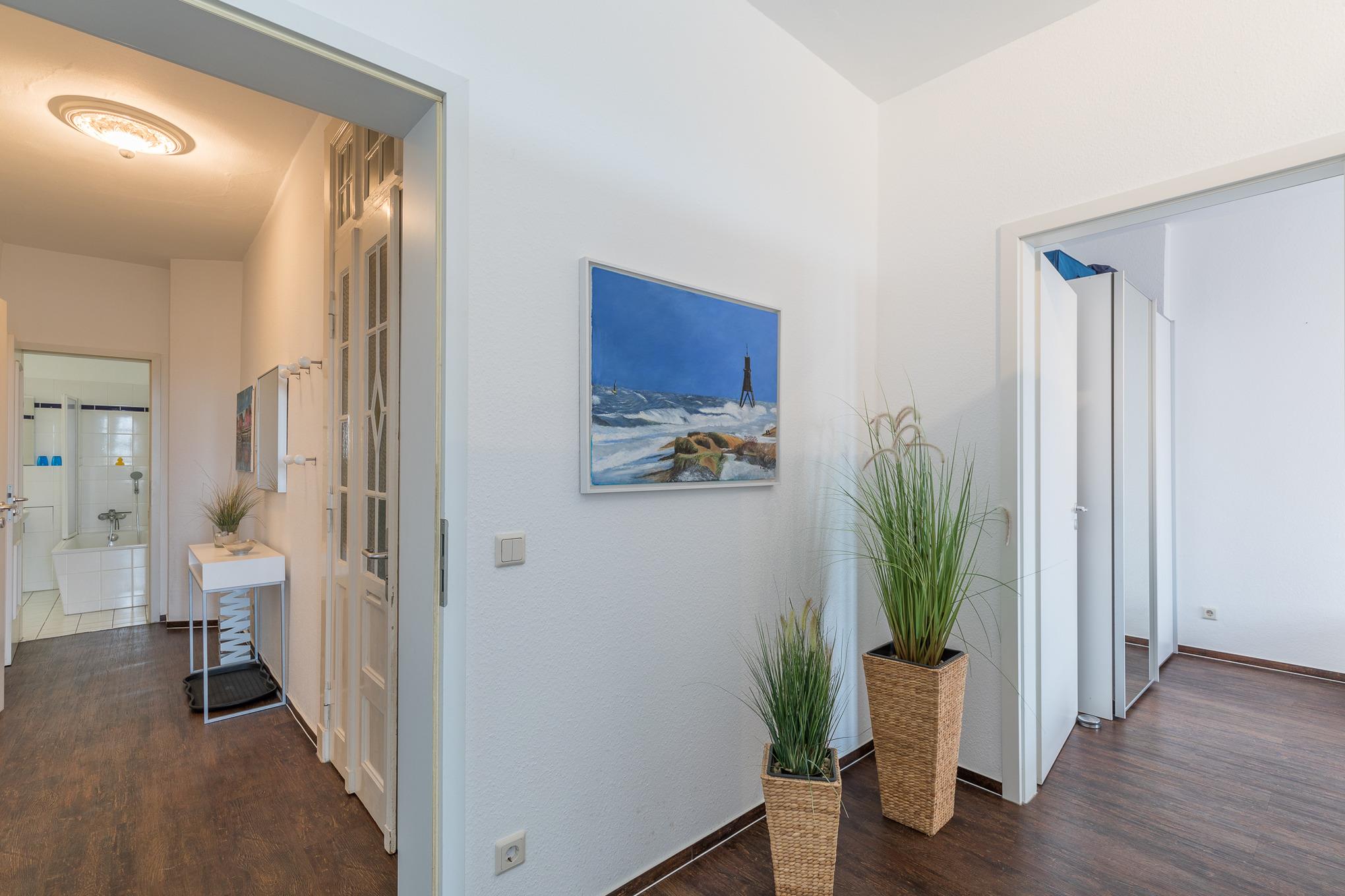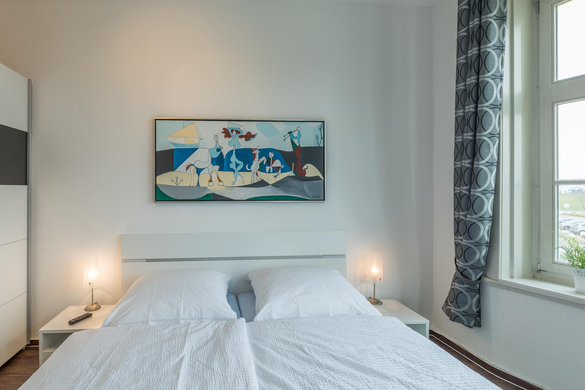 Die modern eingerichtete 3-Raum Wohnung (mit Teilseesicht und kleinem Balkon) mit einer Größe von ca. 80 m² Wohnfläche ist komplett bis zu 4 Personen ausgestattet. 1 Wohnzimmer[nbsp][nbsp]mit Essplatz, gemütlichem Sofa, TV, Stereoanlage und Zugang zum kleinen Balkon zur Seeseite, 1 Schlafzimmer mit Doppelbett und TV, 1 Schlafzimmer mit 2 Einzelbetten, separate große Küche (Cerankochfeld, Backofen, Mikrowelle, Kaffeemaschine und Wasserkocher) mit Essplatz, 1 Bad mit Badewanne und WC, Nichtraucherwohnung, keine Haustiere, PKW-Stellplatz direkt am Haus.