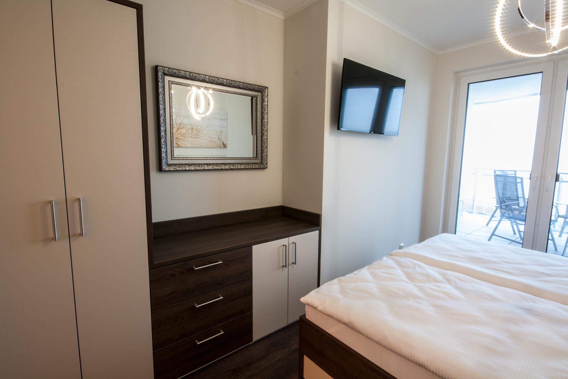 2 Schlafzimmer mit jeweils einem Doppelbett und TV, 1 Wohnzimmer mit Essplatz, moderne TV Anlage im Wohnzimmer, hochwertige Küche mit Induktionskochfeld + Backofen + Geschirrspüler und allem was zur Küche gehört, 1 Duschbad mit ebenerdiger Dusche und Tageslicht, 1 Duschbad, innenliegend, mit ebenerdiger Dusche, Fußbodenheizung in allen Räumen, 1 Abstellraum, 1 Balkon Richtung Norden mit Blick auf den Weltschifffahrtsweg, die Kugelbake und den Grünstrand, 1 Balkon Richtung Süd/West, Videosprechanlage, Rauchmelder in allen Räumen, 1 Garage am Haus mit Fernbedienung. Das Haus verfügt über einen Fahrstuhl.