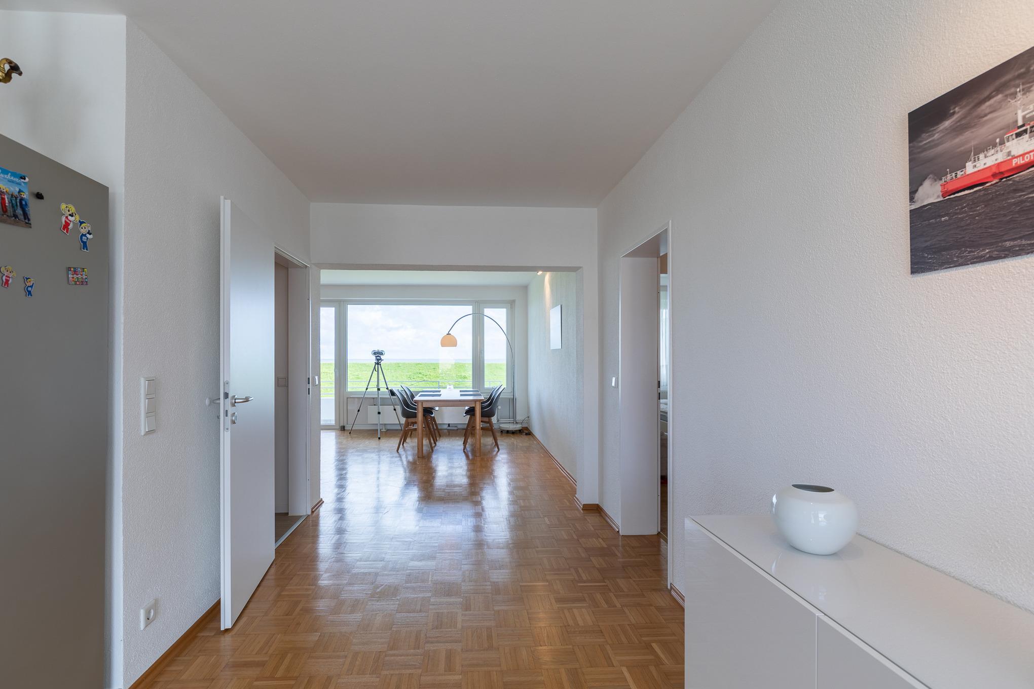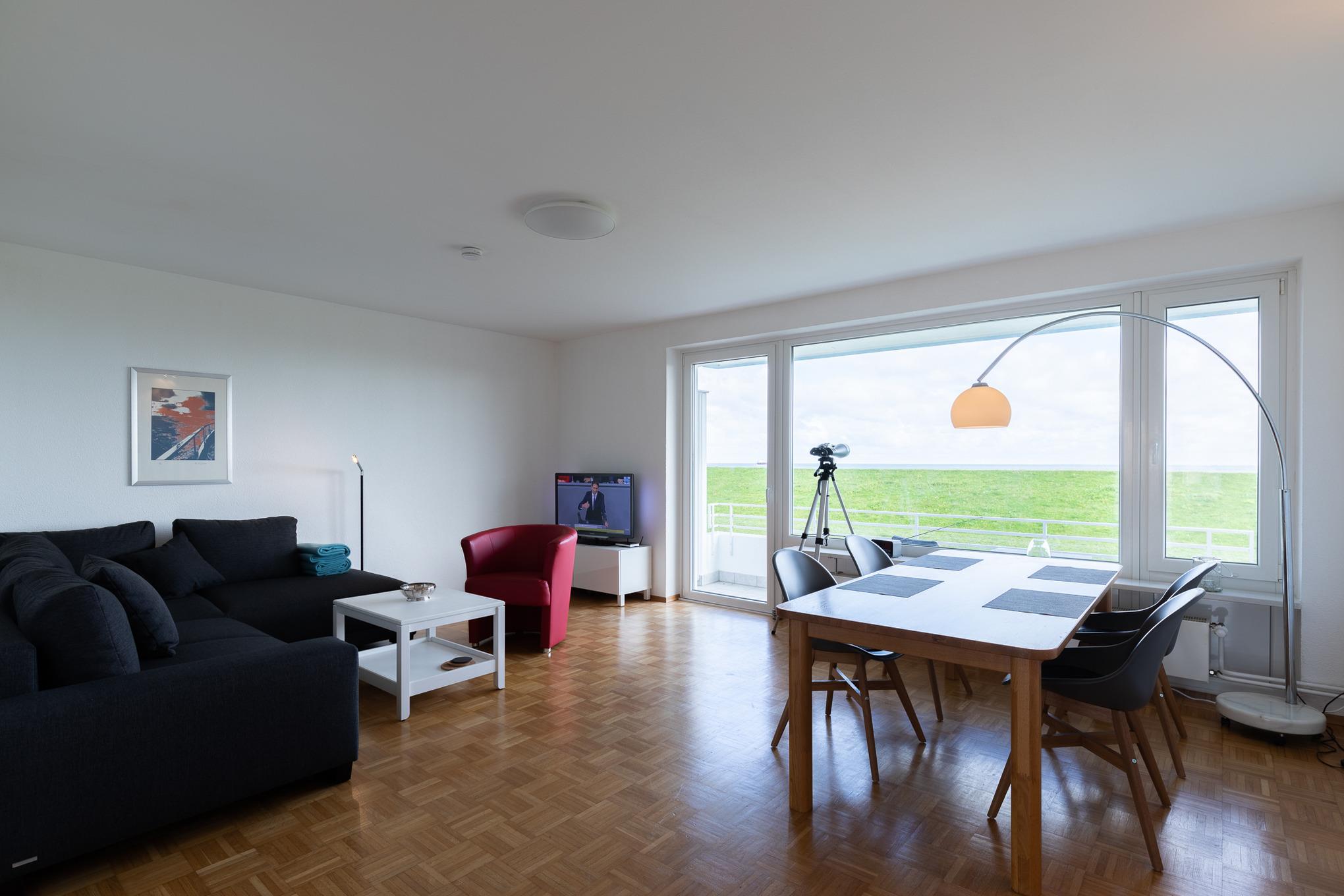 Die modern ausgestattete Wohnung, mit Blick über den Deich auf die vorbeifahrenden Schiffe, befindet sich direkt hinter dem Deich in der Grimmershörnbucht. In wenigen Metern erreichen Sie die Nordsee und die Promenade.