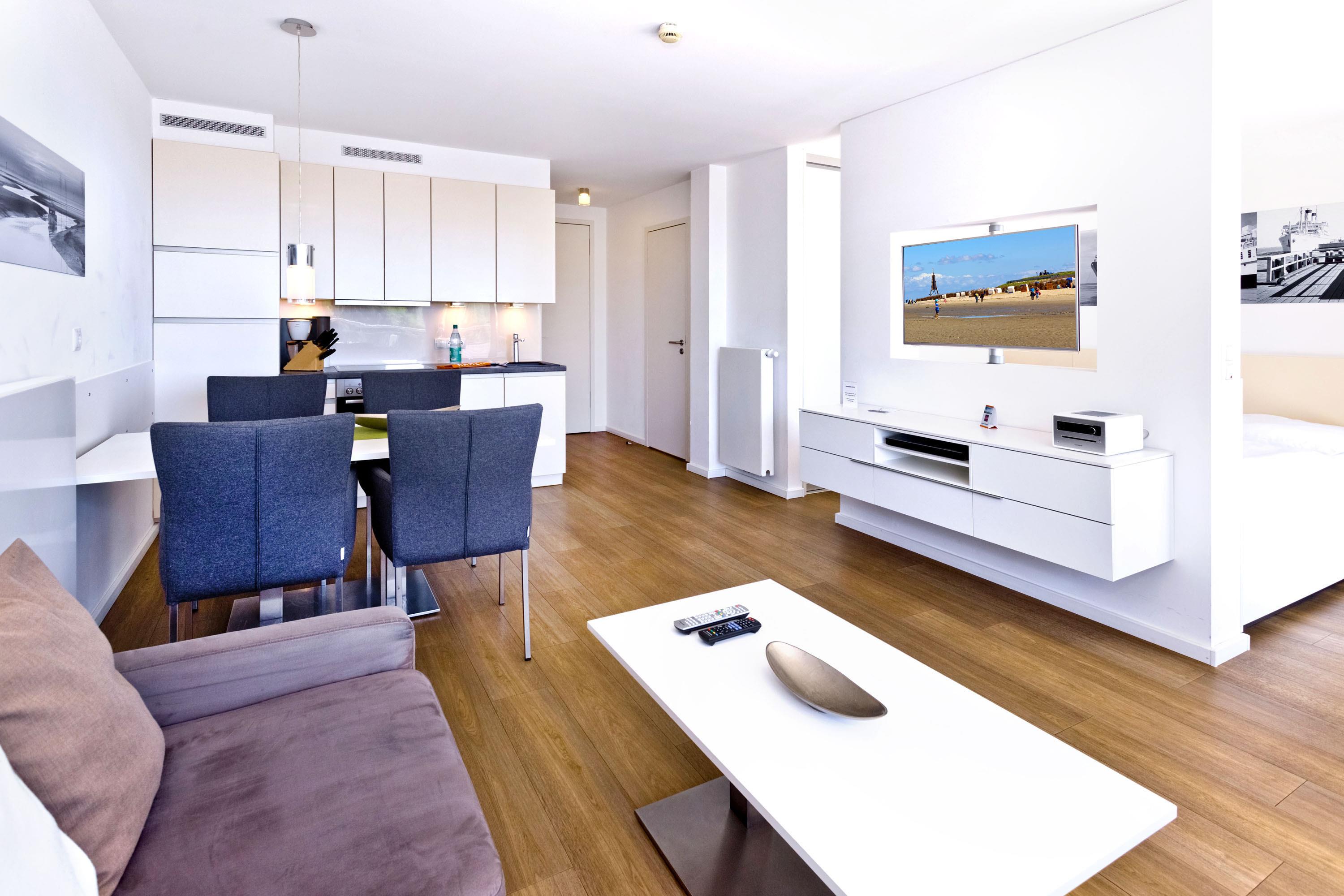 Appartement der Extraklasse mit Seesicht! Das hochwertige Interieur in diesem App. für 2 Pers. für Ihren Wohlfühlurlaub. Großer Balkon mit Seesicht (ost), vollständige Küchenzeile mit Mikrow., Geschirrspüler etc., das gesamte App. ist über Außenjalousien abzudunkeln, SAT-TV (drehbar zum Bett), Blue-Ray-DVD, CD-Kompaktanlage, USB-Steckdosen, kostenloses W-Lan-Internet, allergikerfreundlich, ebenerdige Dusche/WC, Föhn, freie Saunanutzung, reservierter Außenstellplatz am Haus, keine Haustiere und natürlich Nichtraucher.