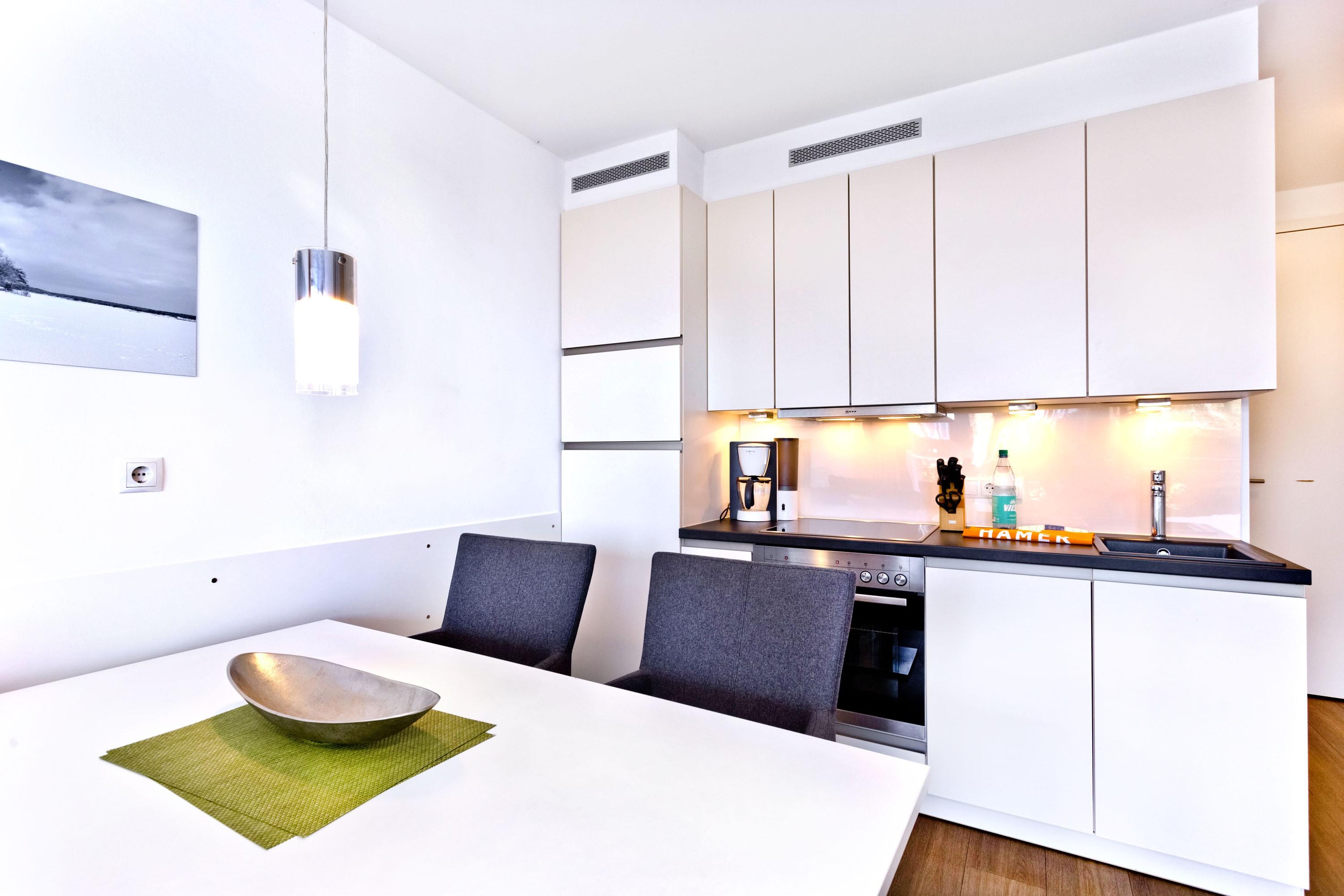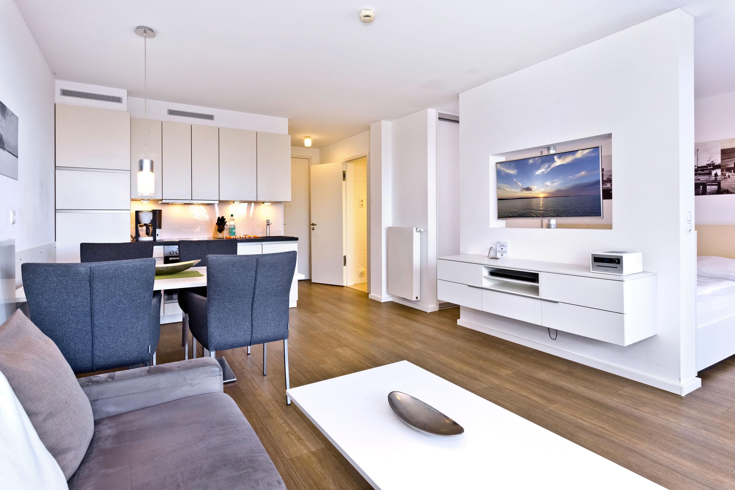 Appartement der Extraklasse mit Seesicht! Das hochwertige Interieur in diesem App. für 2 Pers. für Ihren Wohlfühlurlaub. Großer Balkon mit Seesicht (ost), vollständige Küchenzeile mit Mikrow., Geschirrspüler etc., das gesamte App. ist über Außenjalousien abzudunkeln, SAT-TV (drehbar zum Bett), Blue-Ray-DVD, CD-Kompaktanlage, USB-Steckdosen, kostenloses W-Lan-Internet, allergikerfreundlich, ebenerdige Dusche/WC, Föhn, freie Saunanutzung, reservierter Außenstellplatz am Haus, keine Haustiere und natürlich Nichtraucher.