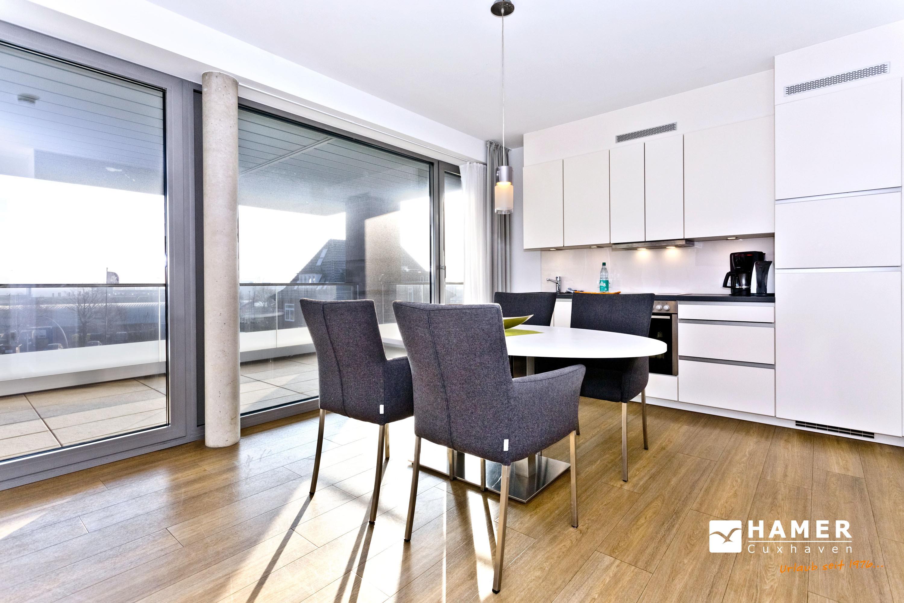 Luxuriöse 3-Zimmer-Ferienwohnung mit Meerblick und Balkon in Grimmershörn, ideal für erholsame Tage an der Nordsee.