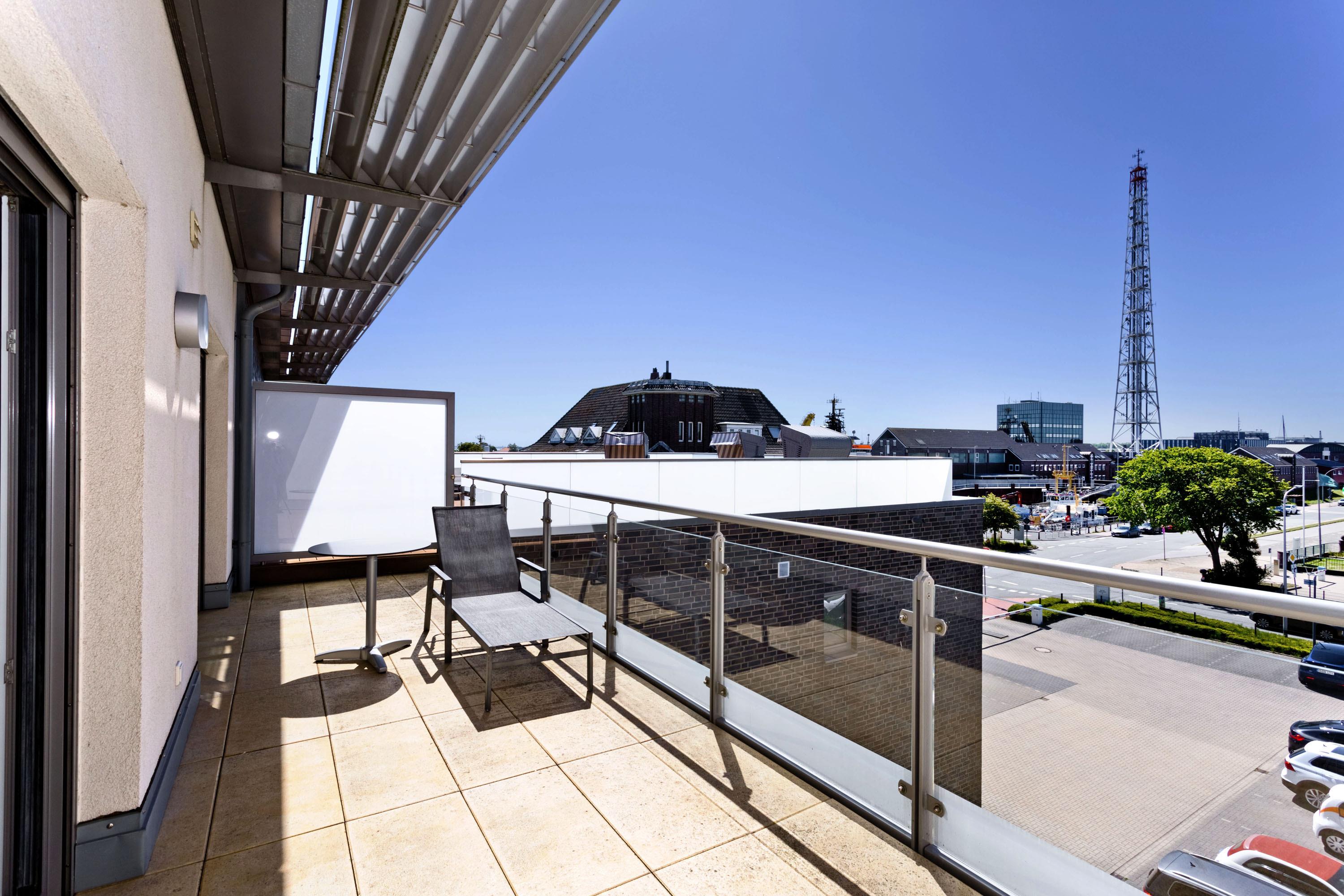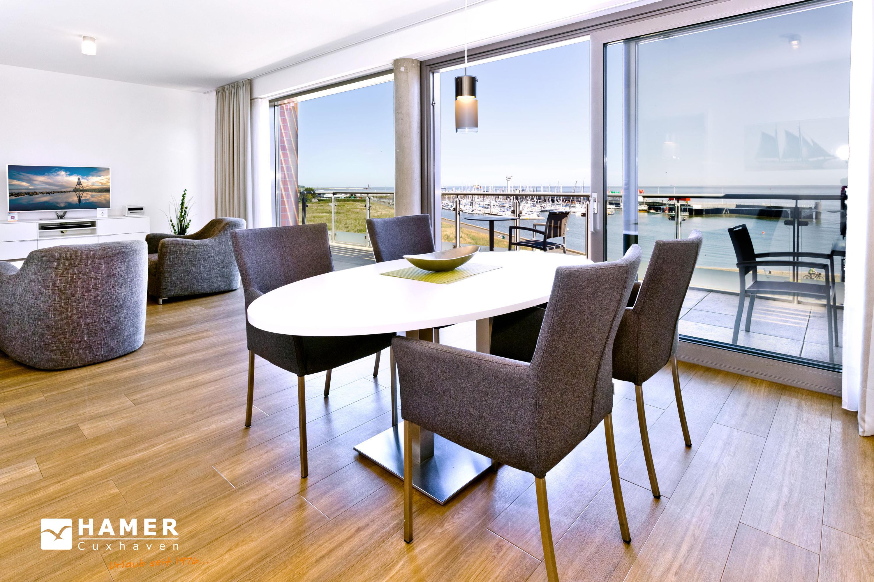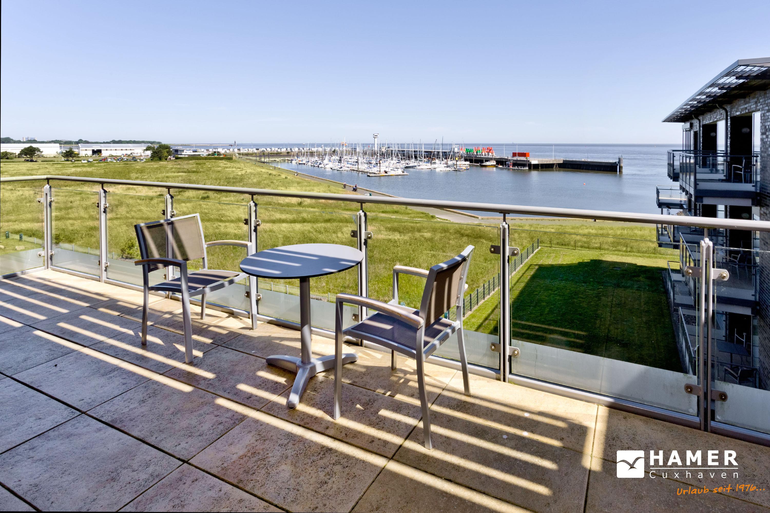 Luxuriöse 2-Zimmer-Ferienwohnung mit Seeblick und zwei Balkonen in Grimmershörn, ideal für entspannte Tage zu zweit.