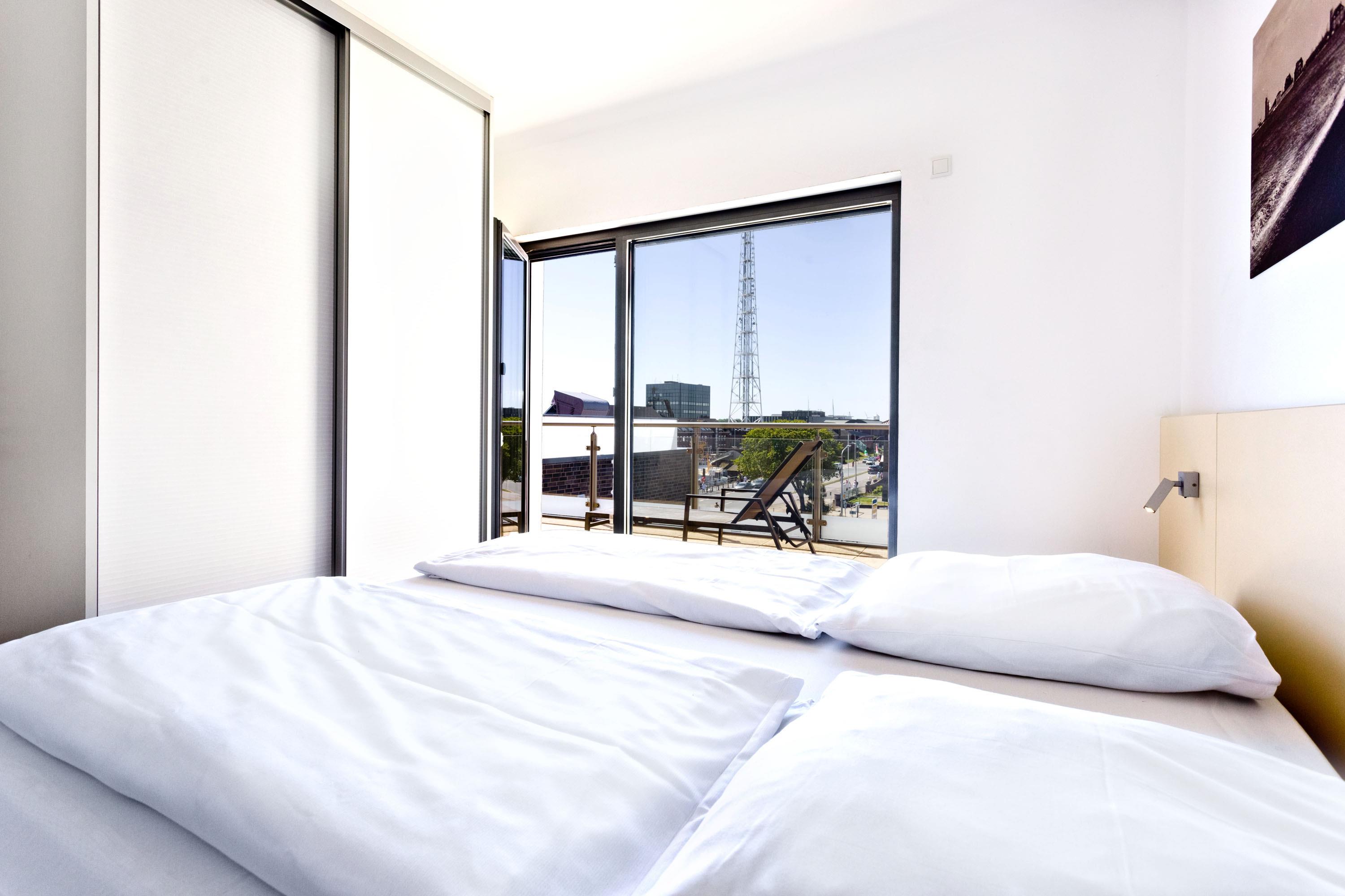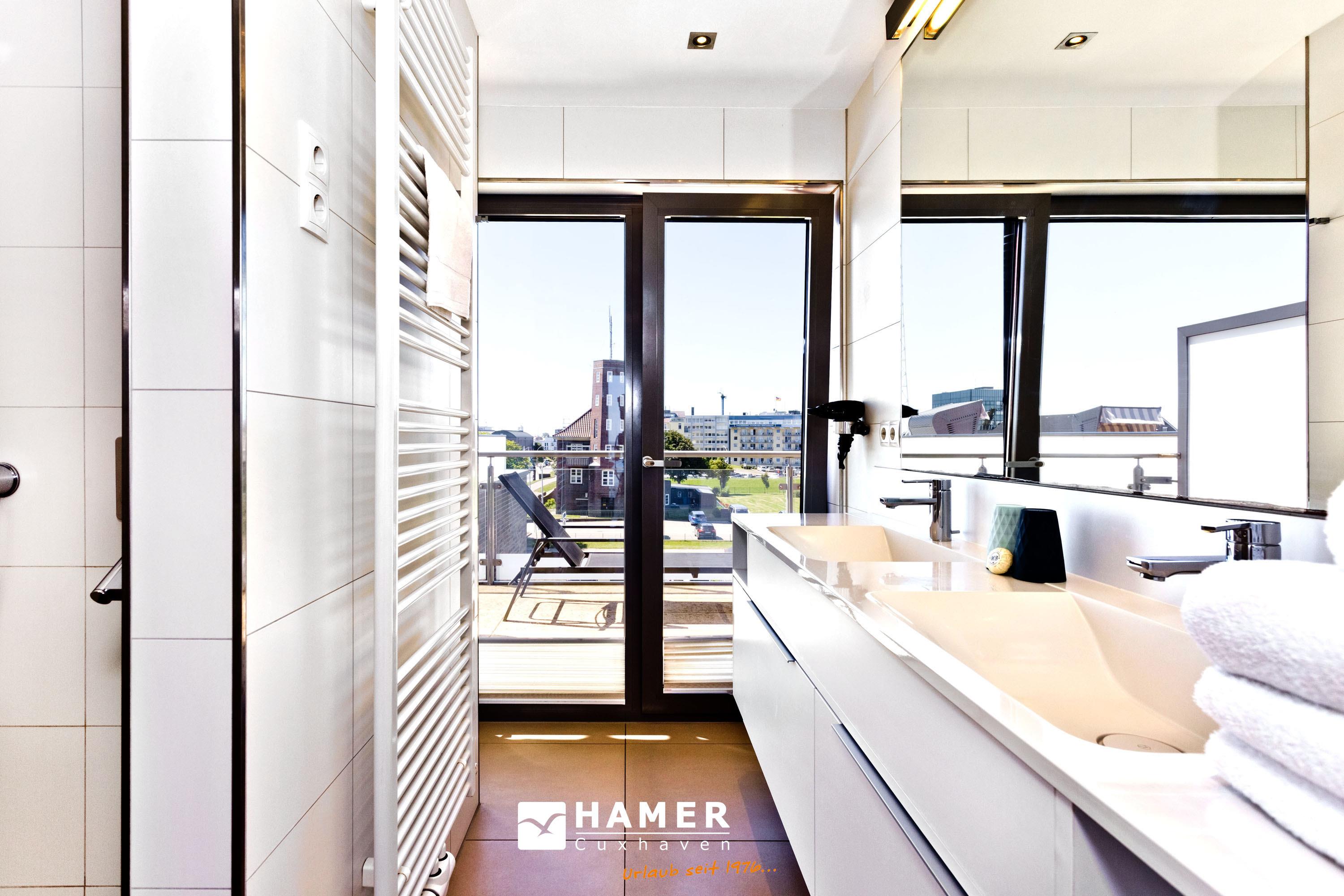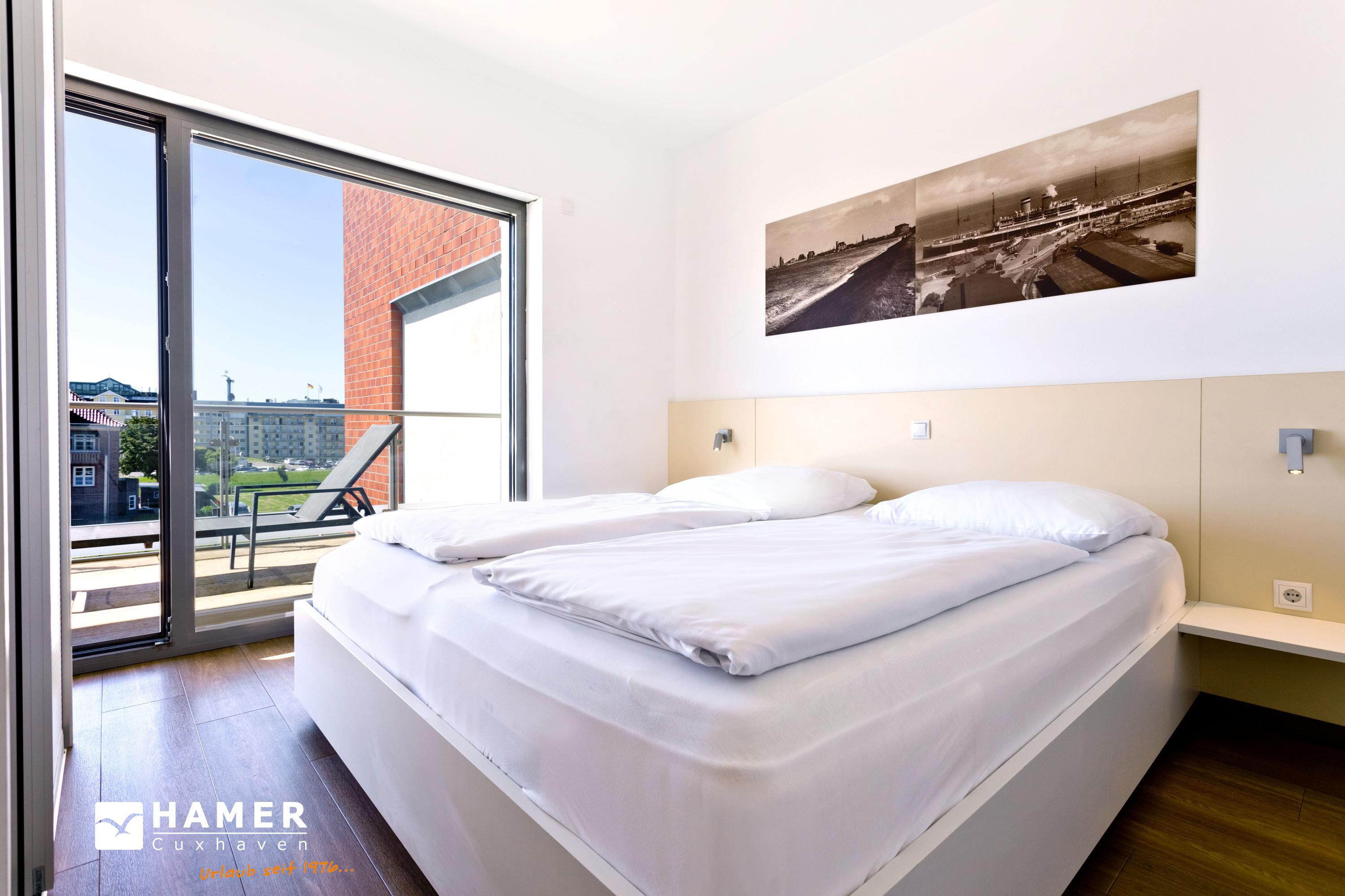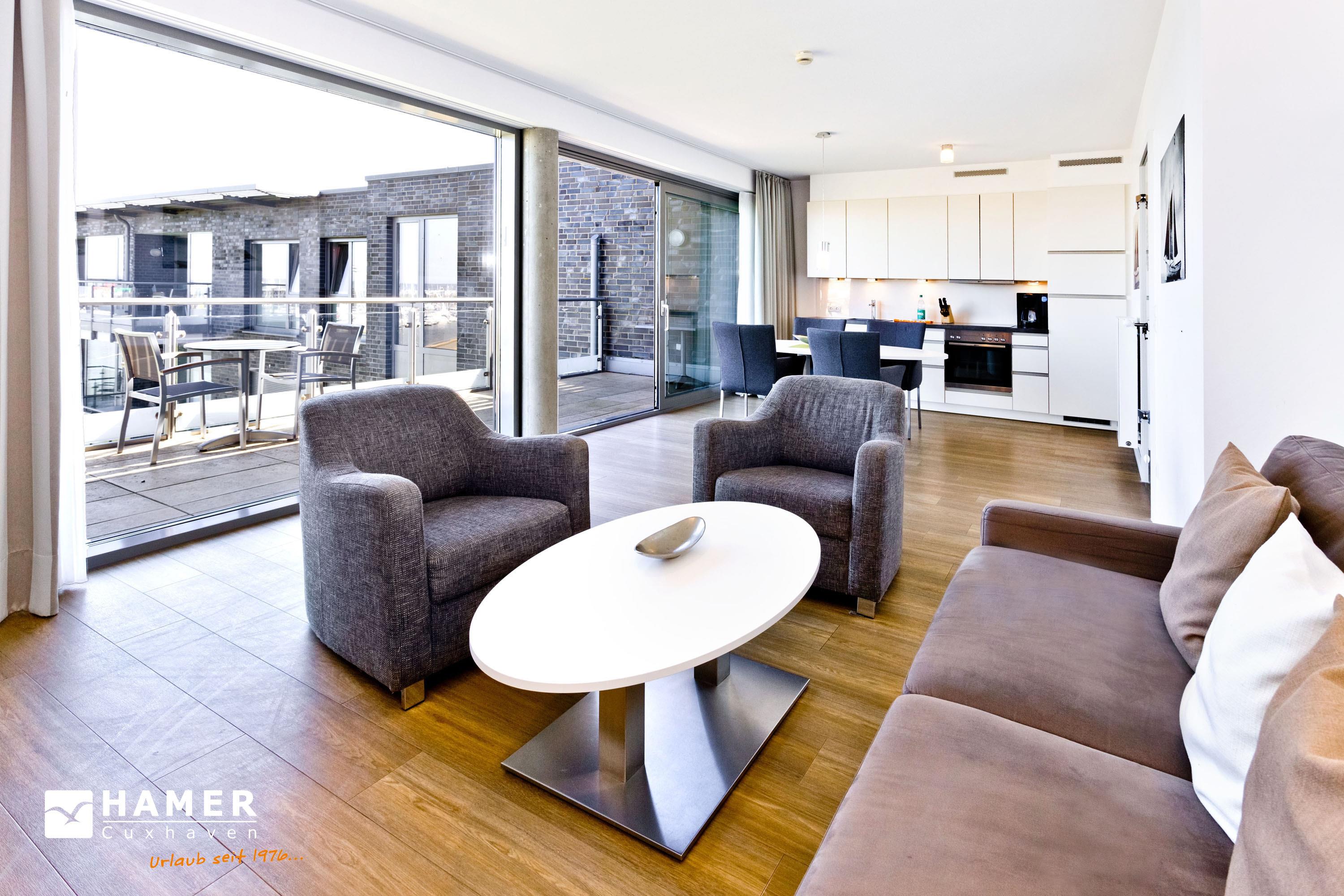 Luxuriöse 2-Zimmer-Ferienwohnung mit Seeblick und zwei Balkonen in Grimmershörn, ideal für entspannte Tage zu zweit.