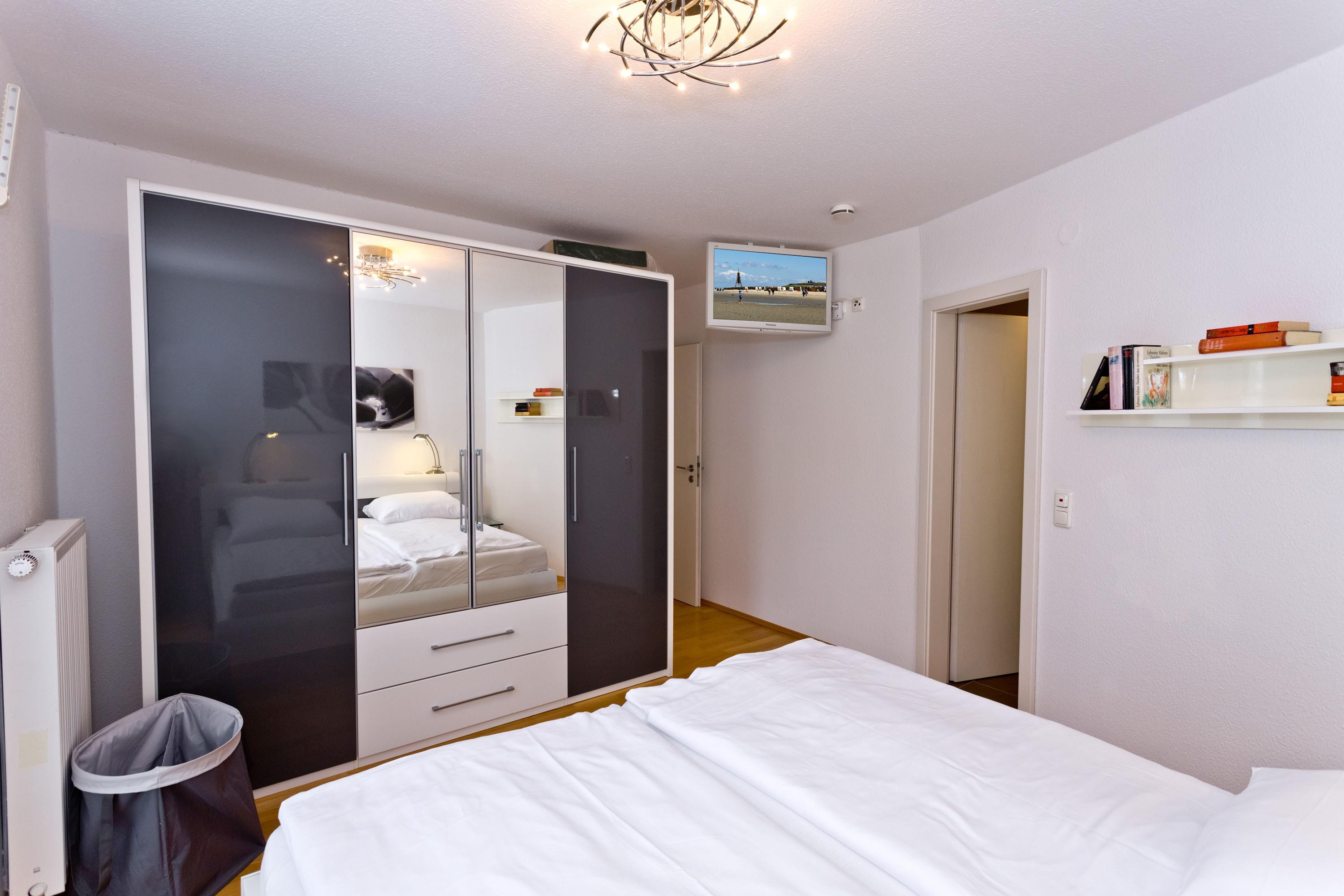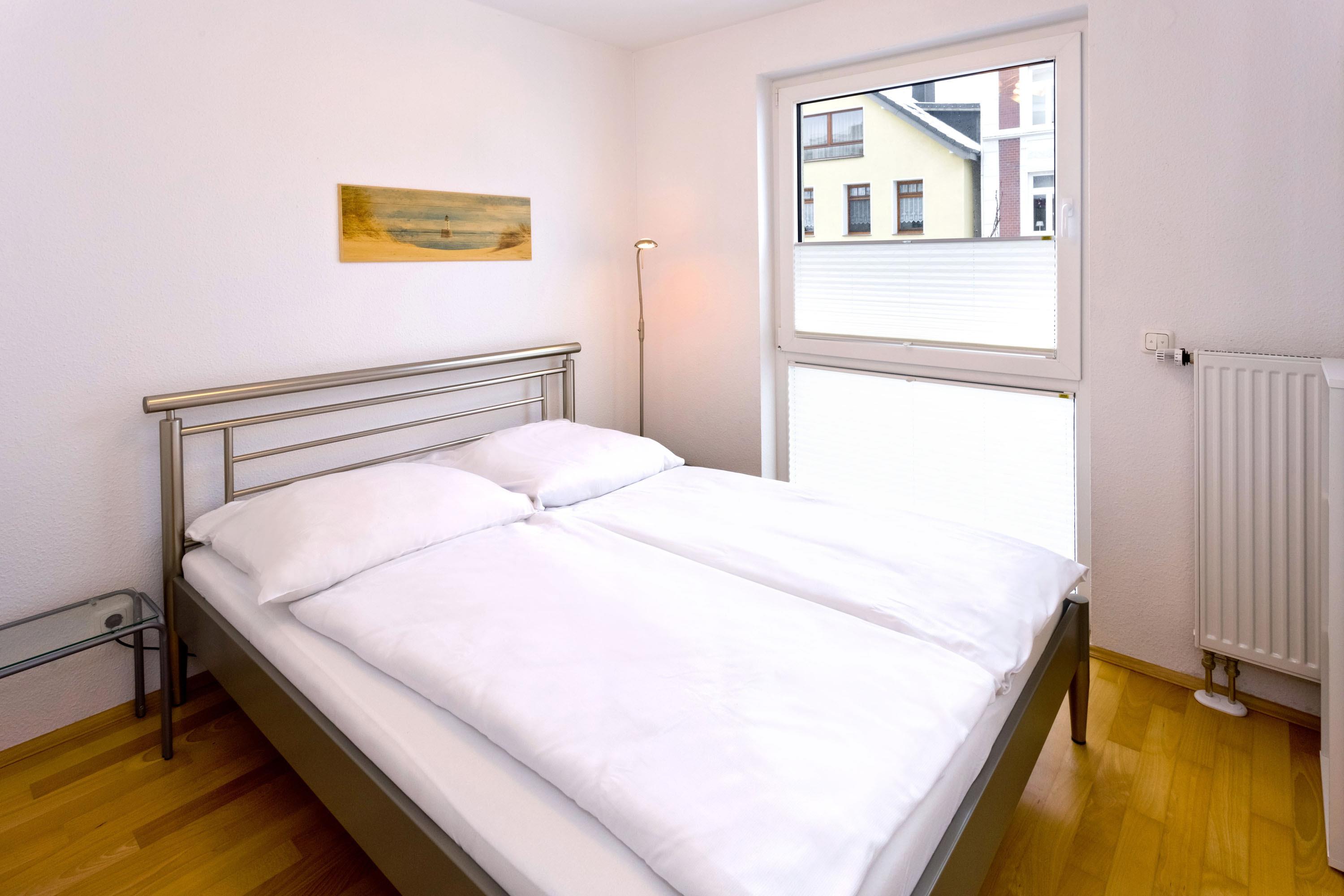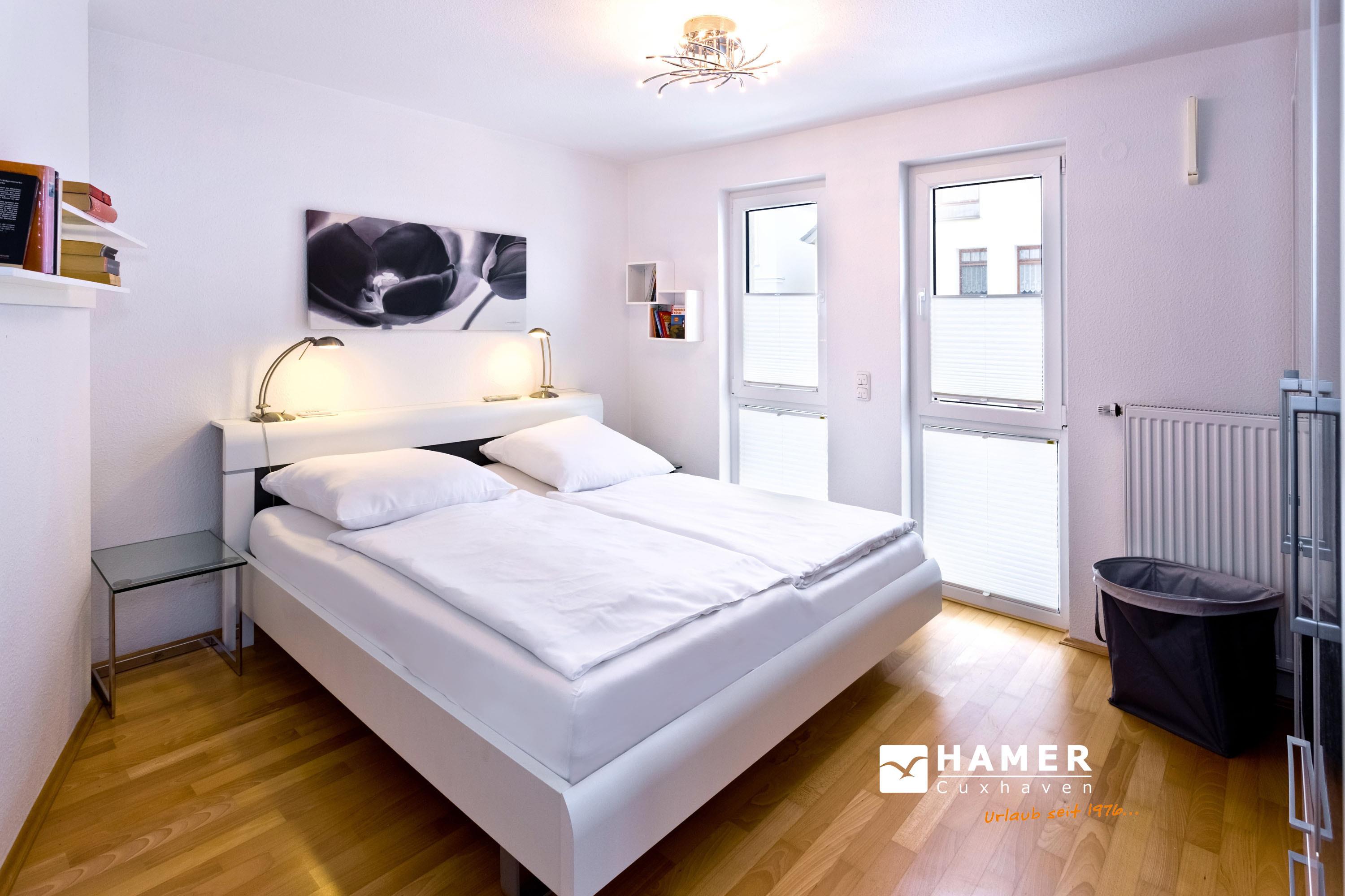 Schöne 3-Zimmer-Wohnung auf der 1.Etage in der Grimmershörnbucht für bis zu 4 Pers., 1 Schlafzimmer mit Doppelbett und TV, 1 Schlafzimmer mit franz. Doppelbett (1,40m x 1,90m), teilweise mit Insektenschutz. Bad mit ebenerdiger Dusche und WC. Wohnzimmer mit vollausgestatteter Küchenzeile (Backofen, Geschirrspüler), Sat-TV, kostenloses W-Lan (offenes Netzwerk), großer Balkon (nord) mit Strandkorb, Einzelgarage #4 im Innenhof mit elektr. Tor, kostenfreie Waschmaschine/Trockner im Erdgeschoss, keine Haustiere erlaubt, Nichtraucher.