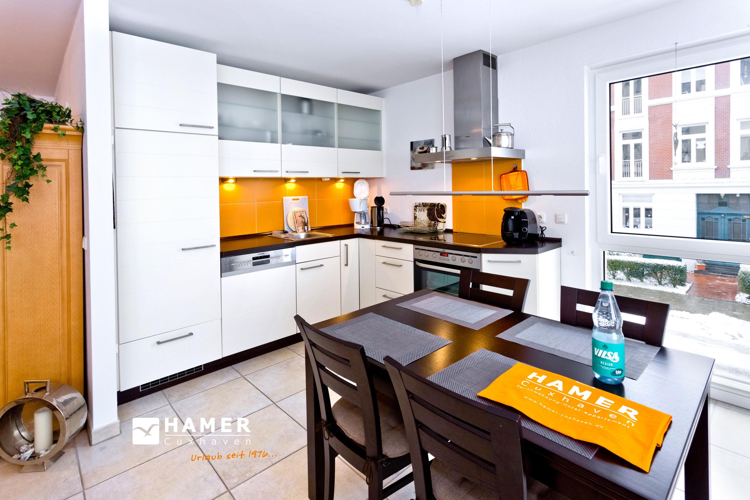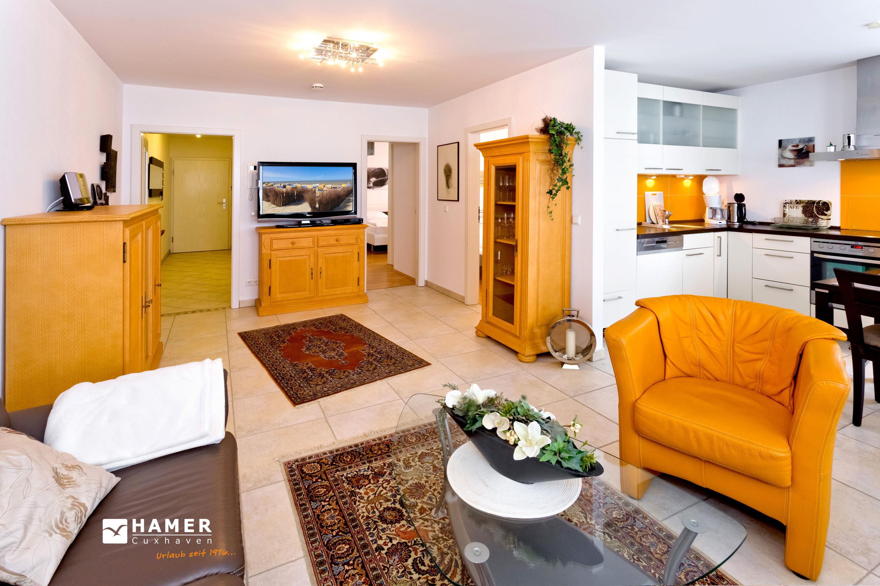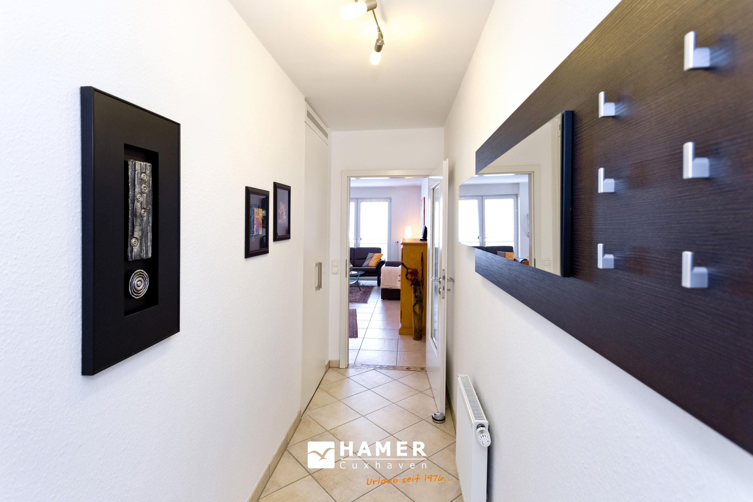 Schöne 3-Zimmer-Wohnung auf der 1.Etage in der Grimmershörnbucht für bis zu 4 Pers., 1 Schlafzimmer mit Doppelbett und TV, 1 Schlafzimmer mit franz. Doppelbett (1,40m x 1,90m), teilweise mit Insektenschutz. Bad mit ebenerdiger Dusche und WC. Wohnzimmer mit vollausgestatteter Küchenzeile (Backofen, Geschirrspüler), Sat-TV, kostenloses W-Lan (offenes Netzwerk), großer Balkon (nord) mit Strandkorb, Einzelgarage #4 im Innenhof mit elektr. Tor, kostenfreie Waschmaschine/Trockner im Erdgeschoss, keine Haustiere erlaubt, Nichtraucher.