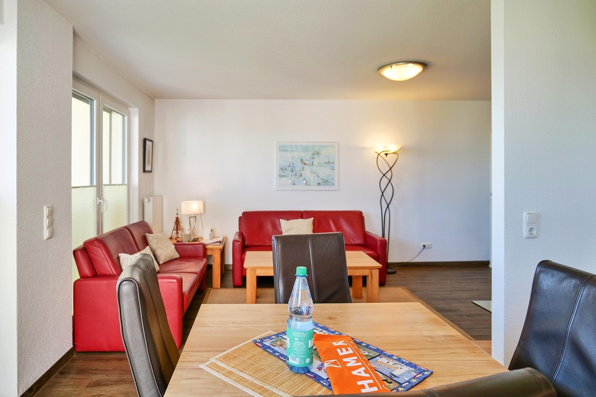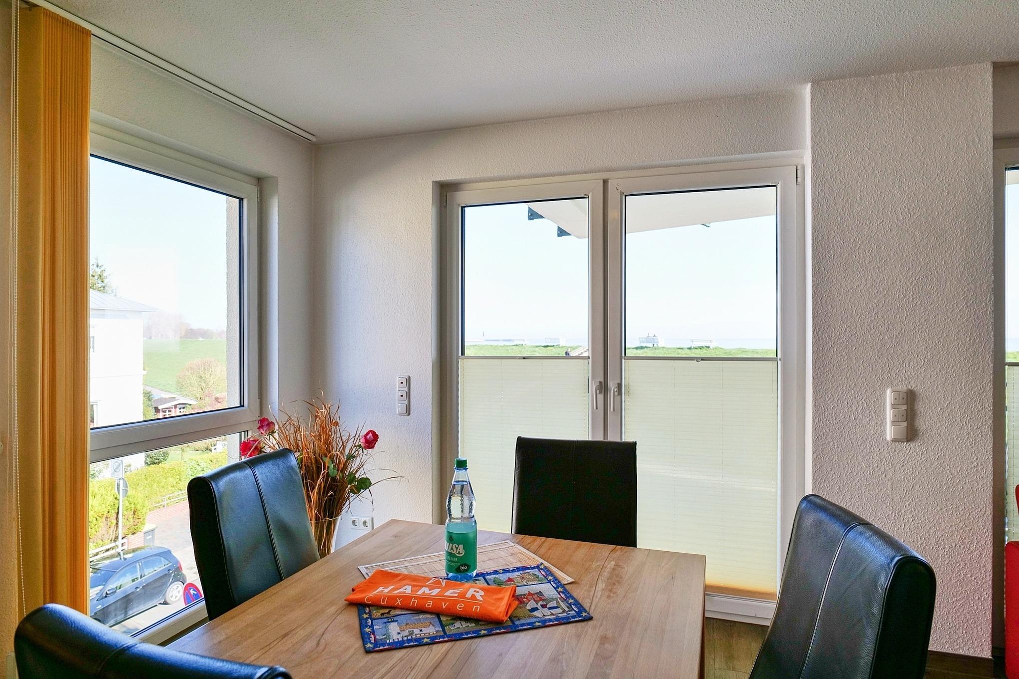 Luxuriöse 3-Zimmer-Wohnung (74m²), 2.Etage mit dem tollen Seeblick in die Grimmershörnbucht und den Weltschifffahrtsweg #1, 1 Schlafzimmer mit Doppelbett und TV, 1 Schlafzimmer mit Einzelbett, Du/Wc mit Föhn, Wohnzimmer mit vollausgestatteter Küchenzeile (Back., Mikrow., Geschirrspüler) Sat-TV mit Bluray-Player, kostenloses W-Lan, großer Balkon (nord), alle Zimmer mit Rollläden, Parkplatz #9, keine Haustiere erlaubt, Nichtraucher. Kostenloser Strandkorb #240 (01.05.-20.09.) inkl.
