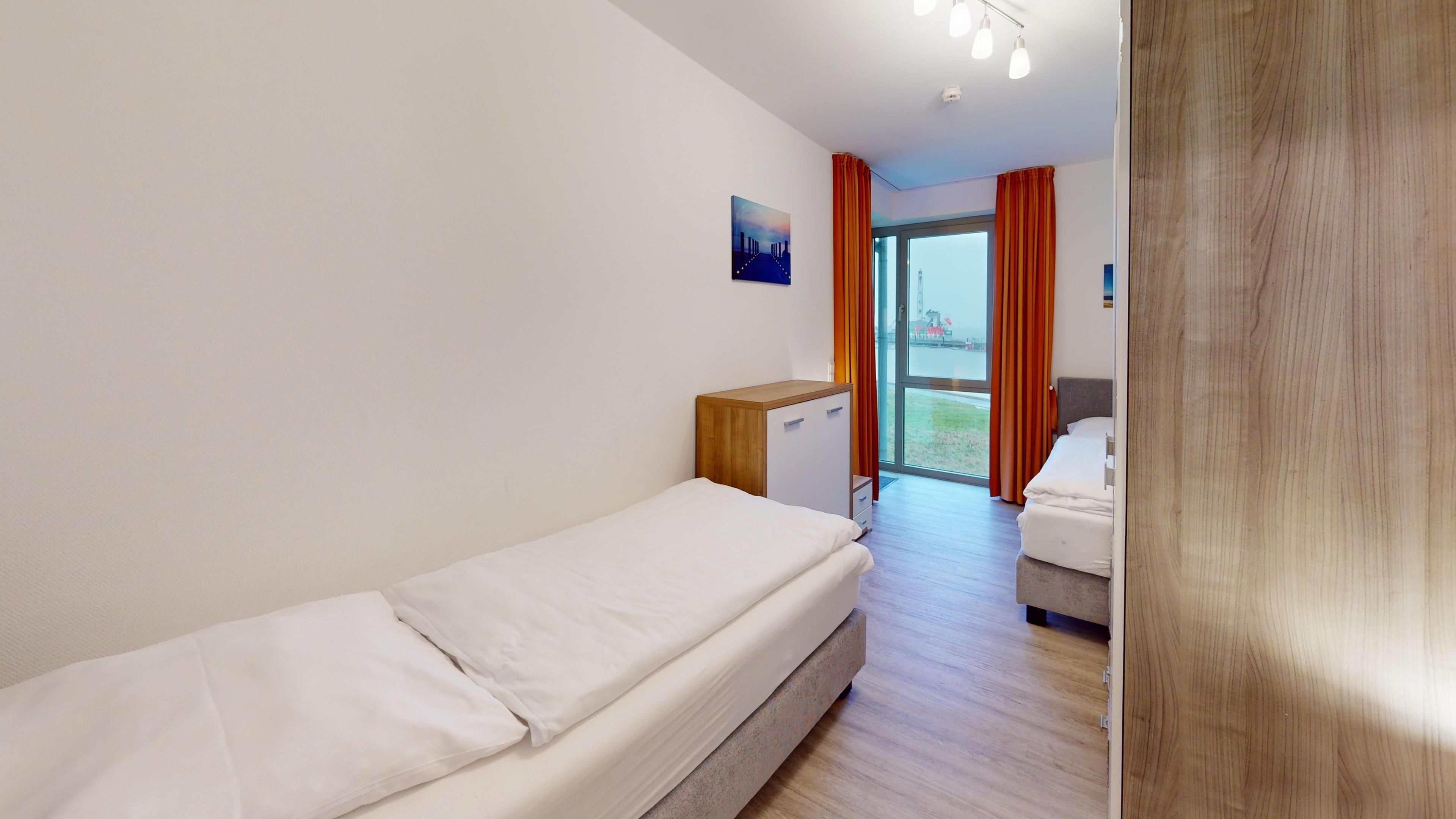 Sehr geschmackvolle 3 Zi.-Wohnung in der 1.Etage über 75m². Traumhafter Seeblick auf den Weltschifffahrtsweg, 1 Schlafzimmer mit Doppelbett (Boxspringbett), 1 Schlafzimmer mit 2 Einzelbetten (Boxspring), 1x Badewanne/WC und 1x Dusche/WC, Wohnzimmer mit komplett ausgestatteter Küchenzeile, schöner Balkon zur Wasserseite. Reservierter Pkw-Stellplatz in der Tiefgarage, Nichtraucher, keine Haustiere erlaubt.