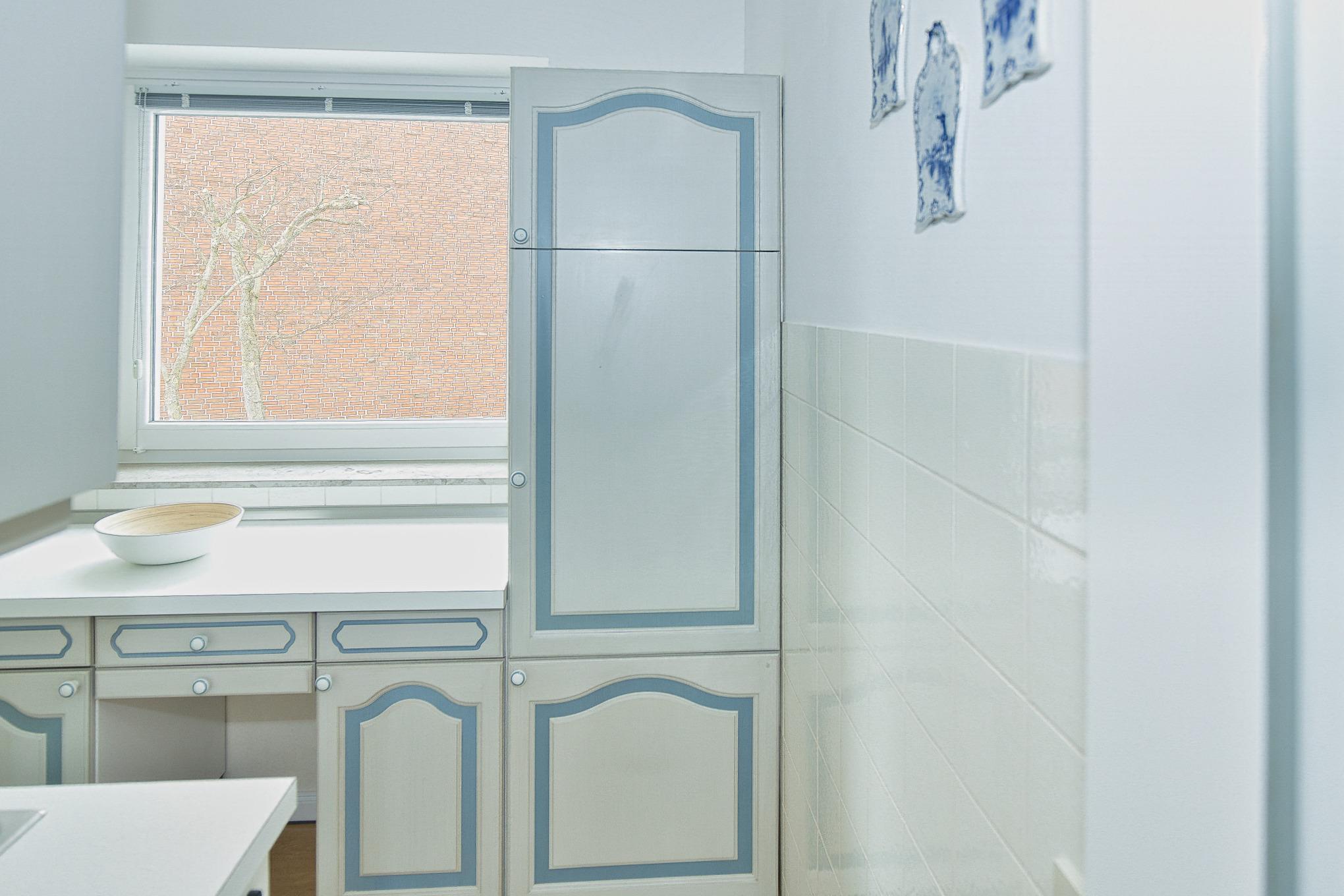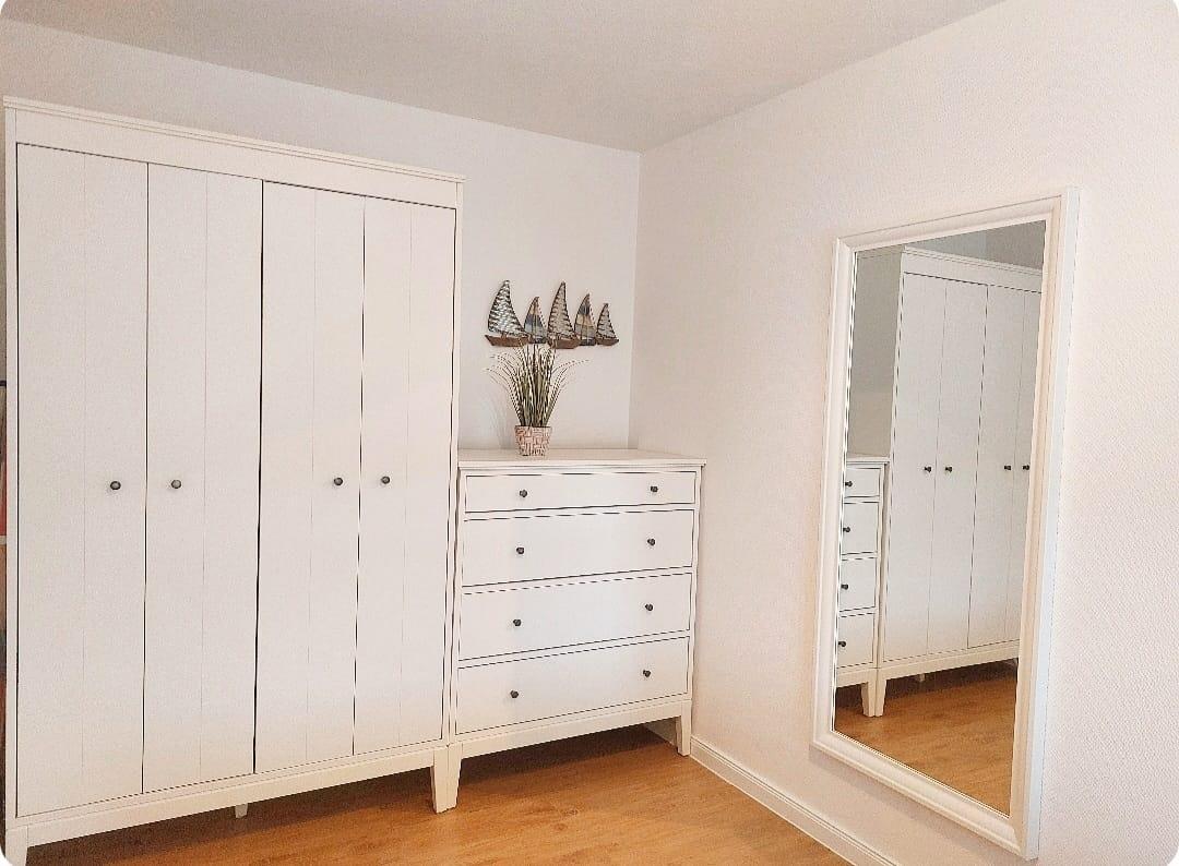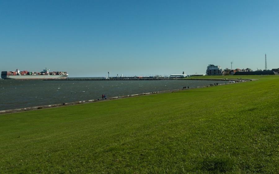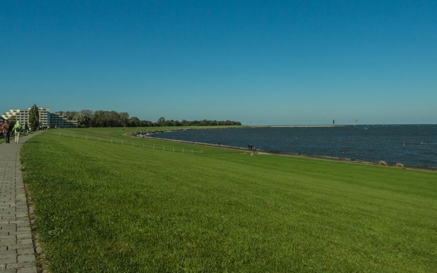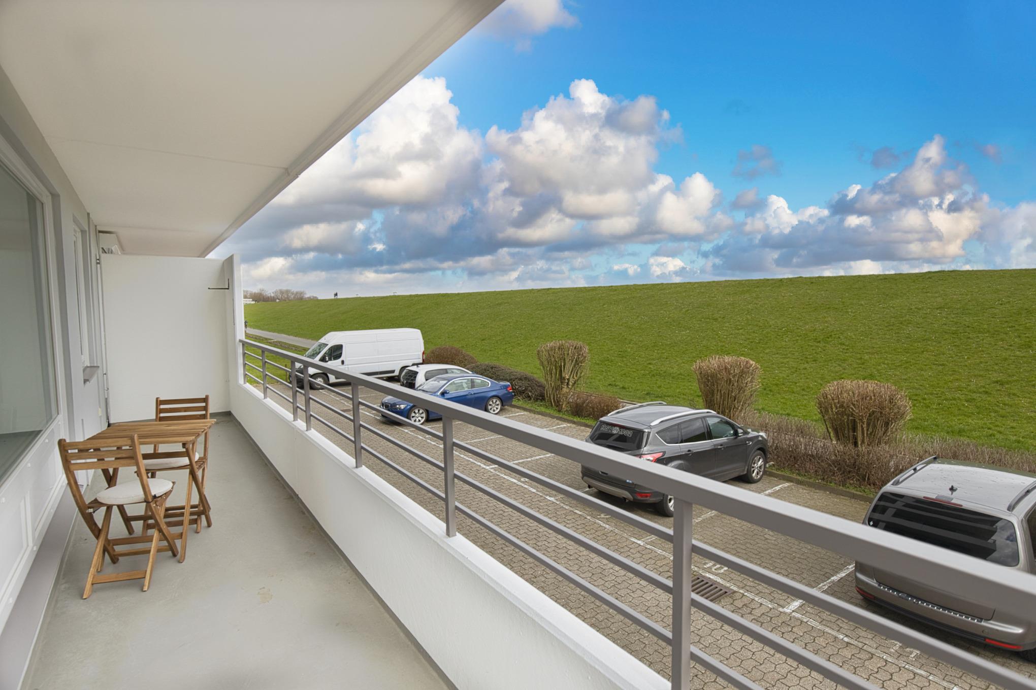 Die Ferienwohnung empfangt Sie in der Diele, großzügig mit Garderobe und dem Zugang zur Küche, zum Duschbad und zum Wohnbereich. Eine Waschmaschine, Kühlschrank mit Gefrierfach befinden sich direkt in der mit vielen Ablagen gut ausgestatteten Küche. Der Essbereich, der sich im Wohnzimmer befindet, bietet auch für ein Frühstücksbrunch genügend Platz am Tisch und wenn es das Wetter zulässt wird am Abend der Wein auf dem Balkon ausgeschenkt. Auch wenn Sie hier keine Seesicht genießen, die direkte Deichnähe lässt Sie entspannen. Wenige Schritte und Sie sind auf der der Deichkrone und haben das Wasser zum greifen nahe. Das Bojenbad in der Grimmershörnbucht ist nur wenige Meter entfernt.