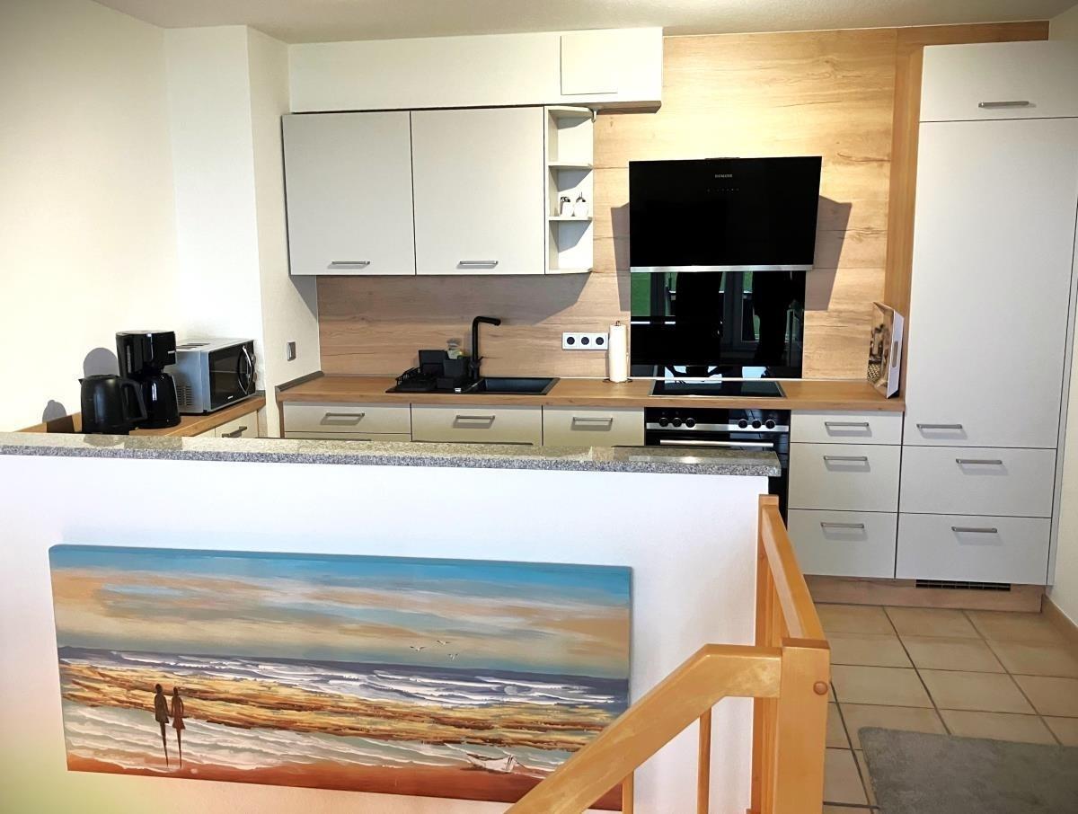 Die moderne, offen gestaltete Küche ist neu eingebaut und voll ausgestattet mit Cerankochfeld, Backofen, Mikrowelle, Geschirrspüler sowie Kühlschrank mit Gefrierfach – perfekt für selbstgekochte Urlaubsmahlzeiten.