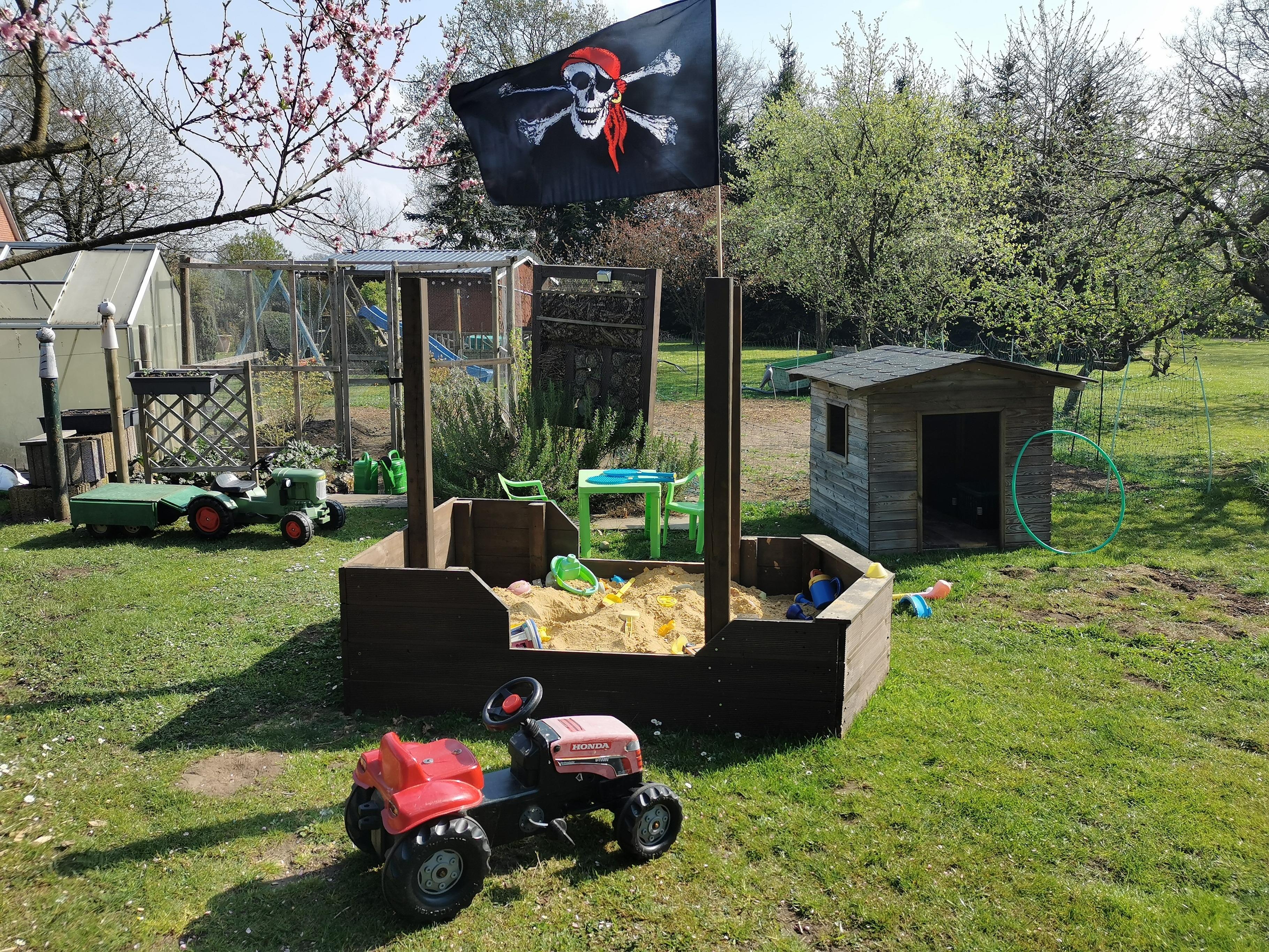 Ein Grill, Gartenmöbel, Liegestühle und Hängematten sind vorhanden.