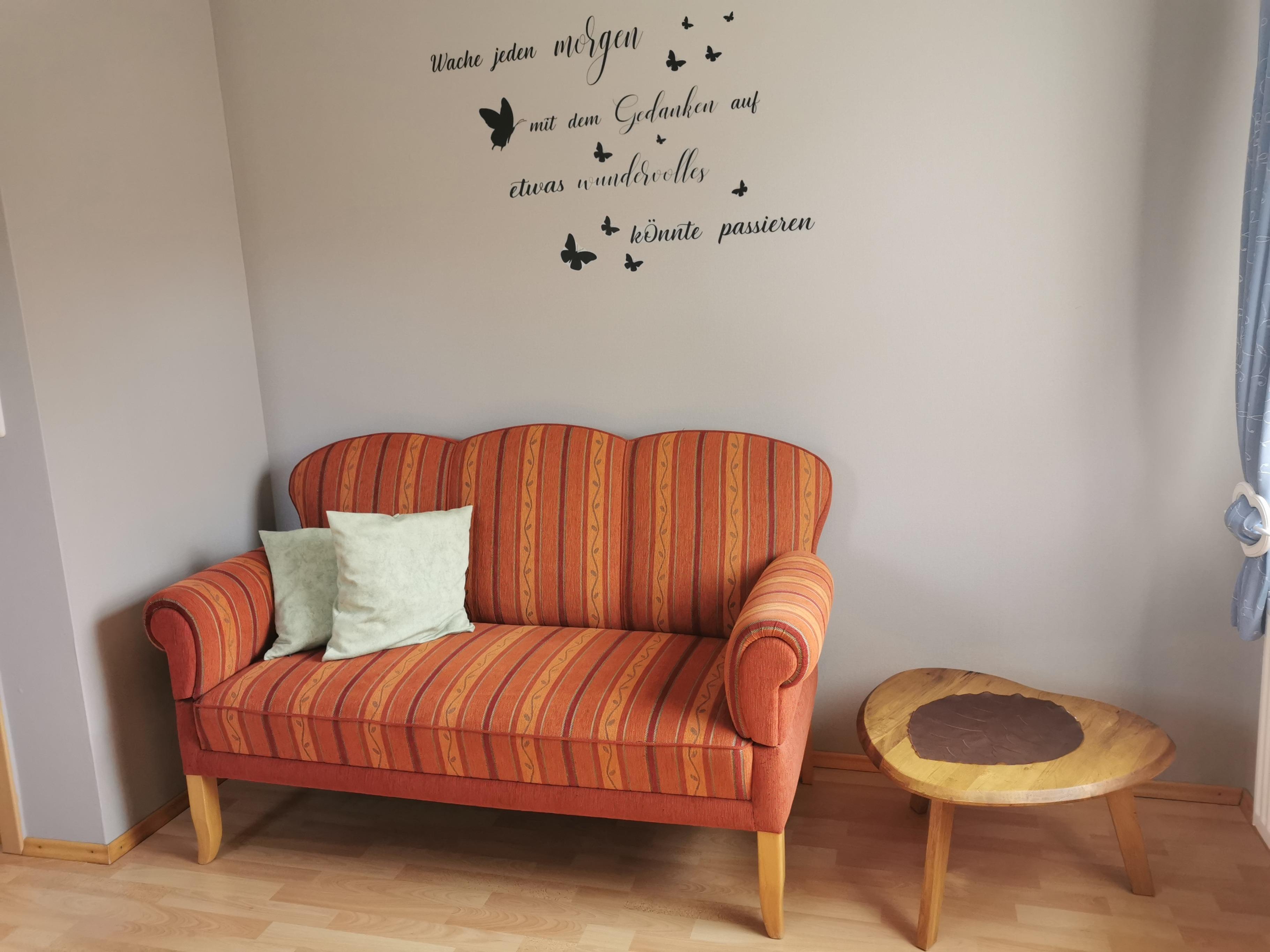 kleines gemütliches Wohnzimmer mit Sofa, Tisch, Kommode und Sat /TV,