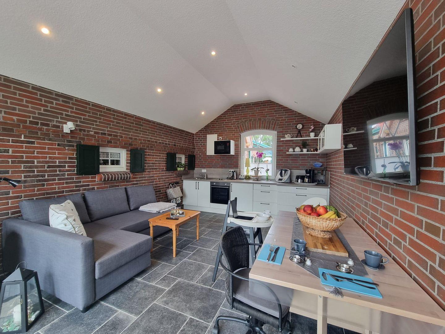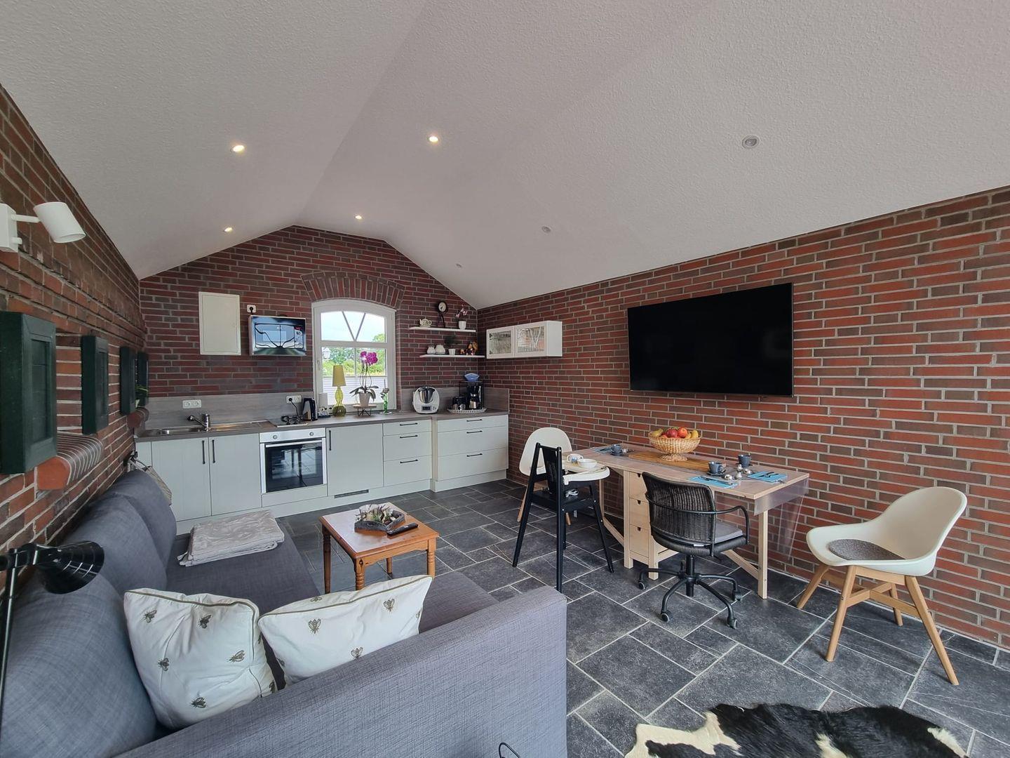 Die Küche ist ausgestattet mit einer, Filter Kaffeemaschine, Backofen und 2-Platten Herd, sowie mit sämtlichen Küchen Utensilien, sodass Sie nach einem entspannten Tag gemeinsam Kochen und genießen können.
