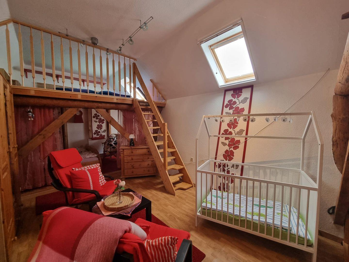 Kinderbett und Hochstuhl steht für Sie zur freien Nutzung.