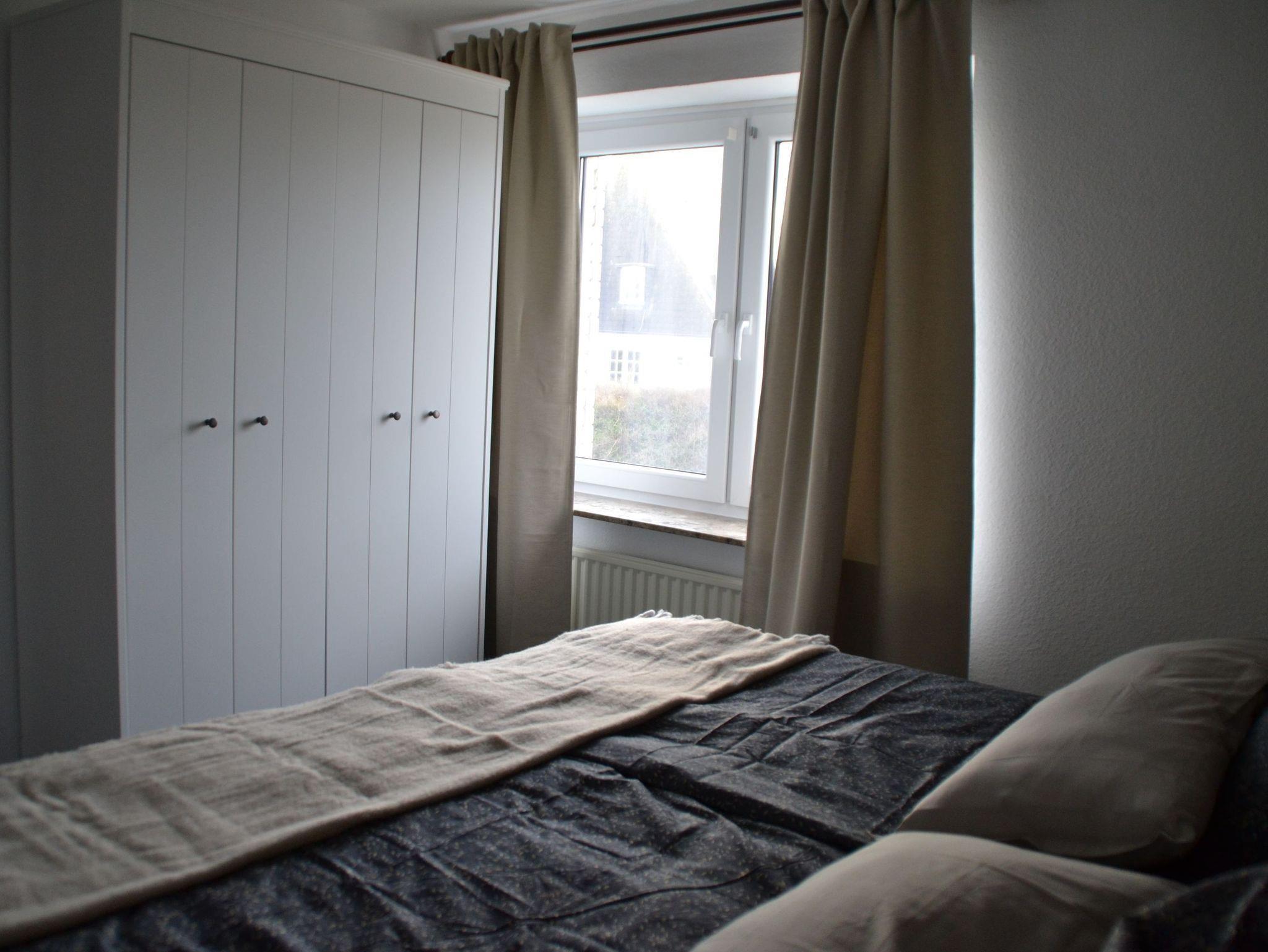 Diese kleine Ferienwohnung für zwei Personen im Haus Meerblick hat zwei getrennte Zimmer, davon ein neues Schlafzimmer mit Boxspringbett, und ein Wohnzimmer mit Küchenzeile.