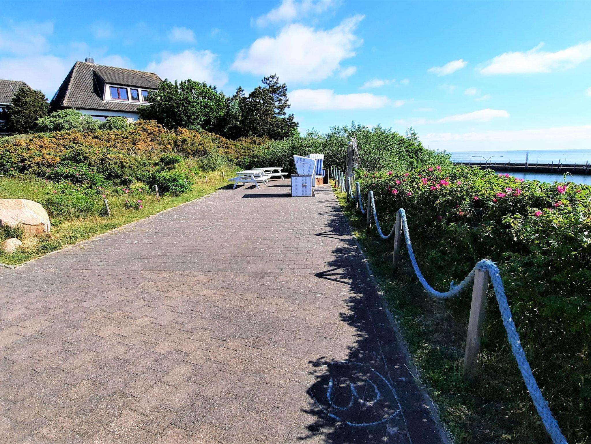 Das Haus liegt auf einer Düne am Ende einer Sackgasse direkt über dem Hafen, eine lange Treppe führt hinunter zum Hafen und den Ausflugsschiffen. Vom Essplatz aus hat man einen fantastischen Blick auf das Meer, auf die Nachbarinseln Amrum und Föhr sowie auf die Südspitze mit Leuchtturm. Bei klarer Sicht kann man sogar die Halligen Langeneß und Hooge sehen.