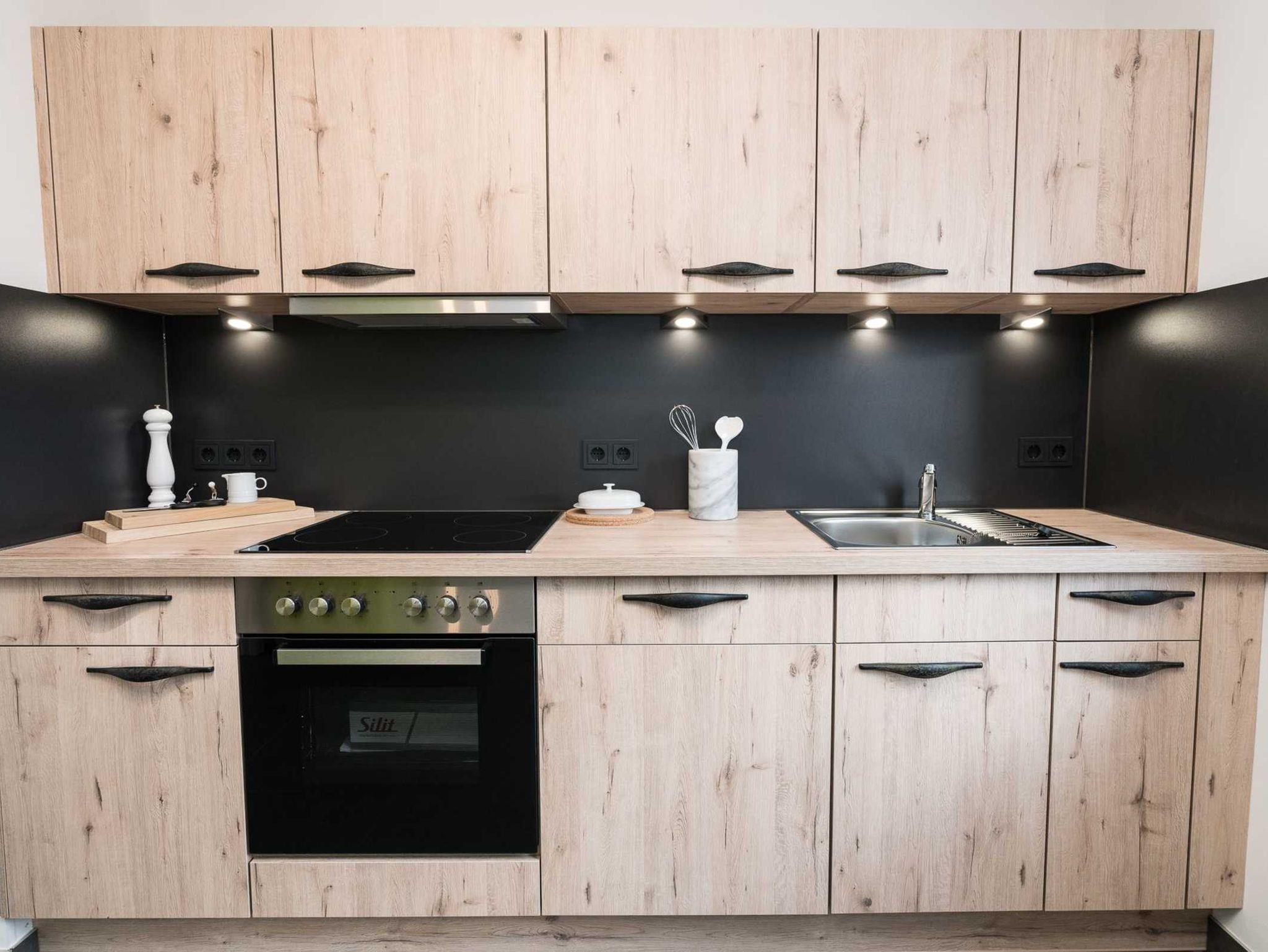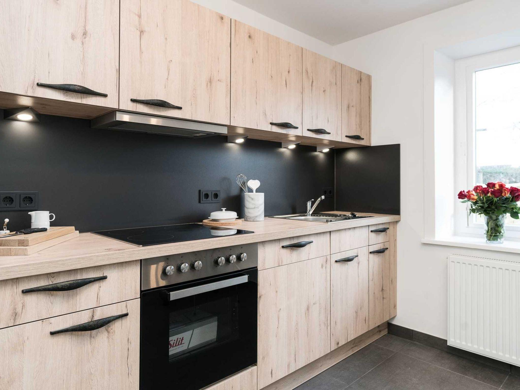 Die moderne und großzügige Küche lässt ebenfalls keine Wünsche offen und verfügt über einen Backofen, Geschirrspüler, Ceran-Kochfeld (4-Platten), eine Kaffeemaschine, Wasserkocher und Toaster.