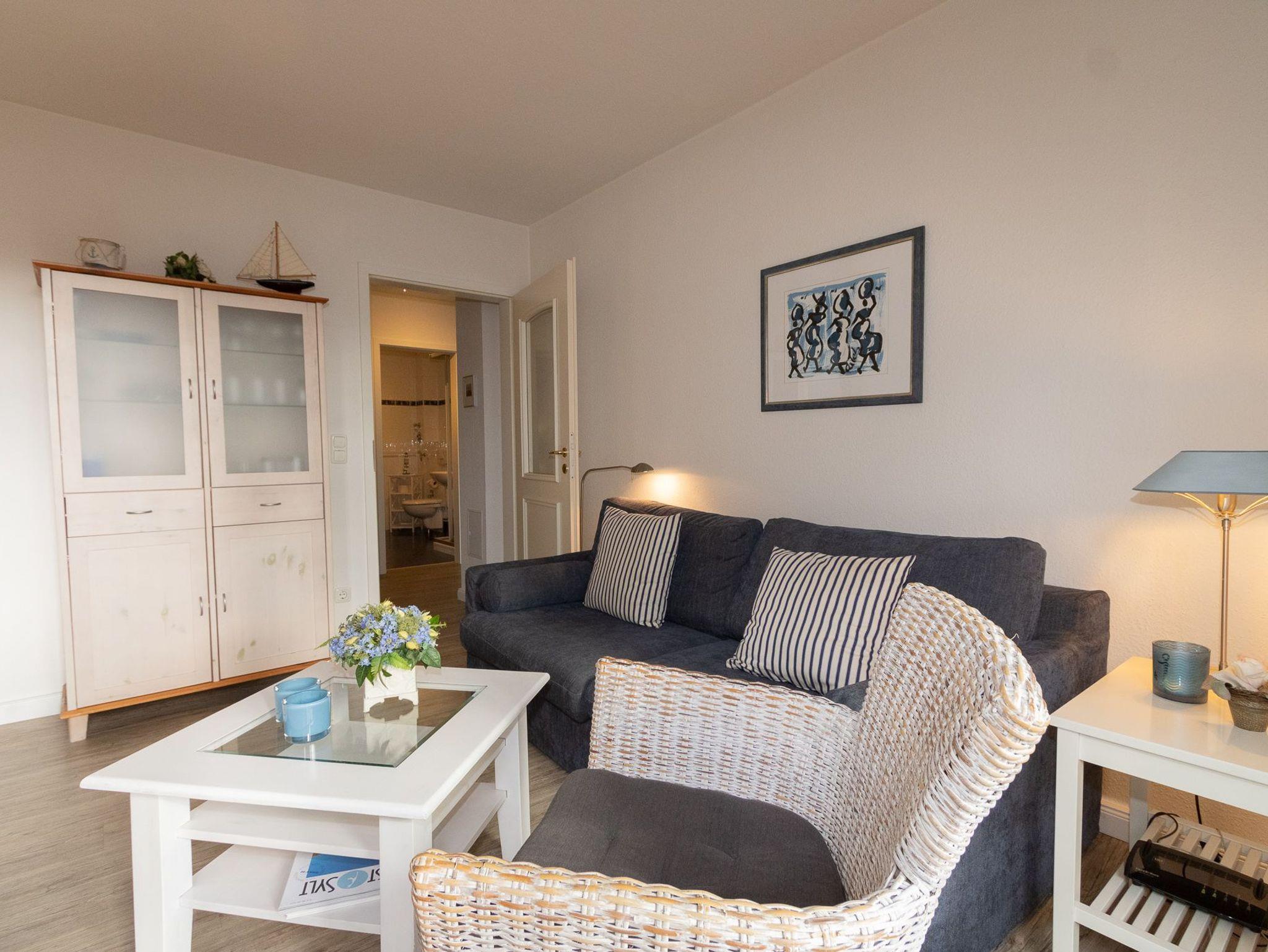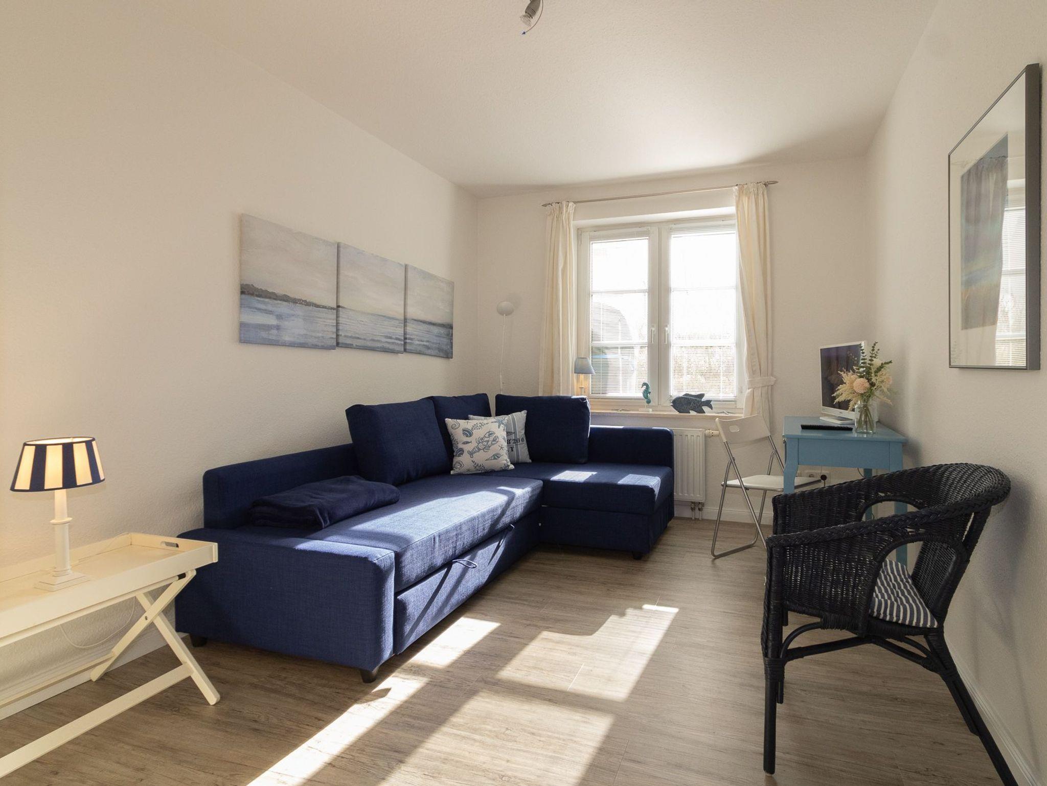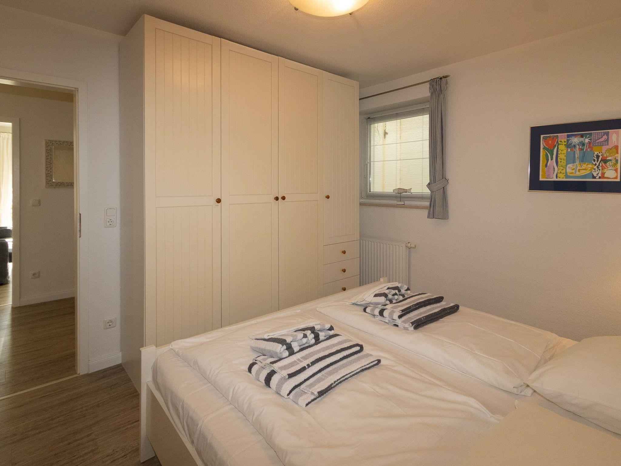 Die Wohnung liegt im Gartengeschoss und ist aufgeteilt in einen gemütlichen Wohn-/Essbereich mit komplett ausgestatteter Küchenzeile, einen Schlafraum mit Doppelbett und ein Duschbad. Im zweiten Schlafraum kann auch eine Schlafcouch für die 3. oder 4. Person ausgezogen werden.
