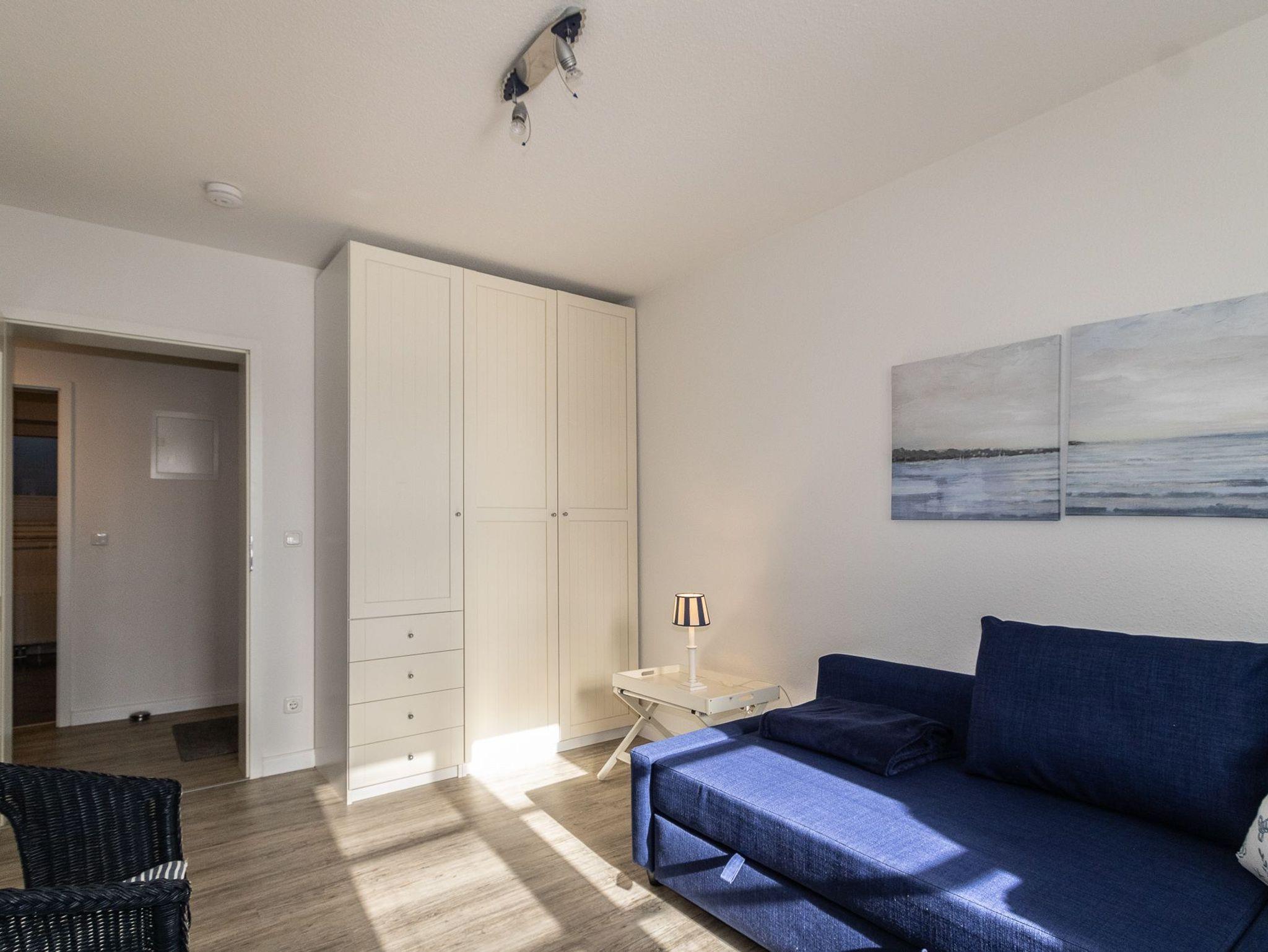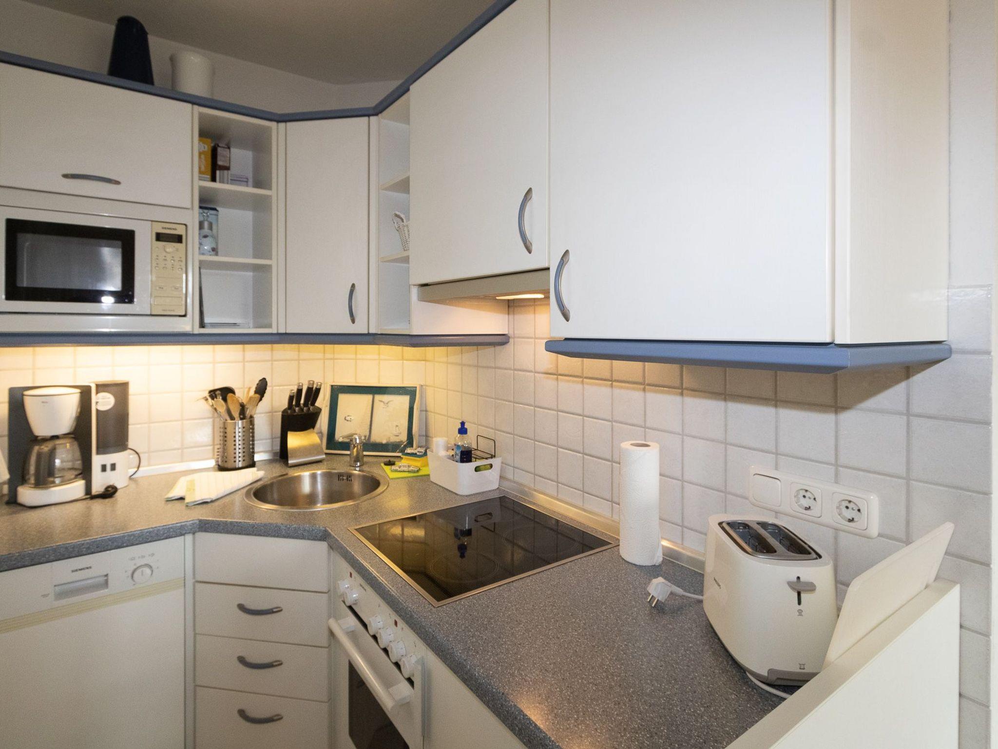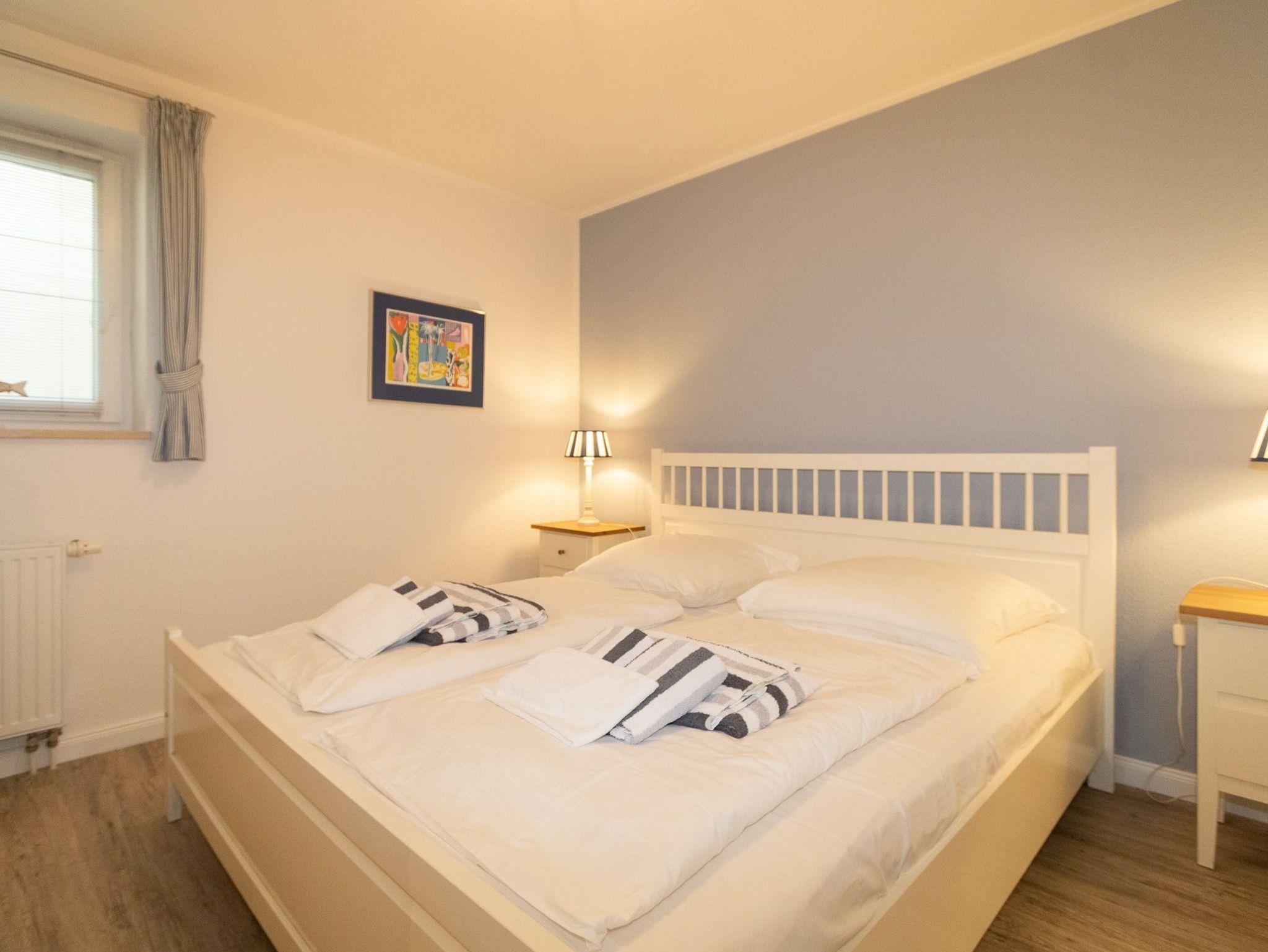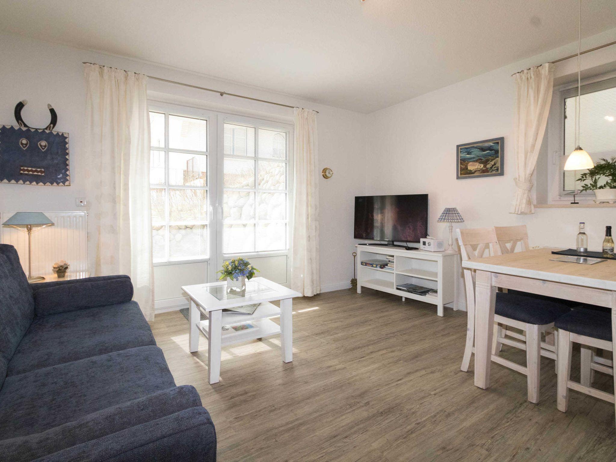 Die Wohnung liegt im Gartengeschoss und ist aufgeteilt in einen gemütlichen Wohn-/Essbereich mit komplett ausgestatteter Küchenzeile, einen Schlafraum mit Doppelbett und ein Duschbad. Im zweiten Schlafraum kann auch eine Schlafcouch für die 3. oder 4. Person ausgezogen werden.