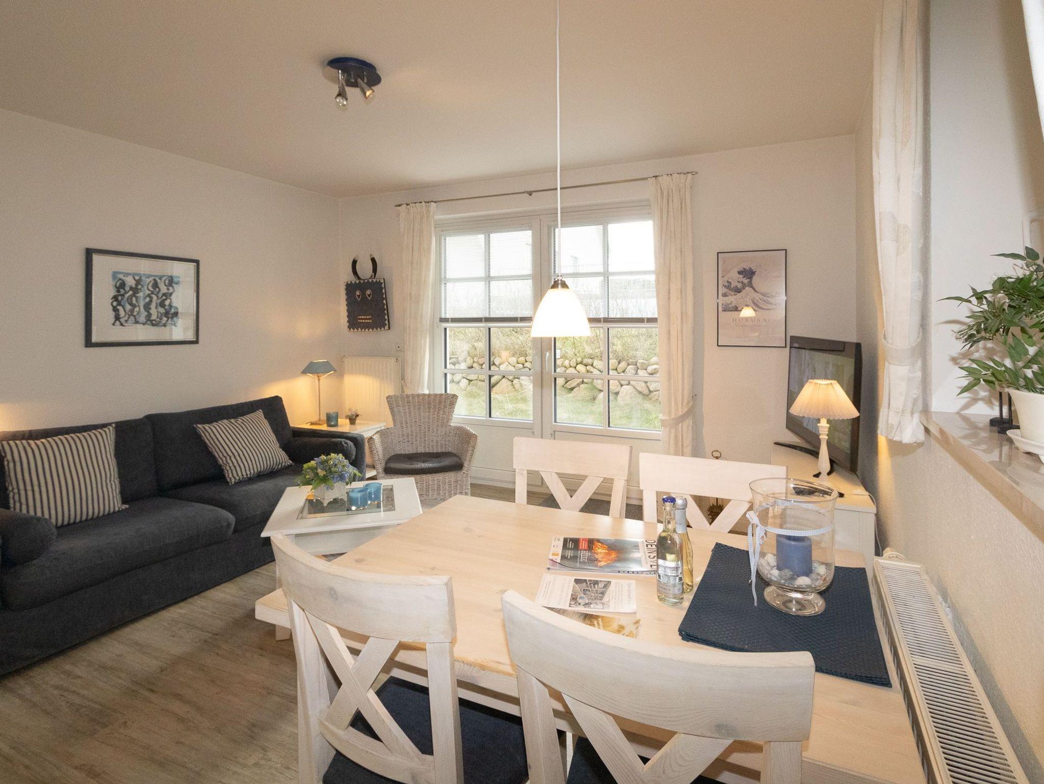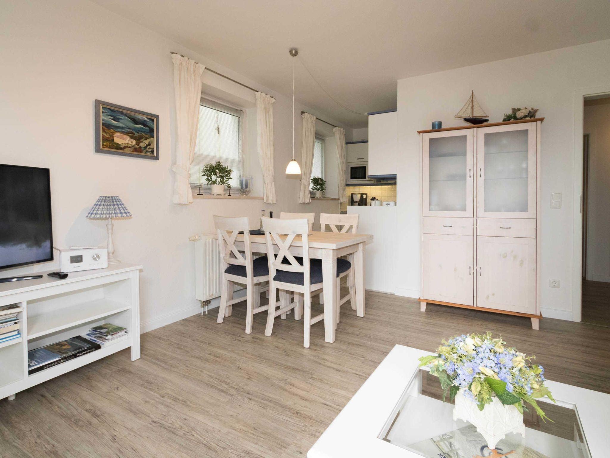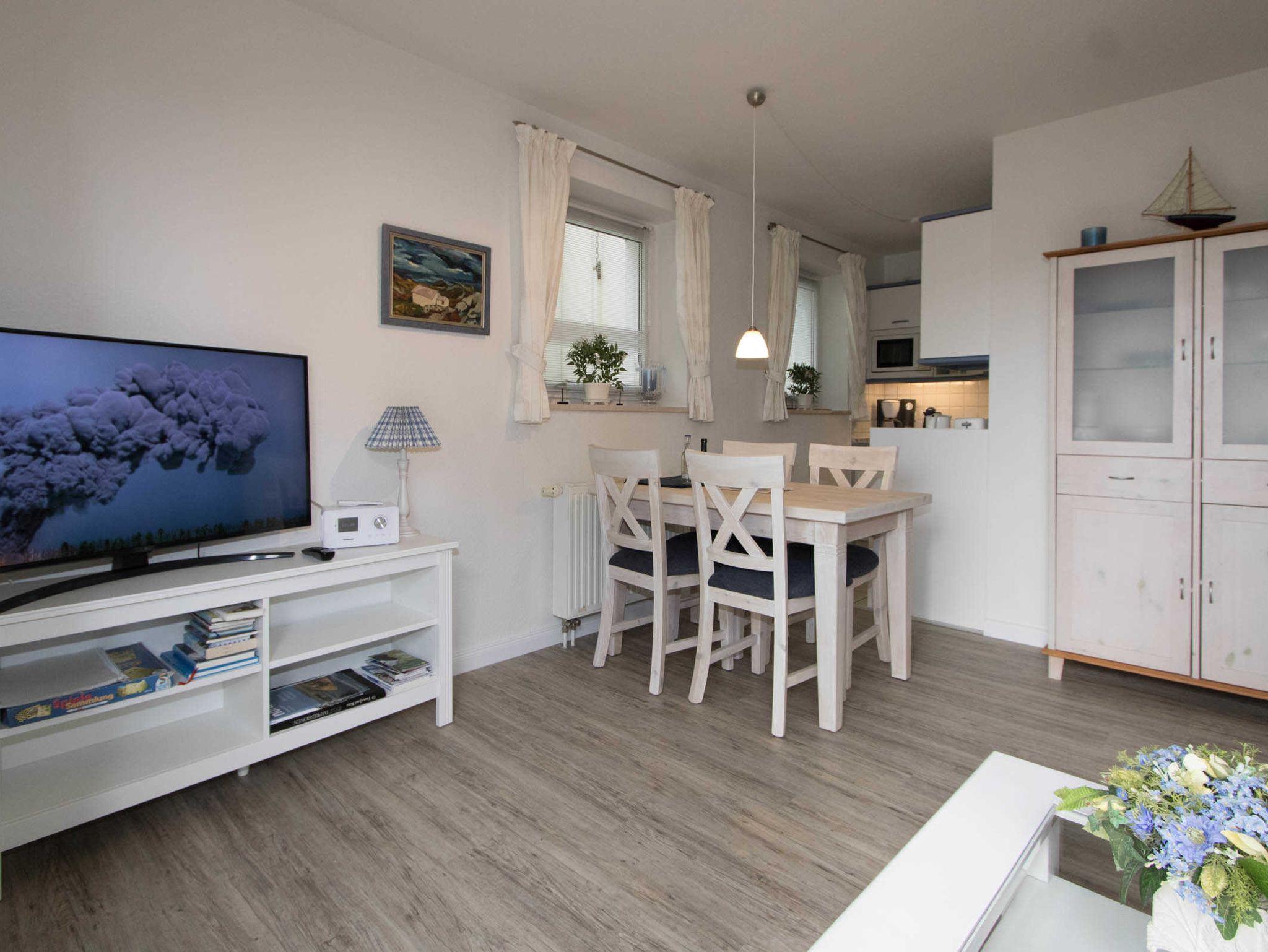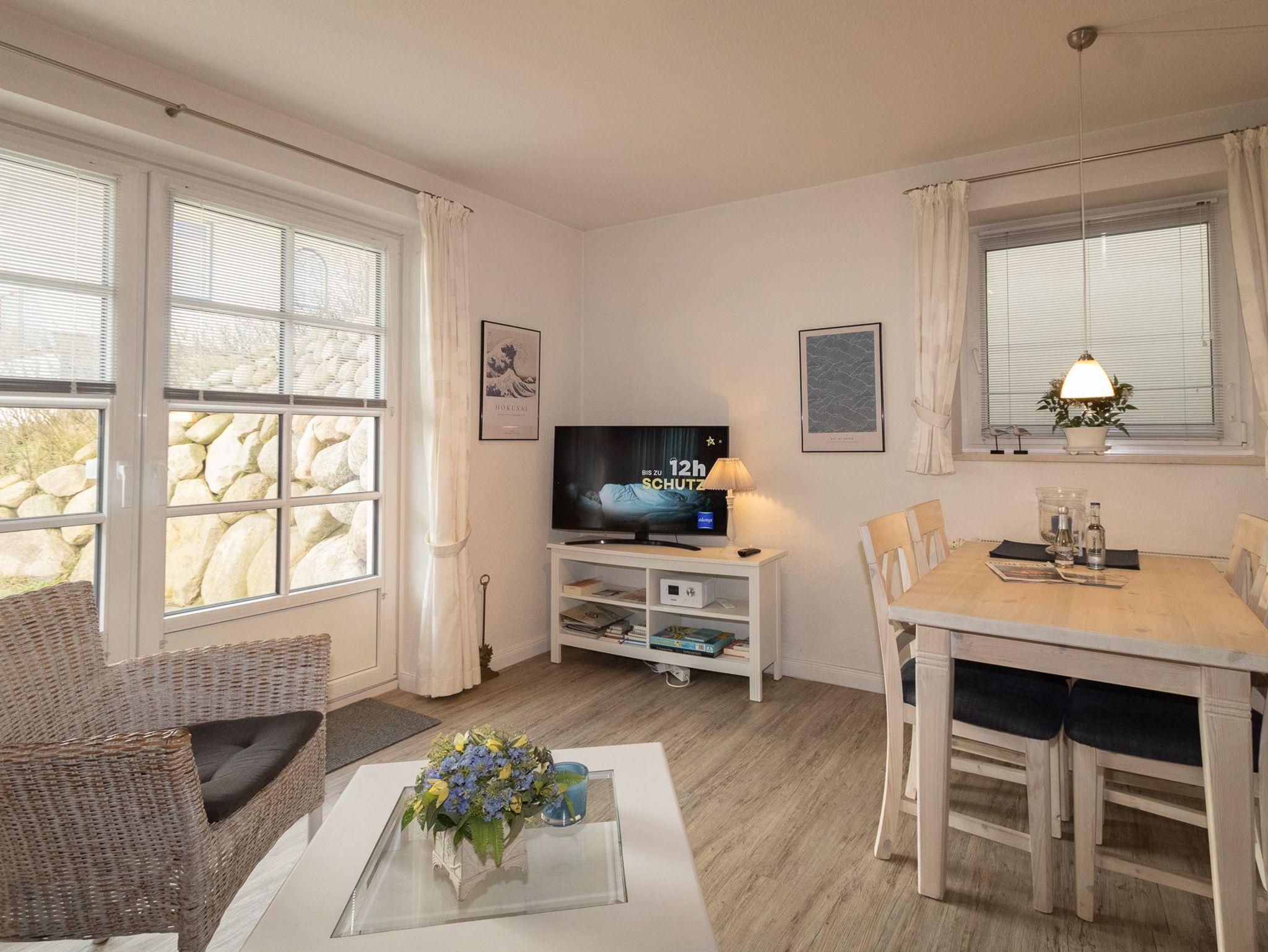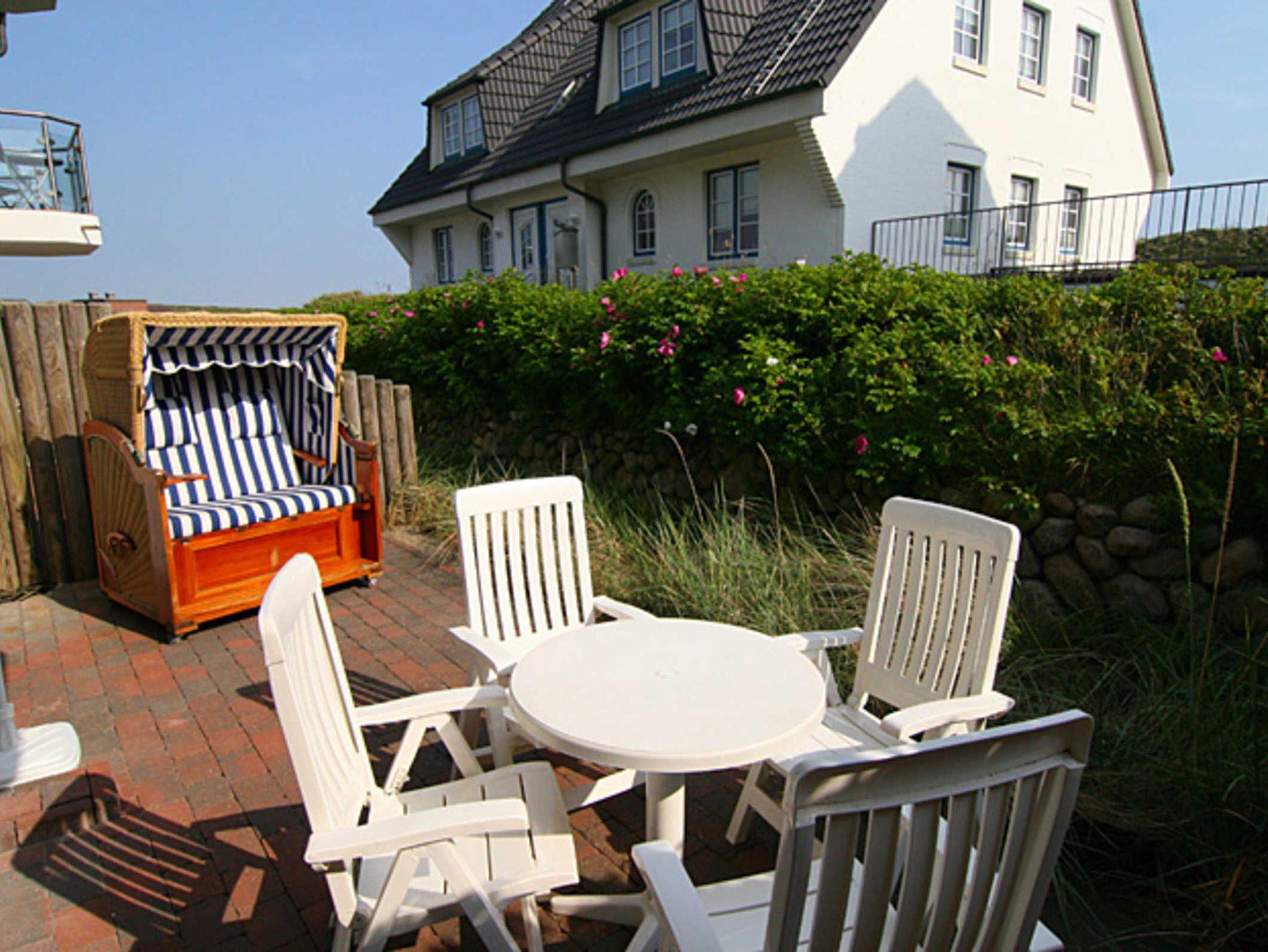 Sehr liebevoll und persönlich eingerichtete Ferienwohnung. Die großzügige, gepflegte Terrasse nach Süden ist mit einem Strandkorb und Gartenmöbeln ausgestattet. Umgeben von Dünengras und einem Friesenwall können Sie bei morgendlicher Sonne Ihr Frühstück geniessen. Urlaub, Ruhe und Erholung in absolut strandnaher Umgebung ist hier gegeben.