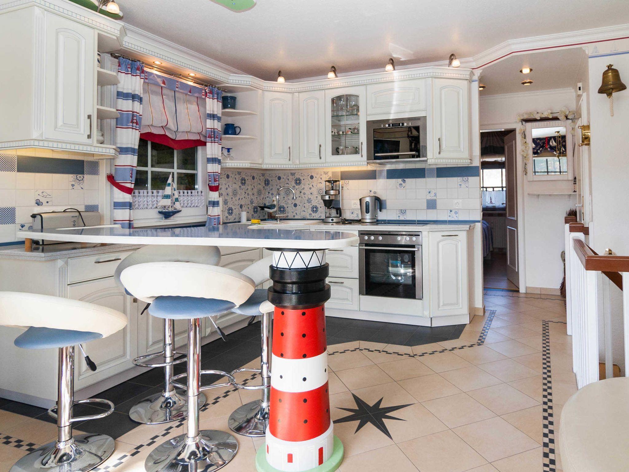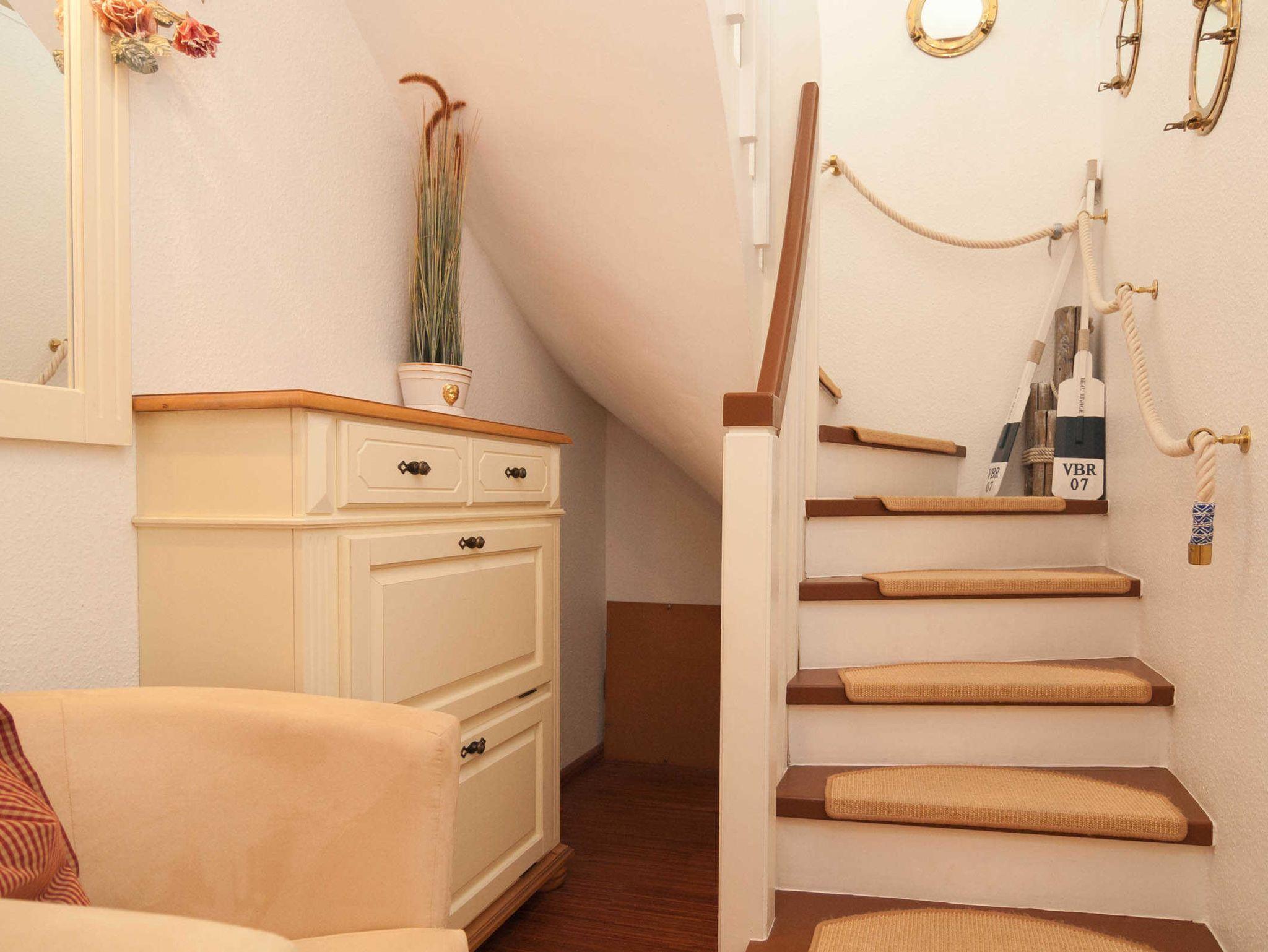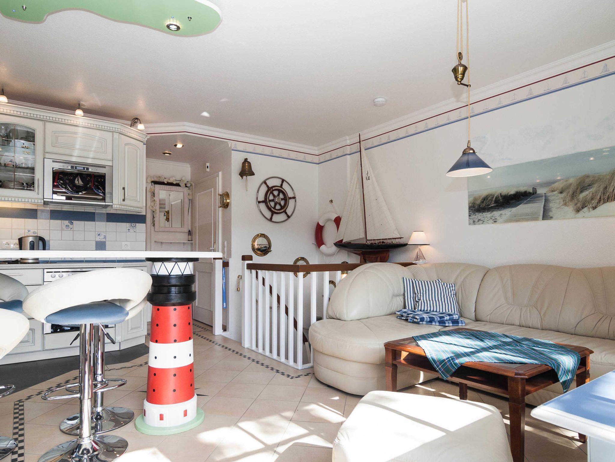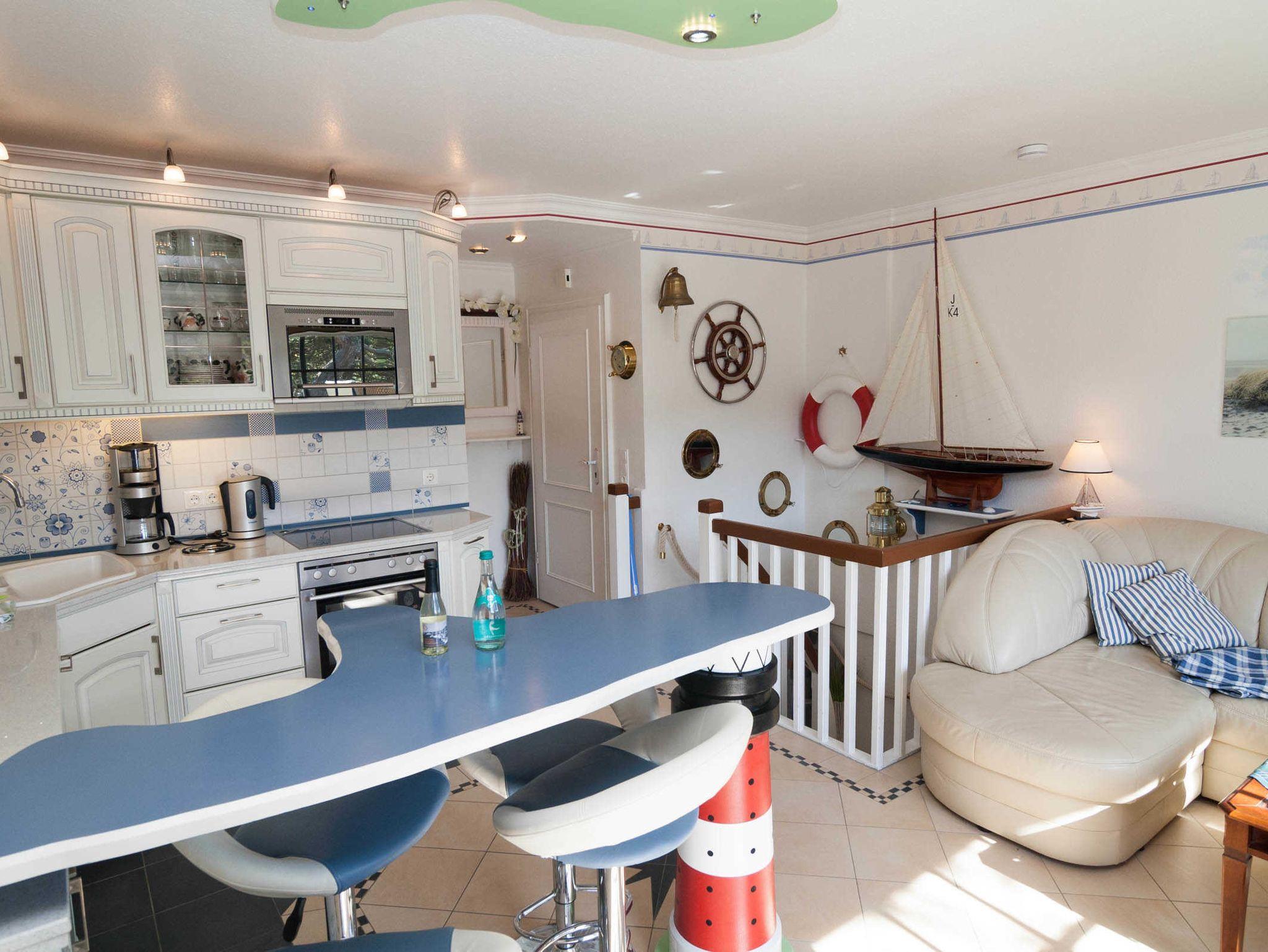 Die Ferienwohnung ist hell und maritim eingerichtet und bietet Platz für 2 Personen. Ein Badezimmer mit Dusche befindet sich im unteren Bereich der Wohnung. Das gemütliche Schlafzimmer befindet sich auf EG Ebene zusammen mit dem Wohnbereich und der großen Küche.