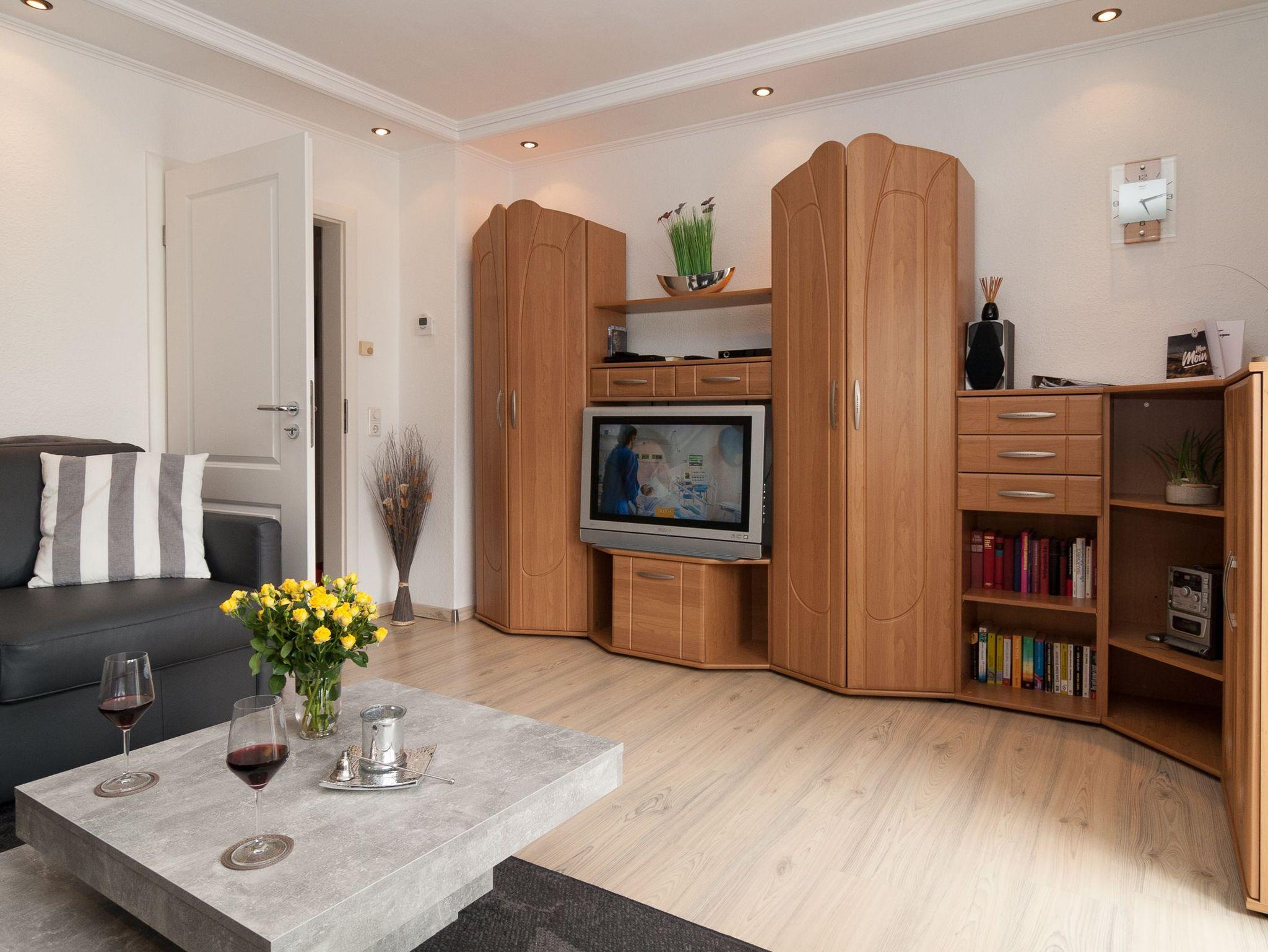 Die Wohnung liegt im Hochparterre und verfügt über ein Wohnzimmer, ein Schlafzimmer mit angrenzendem kleinem Ankleidezimmer, eine Küche mit Essecke und einem neuen Badezimmer. Das Doppelbett im Schlafzimmer ist 1,60m X 2,00m groß und verfügt über zwei Matratzen. Für die dritte und vierte Person befindet sich im Wohnzimmer eine Schlafcouch. Hier empfehlen wir entweder die Wohnung mit 3 Erwachsenen zu nutzen oder 2 Erwachsene und 2 Kinder. Alle Zimmer haben jeweils Außenjalousien vor den Fenstern. Vom Wohnzimmer aus gelangen Sie auf den Balkon mit Terrasse zum Süden.
