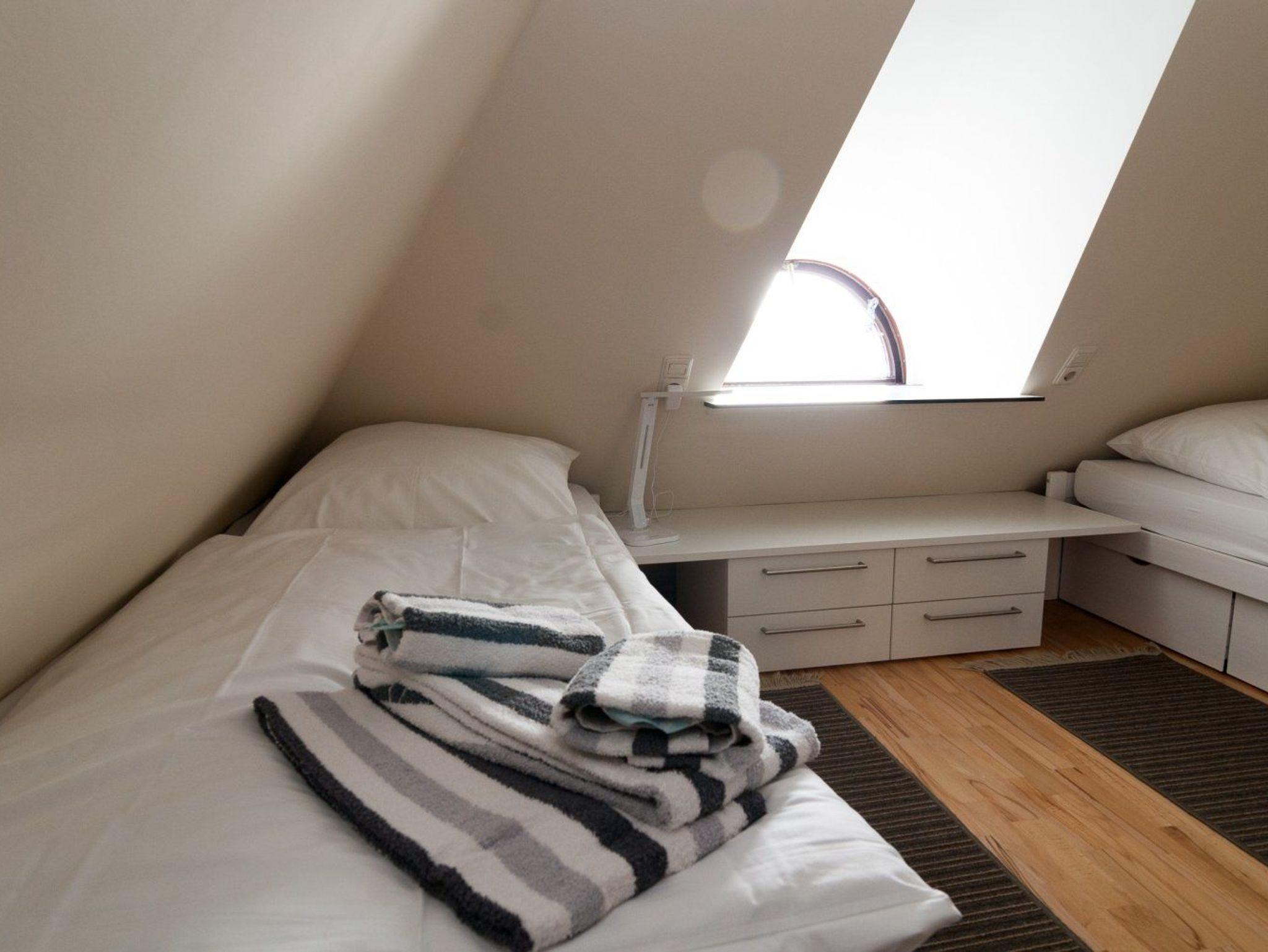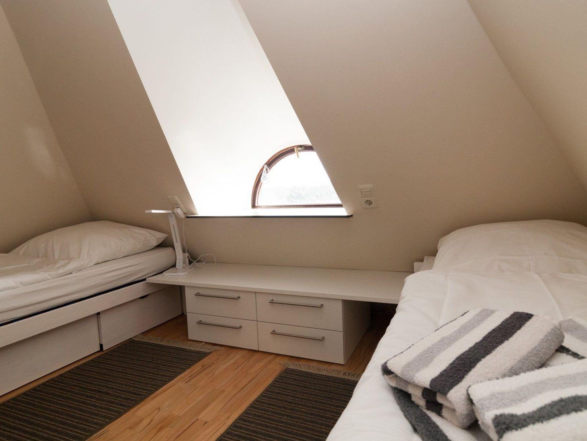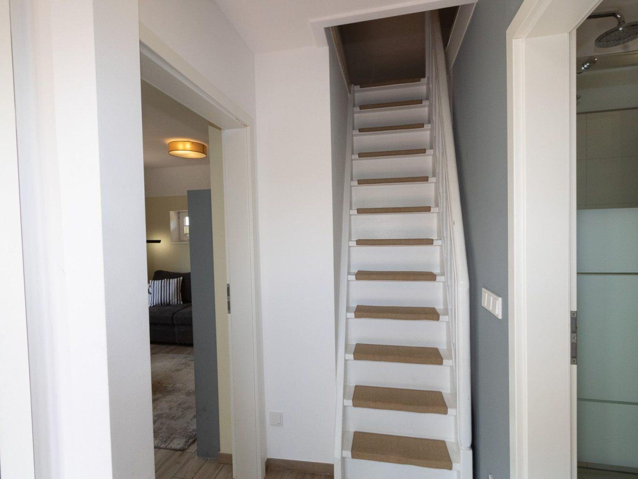 Das Schlafzimmer erreichen Sie über eine Treppe. Es ist mit zwei Einzelbetten ausgestattet.