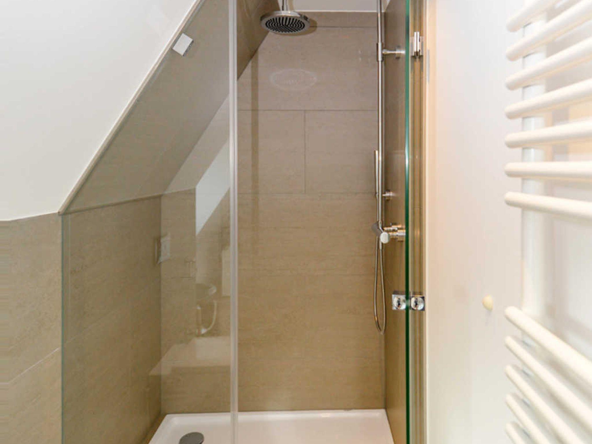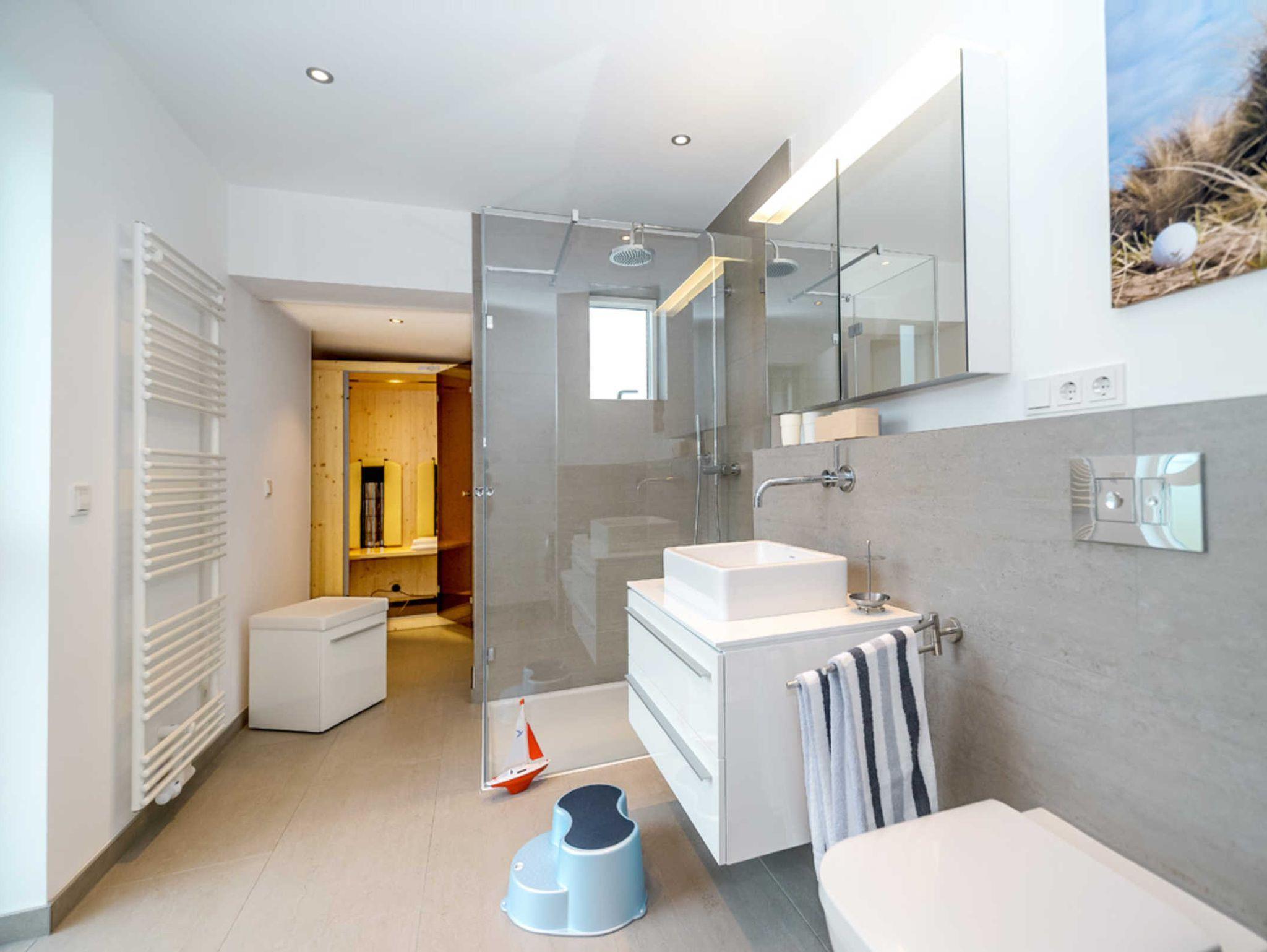 Die Küche ist vollständig für bis zu 6 Personen ausgestattet. Vom Essplatz aus schauen Sie direkt in den zum Süden liegenden Gartenbereich. Große Fensterfronten tragen zum großzügig wirkenden Innenbereich bei. Das Haus verfügt über 3 Schlafzimmer mit Doppelbetten. Im oberen Bereich befindet sich ein Duschbad mit Fußbodenheizung. Im EG liegt das zweite Duschbad von dem aus man in den Saunabereich gelangt. Das komplette Erdgeschoß verfügt über eine Fußbodenheizung.