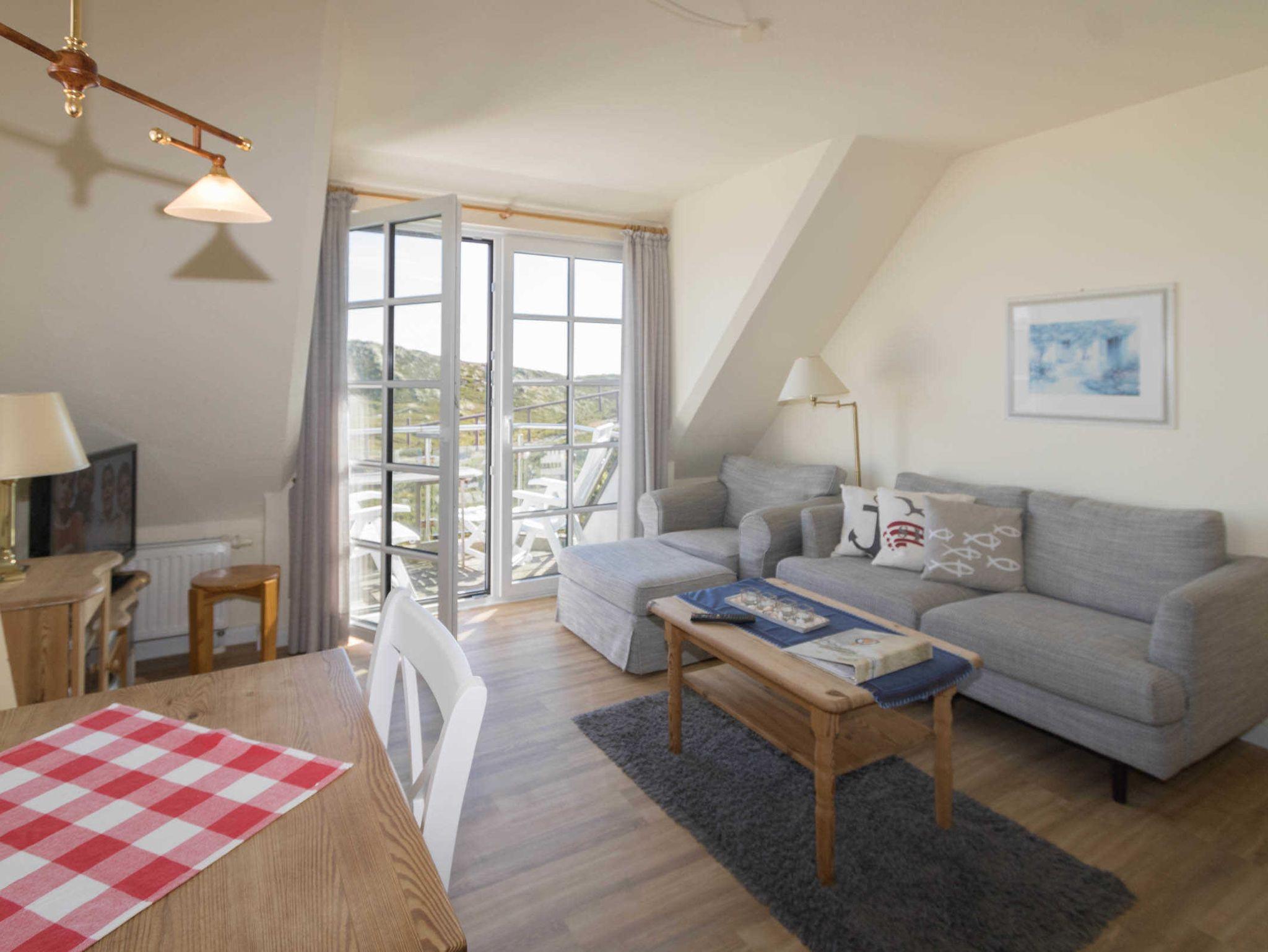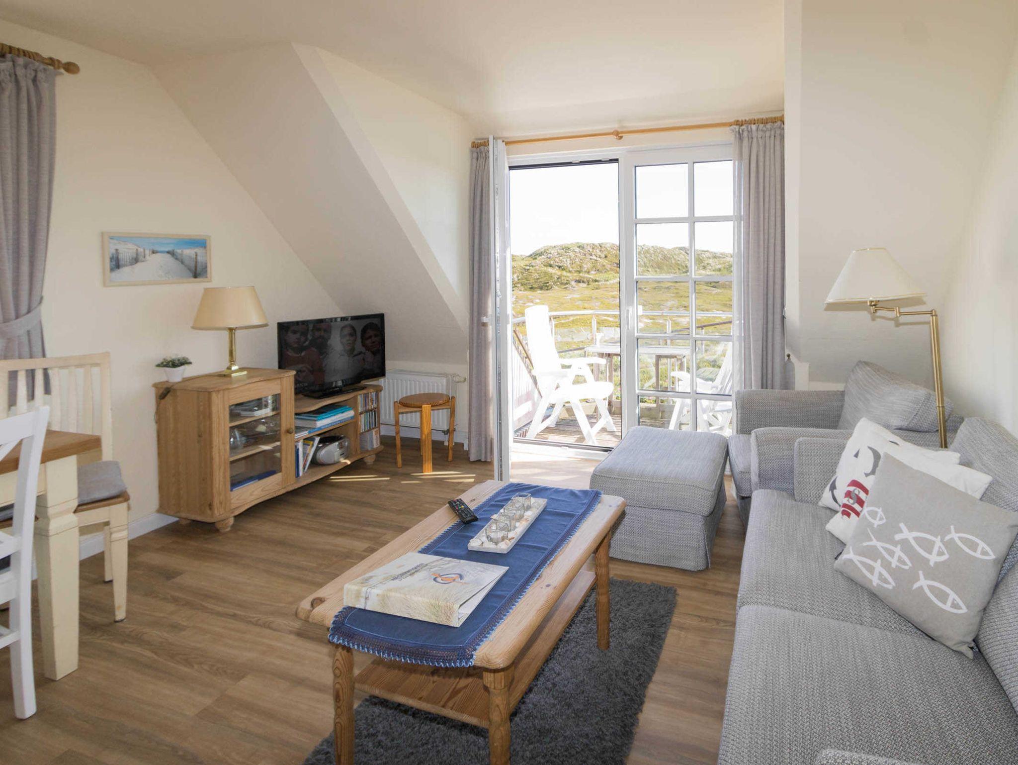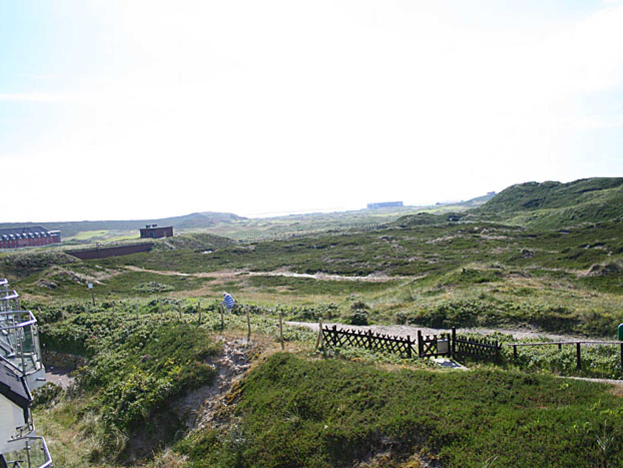 Genießen Sie den Panoramablick auf Golfplatz, Wattenmeer und Inseln in dieser komfortablen Wohnung mit Balkon nahe dem Strand.