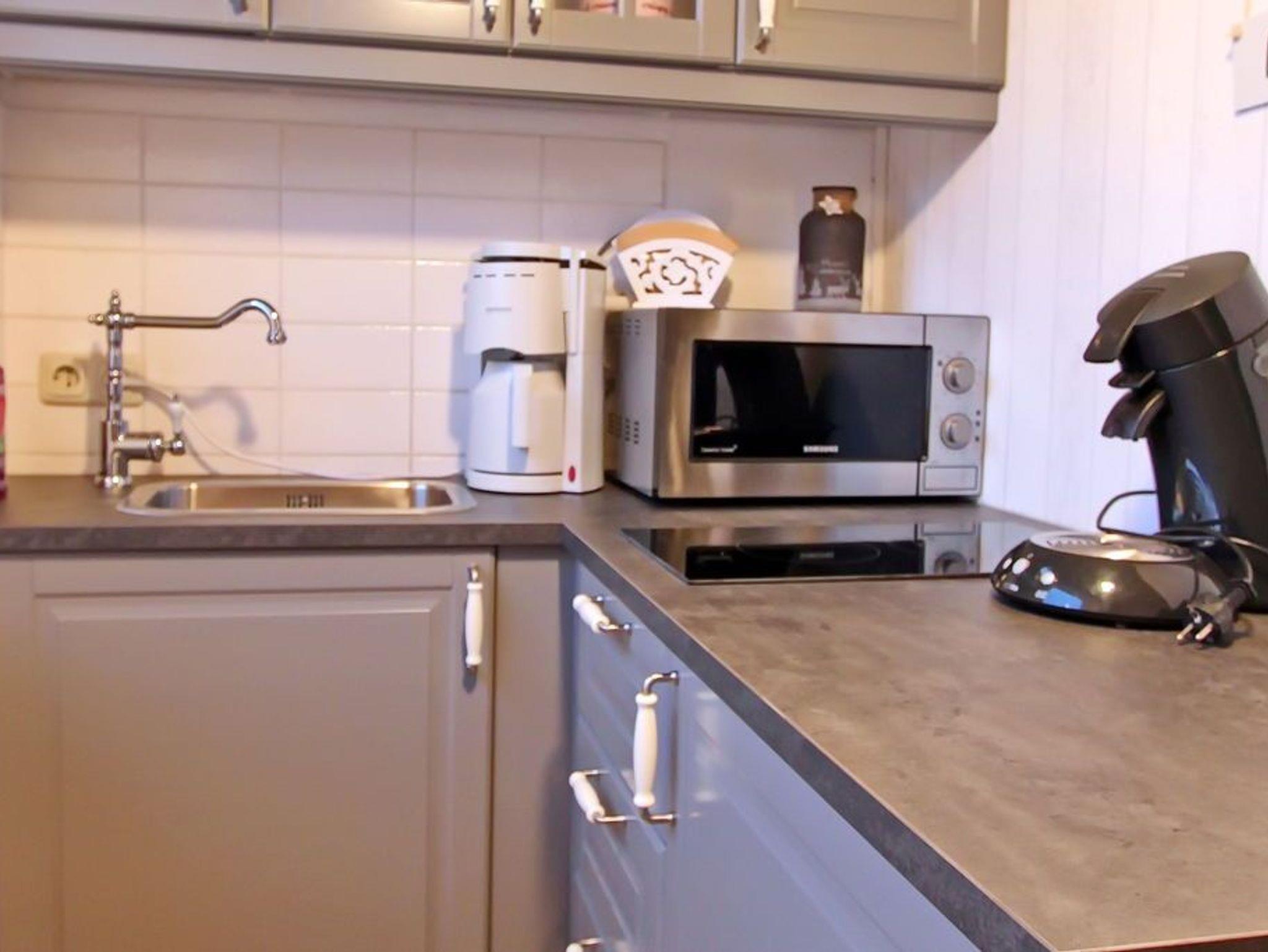 Die kleine Einbauküche verfügt über ein Cerankochfeld, Mikrowelle mit Grillfunktion, Kühlschrank mit kleinem Gefrierfach und allen Utensilien, die Sie benötigen, um sich selbst zu versorgen. An einem Esstisch mit zwei Stühlen können Sie Ihre Mahlzeiten einnehmen. Der Flur ist mit einer Garderobe und einem großen Einbauschrank eingerichtet, der genug Stauraum bietet. Von dort gelangen Sie in das Duschbad mit WC. Im kompletten Appartement wurde Designfußbodenbelag verlegt. Viele, aufeinander abgestimmte, maritime Accessoires runden das Gesamtbild ab. Ein PKW-Stellplatz (Nr. 21) vor dem Haus gehört ebenfalls dazu. Sie haben im Wirtschaftsraum die Möglichkeit, Ihre Wäsche zu waschen und ggf. zu trockenen (mit Münzzähler).