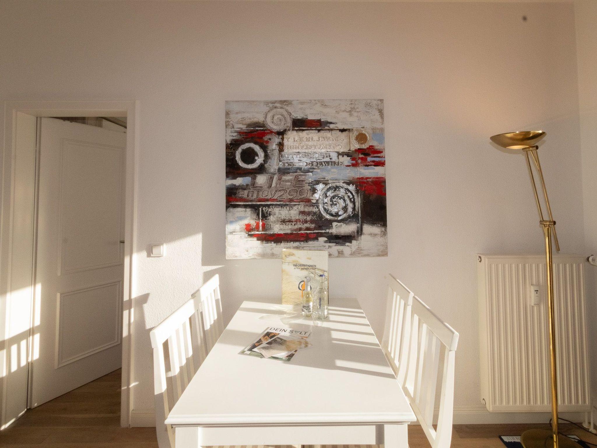 Die hell eingerichtete Ferienwohnung hat einen Wohn-/Schlafraum mit einer Schlafcouch (für 3. und 4.Person) und einen Esstisch sowie einen Fernseher für die gemütlichen Abende. In der offenen Einbauküche mit Geschirrspüler können Sie nach Herzenslust kochen. Das seperate Schlafzimmer befindet sich im hinteren Teil der Ferienwohnung. Nachttische, ein Regalschrank, ein Vitrinenschrank und ein Kleiderschrank bieten ausreichend Stauraum.