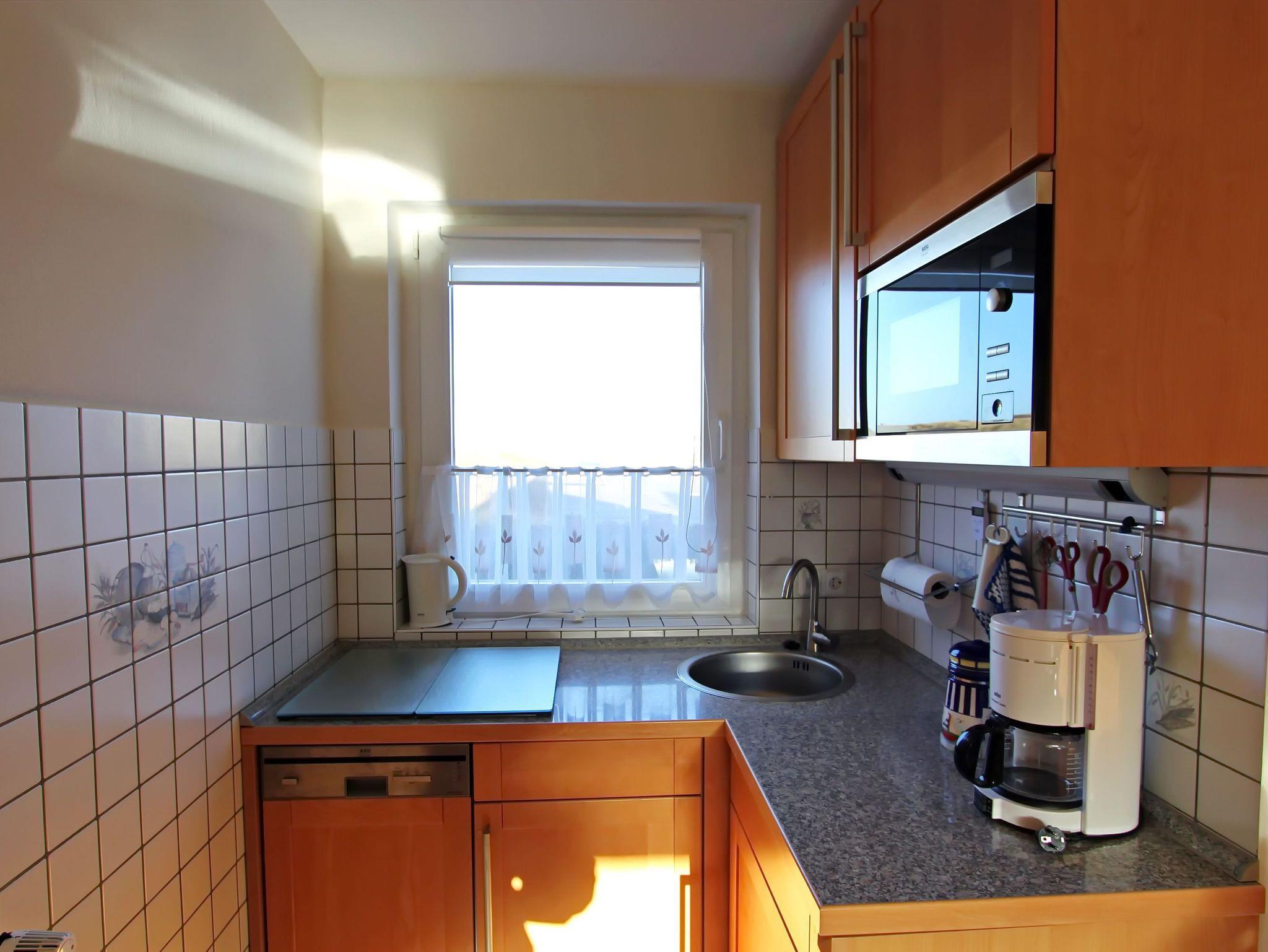 Geschirrschrank, Essplatz für 4 Personen, direkter Zugang zur Südterrasse mit Strandkorb