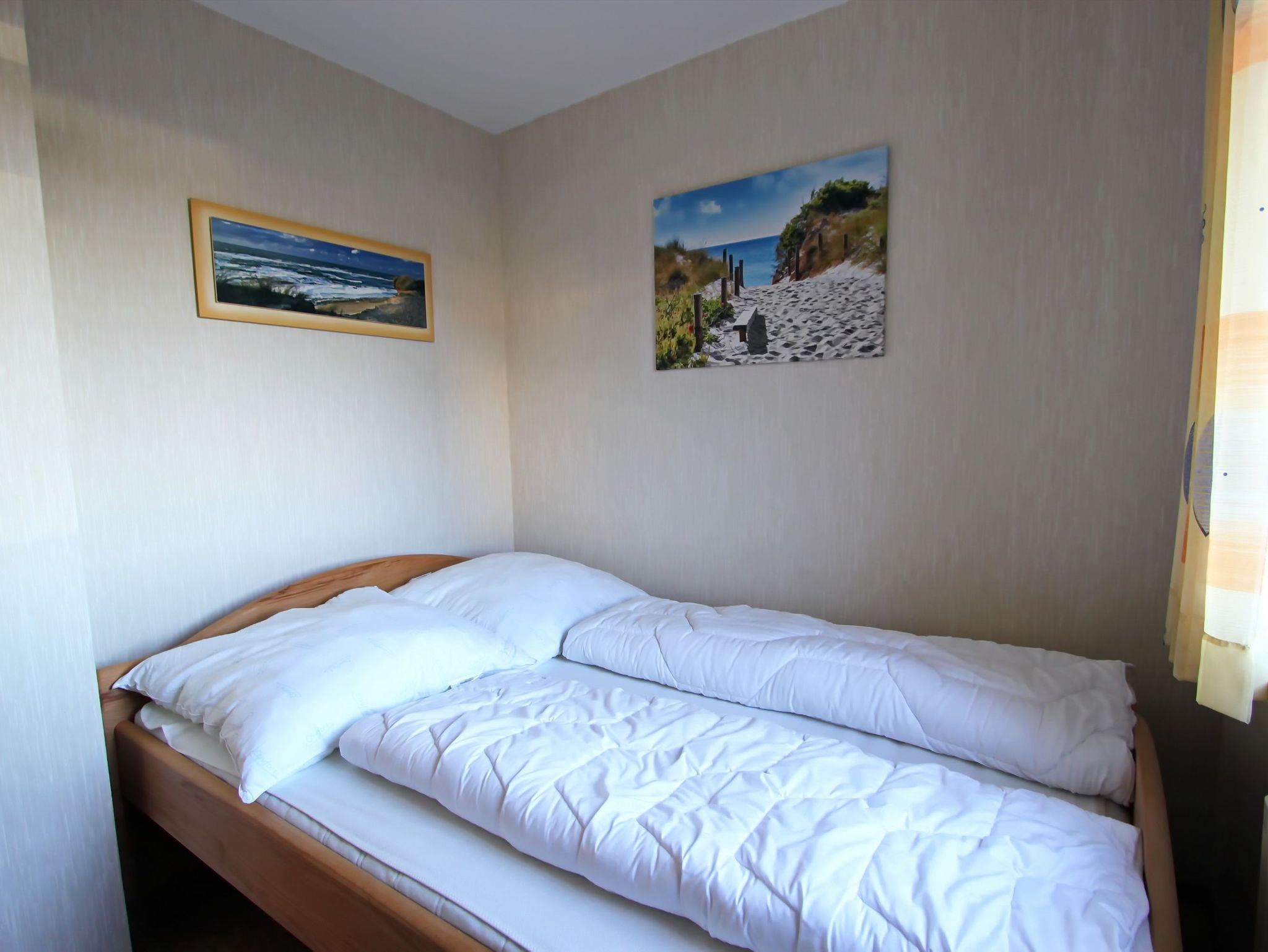 Im kleinen Zimmer befindet sich ein Doppelbett, ca 1,40 m breit, Ablageflächen, sowie ein