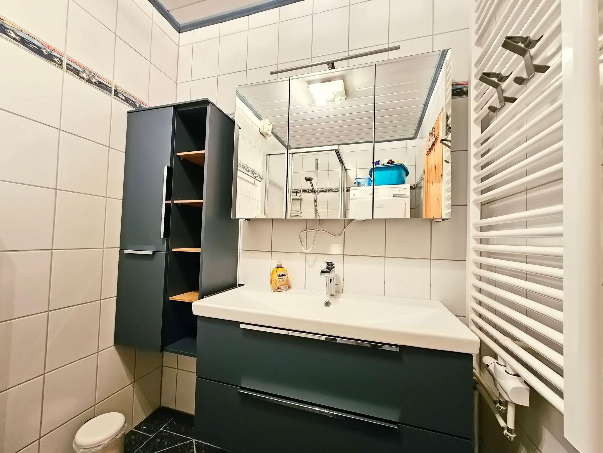 auf eine wandgroße Fototapete mit Nordsee-Motiv! Duschbad/WC mit Waschtisch und Schränken,