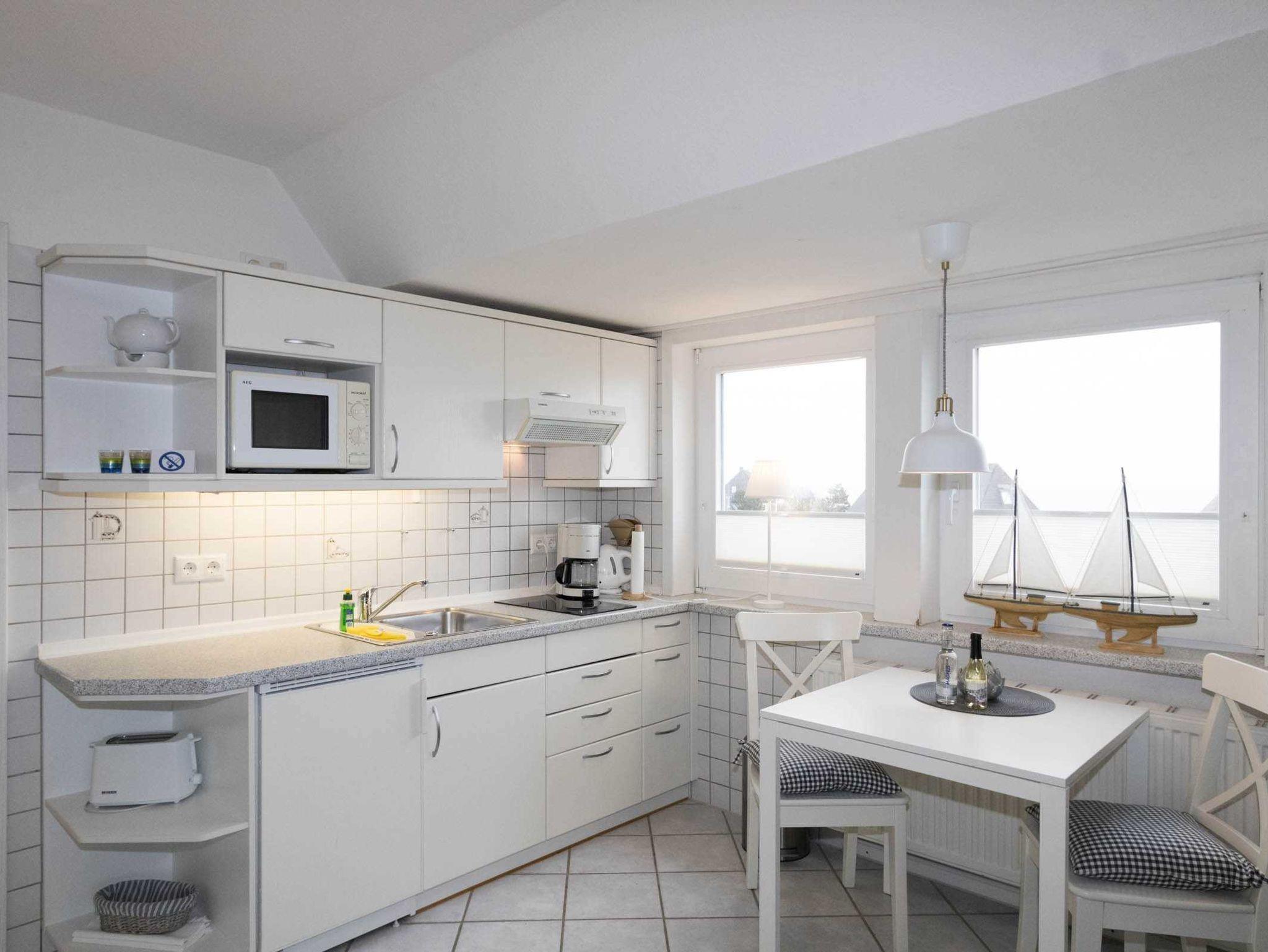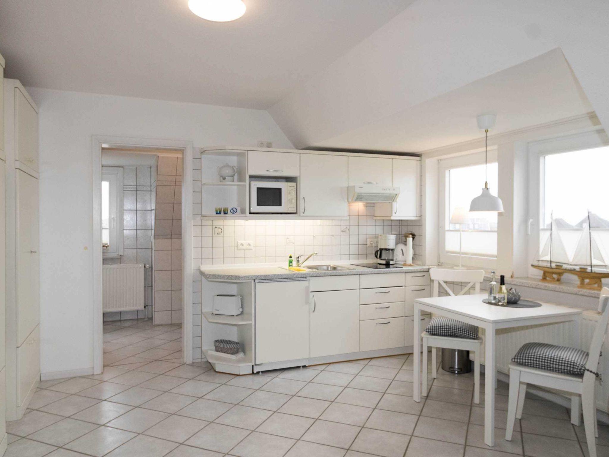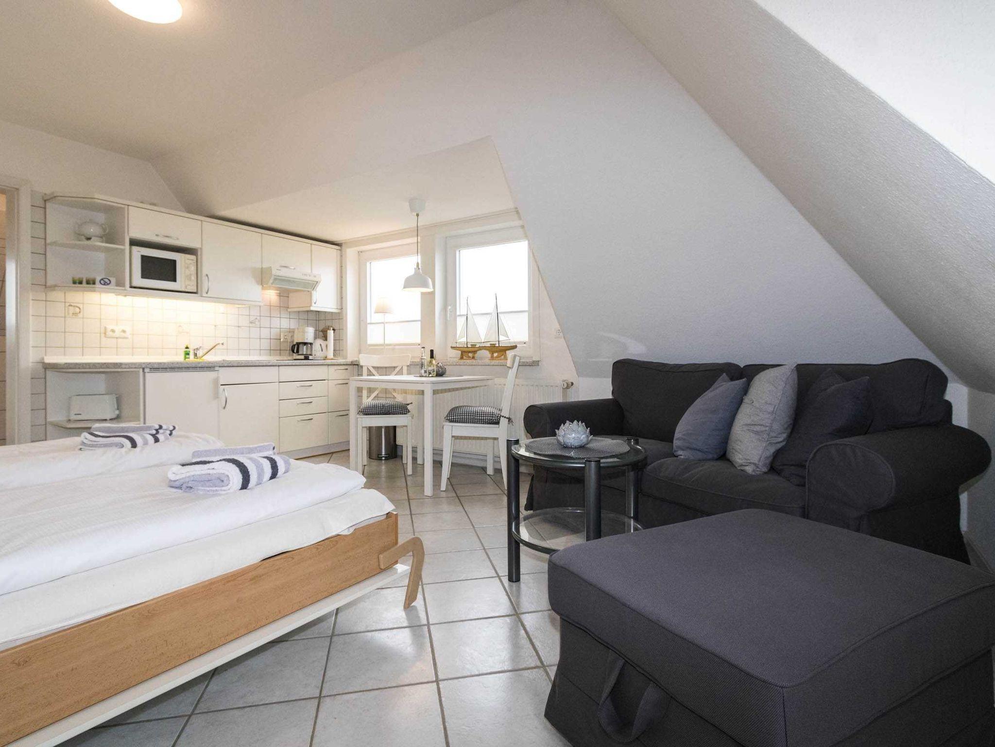 Die kleine, gemütliche Wohnung ist in einen kombinierten Wohn-/Schlafraum mit Schrankbett und Küchenzeile sowie ein sep. Duschbad aufgeteilt. Die Wohnung ist auch ideal für Alleinreisende geeignet, da sich das Schrankbett einzeln aufklappen lässt. Die Küchenzeile verfügt über einen 2-Platten-Herd, eine Mikrowelle und einen Kühlschrank mit Gefrierfach.