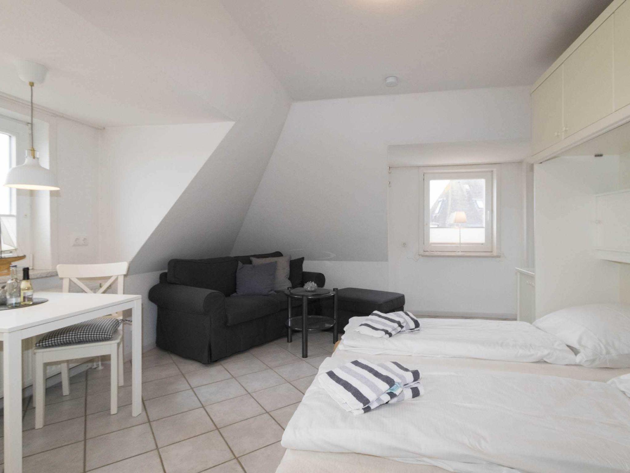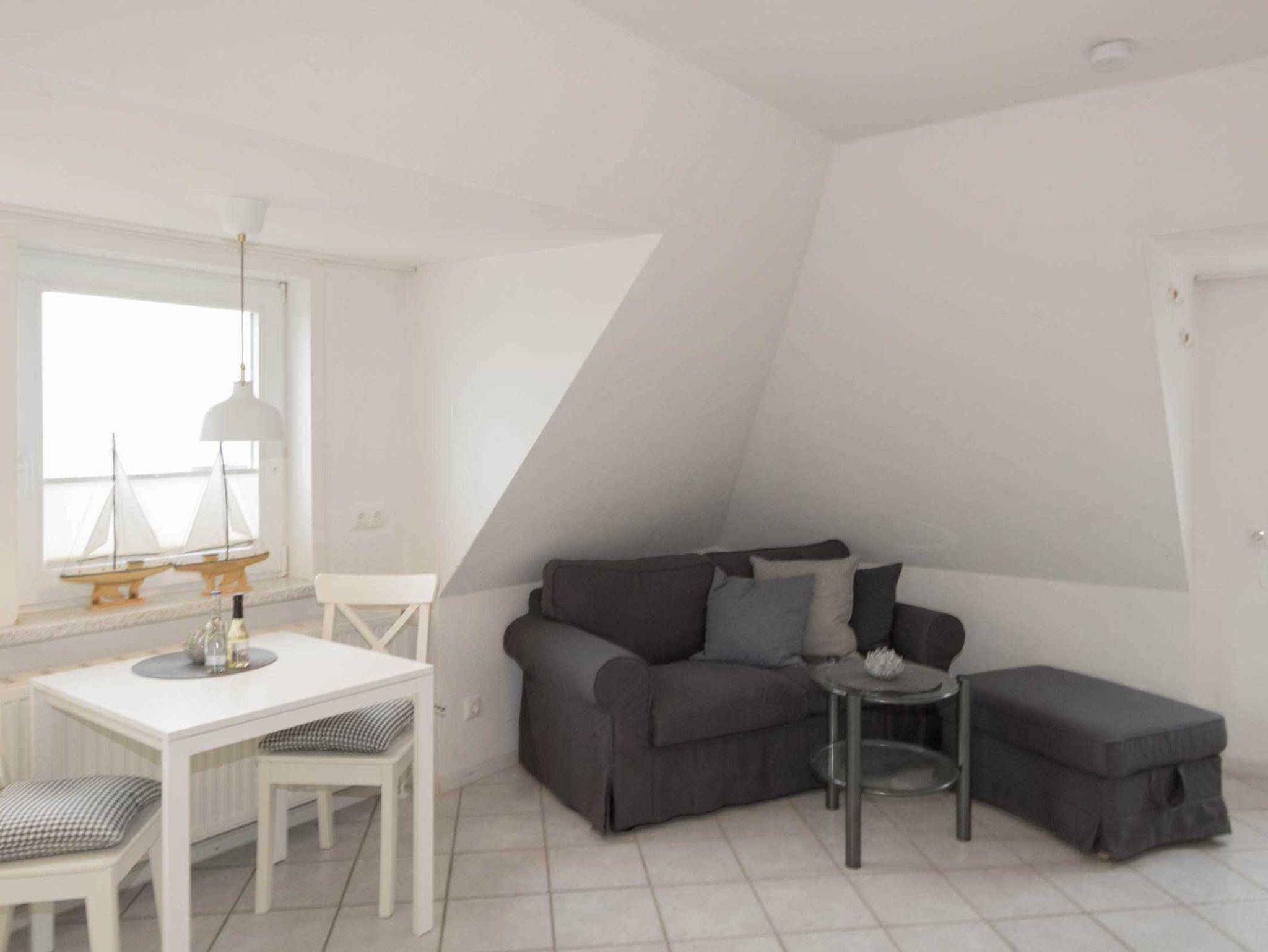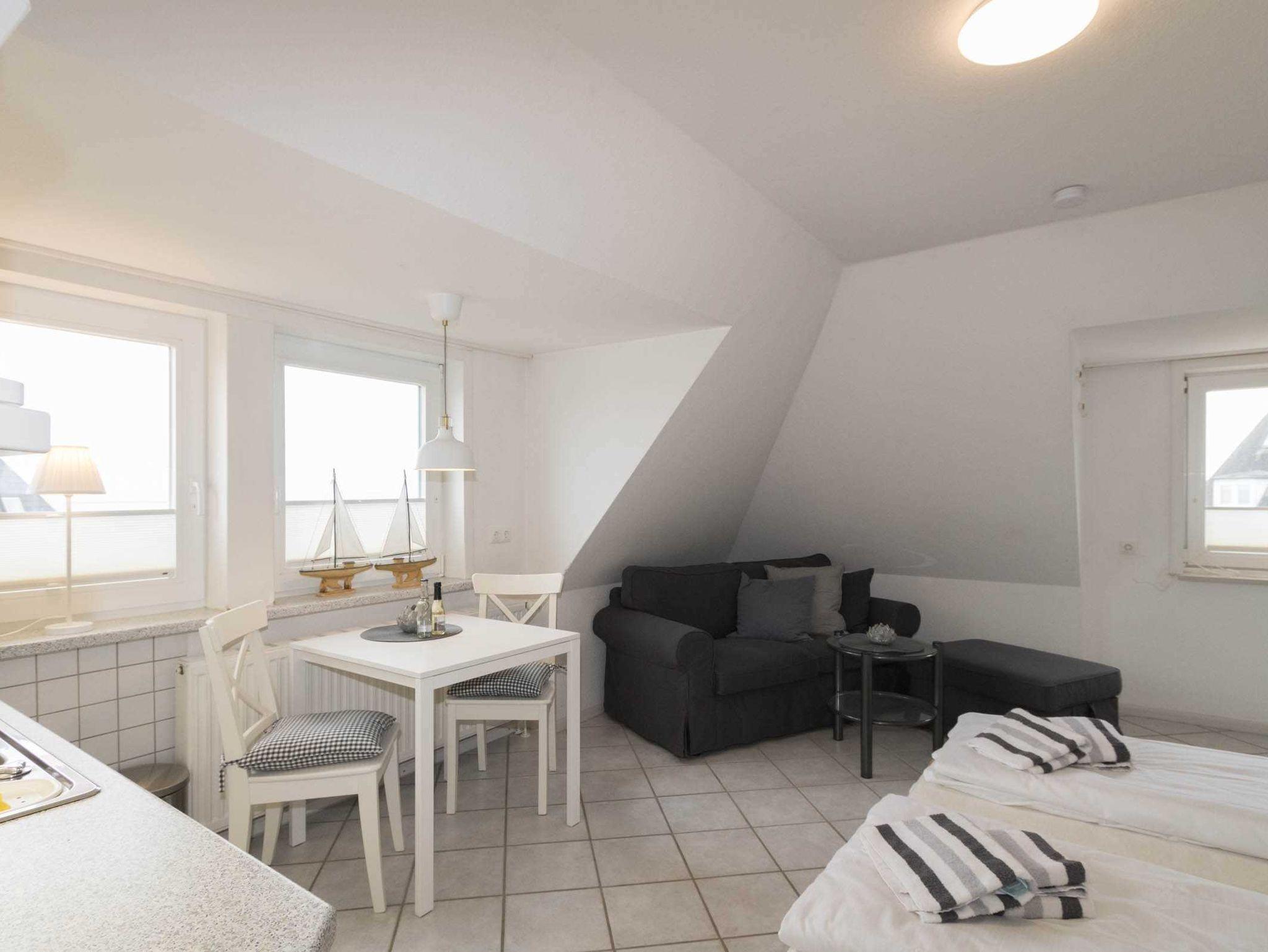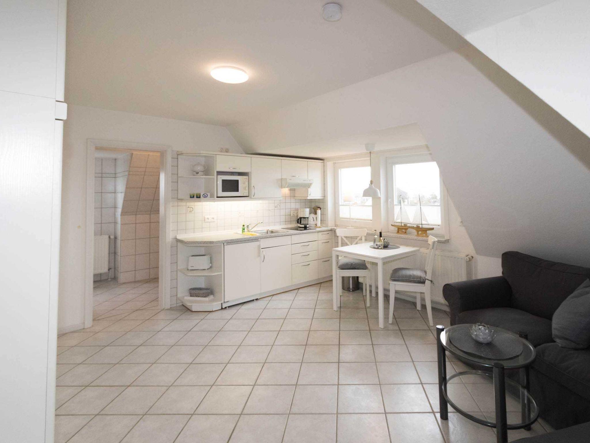 Die kleine, gemütliche Wohnung ist in einen kombinierten Wohn-/Schlafraum mit Schrankbett und Küchenzeile sowie ein sep. Duschbad aufgeteilt. Die Wohnung ist auch ideal für Alleinreisende geeignet, da sich das Schrankbett einzeln aufklappen lässt. Die Küchenzeile verfügt über einen 2-Platten-Herd, eine Mikrowelle und einen Kühlschrank mit Gefrierfach.
