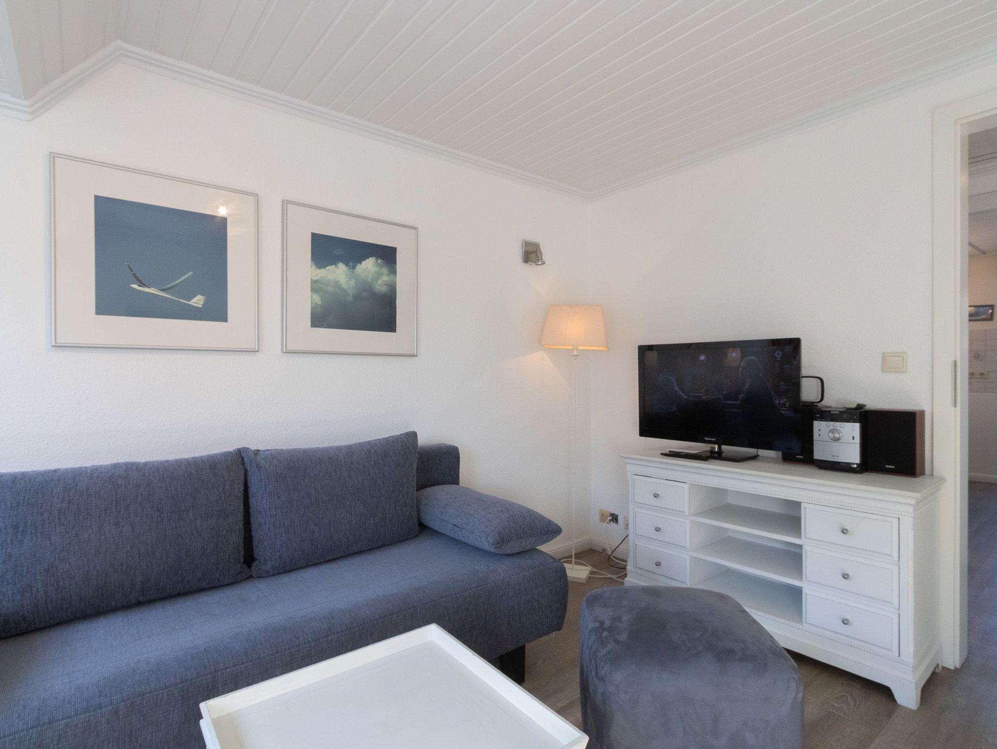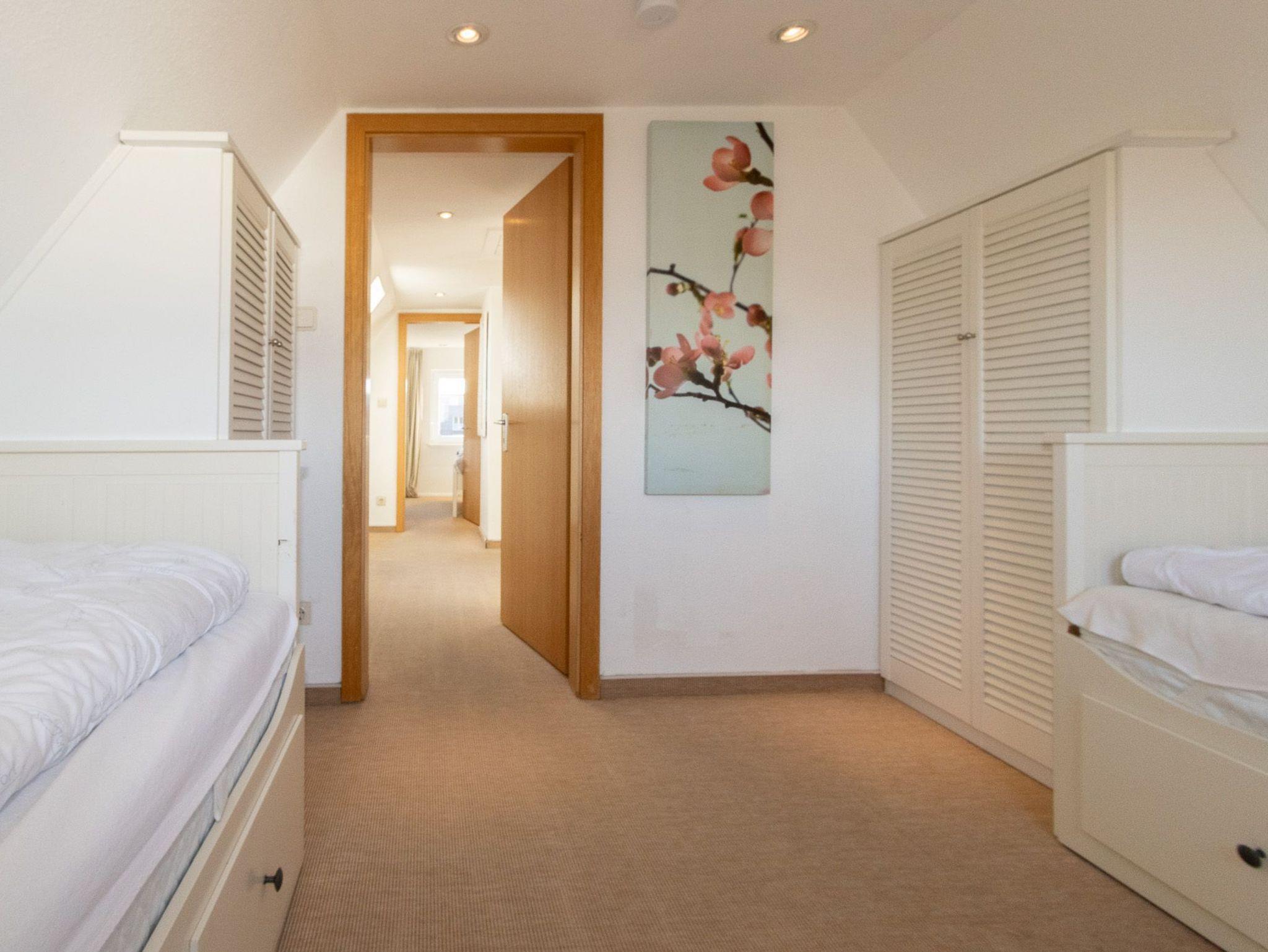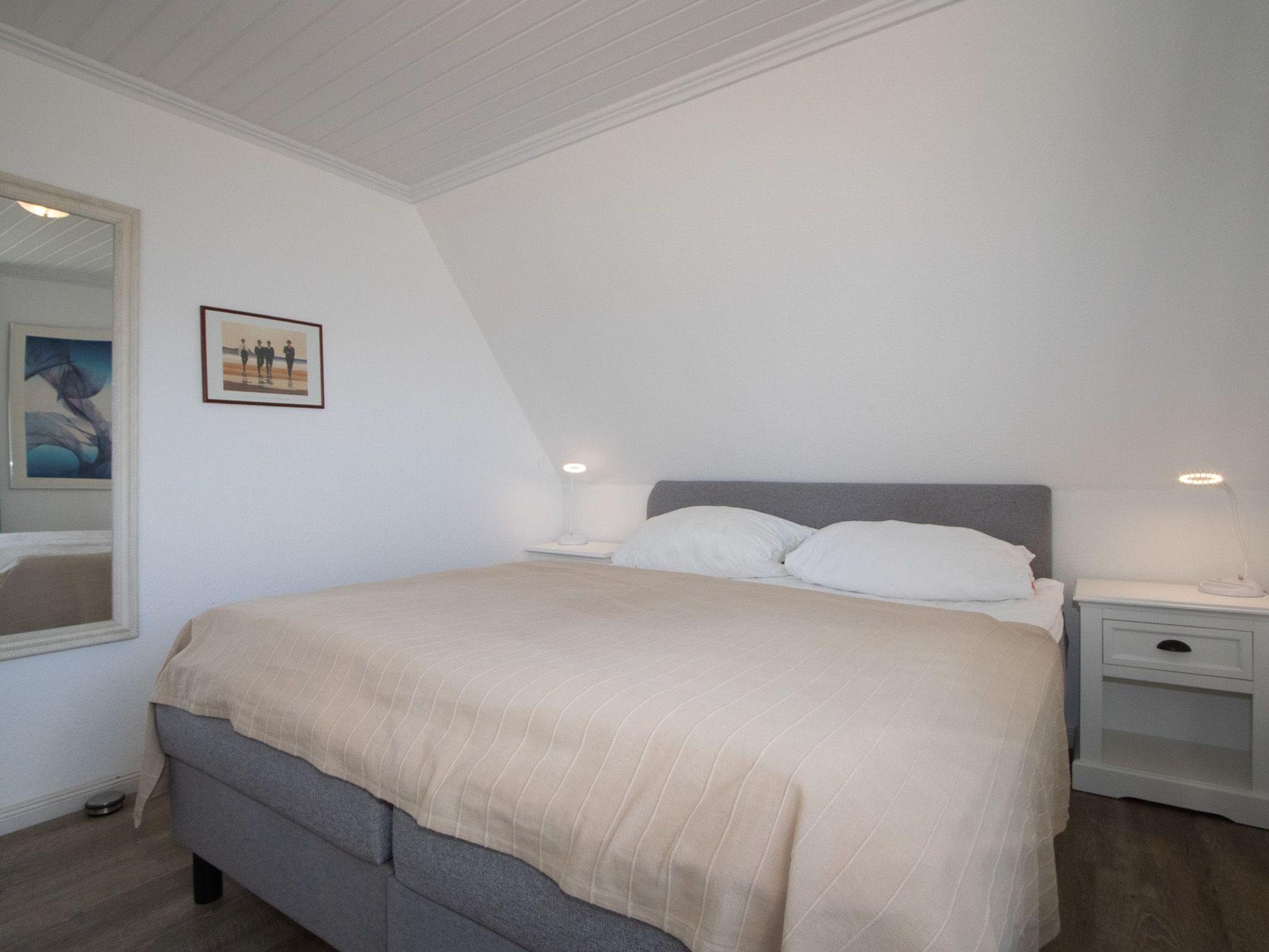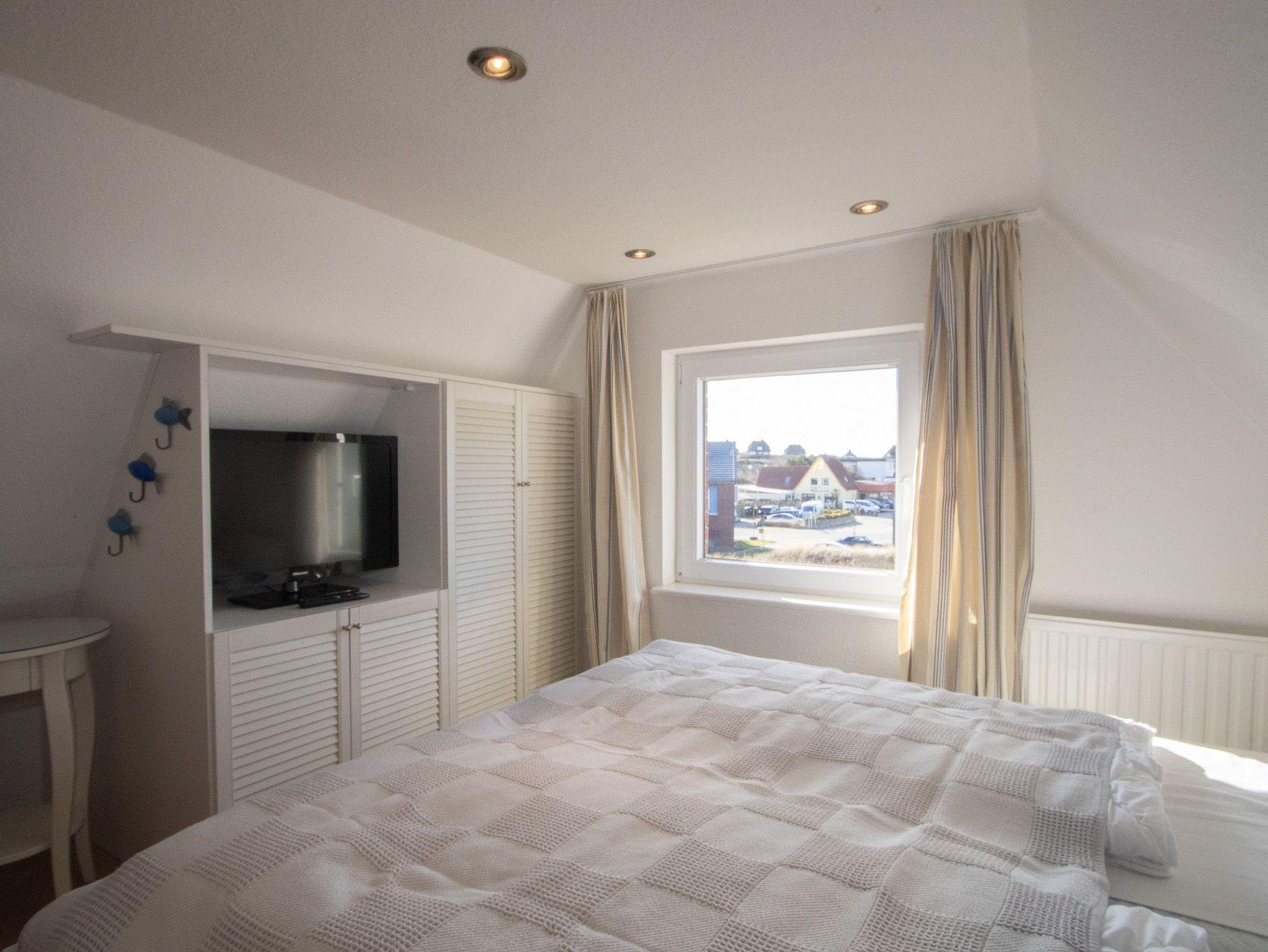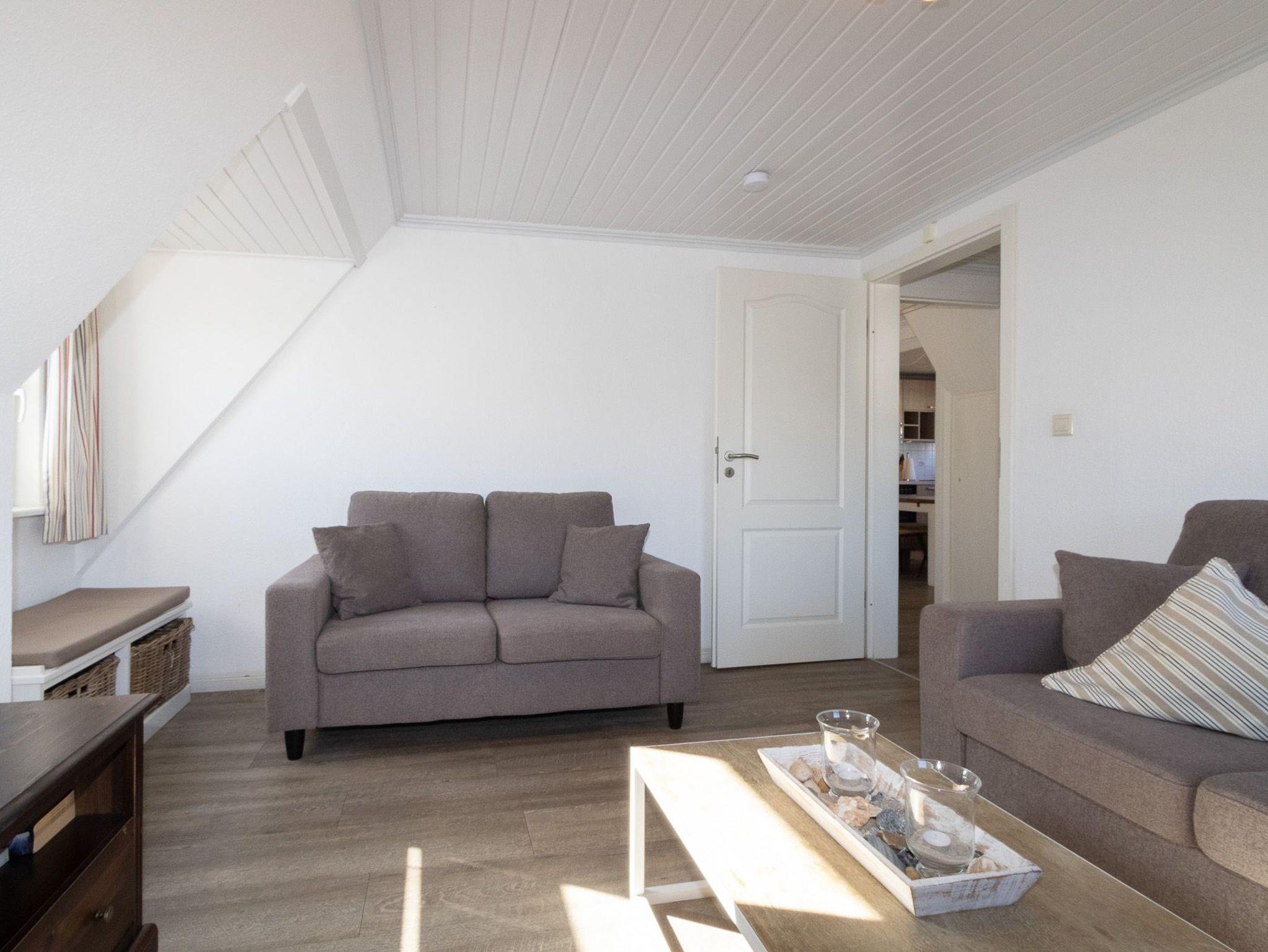 Gepflegtes 5 Zi.-Appartement über OG/DG mit ca. 100 m²; im OG: 1 Wohnzimmer mit Schlafcouch, Tisch, Sidebord und Sat-TV; 1 Schlafzimmer mit Doppelbett und Sat-TV, Ankleidezimmer, Duschbad/WC; 1 Wohnzimmer mit Doppelschlafcouch, Tisch, Couch und Sat-TV; 1 Badezimmer mit Eckbadewanne und WC; Flur mit Gardrobe; separate Einbauküche mit Ceranfeld, Backofen, Mikrowelle, Geschirrspüler, Essplatz für 8 Personen, Radio mit CD-Player, Zugang zur Ost-/Westterrasse mit Bestuhlung; steile Treppe ins DG: 1 Duschbad; 1 separates WC; 1 Schlafzimmer mit Doppelbett und Sat-TV; ein Schlafzimmer mit zwei Einzelbetten.